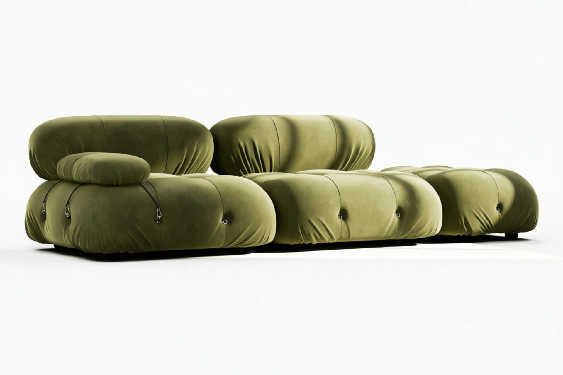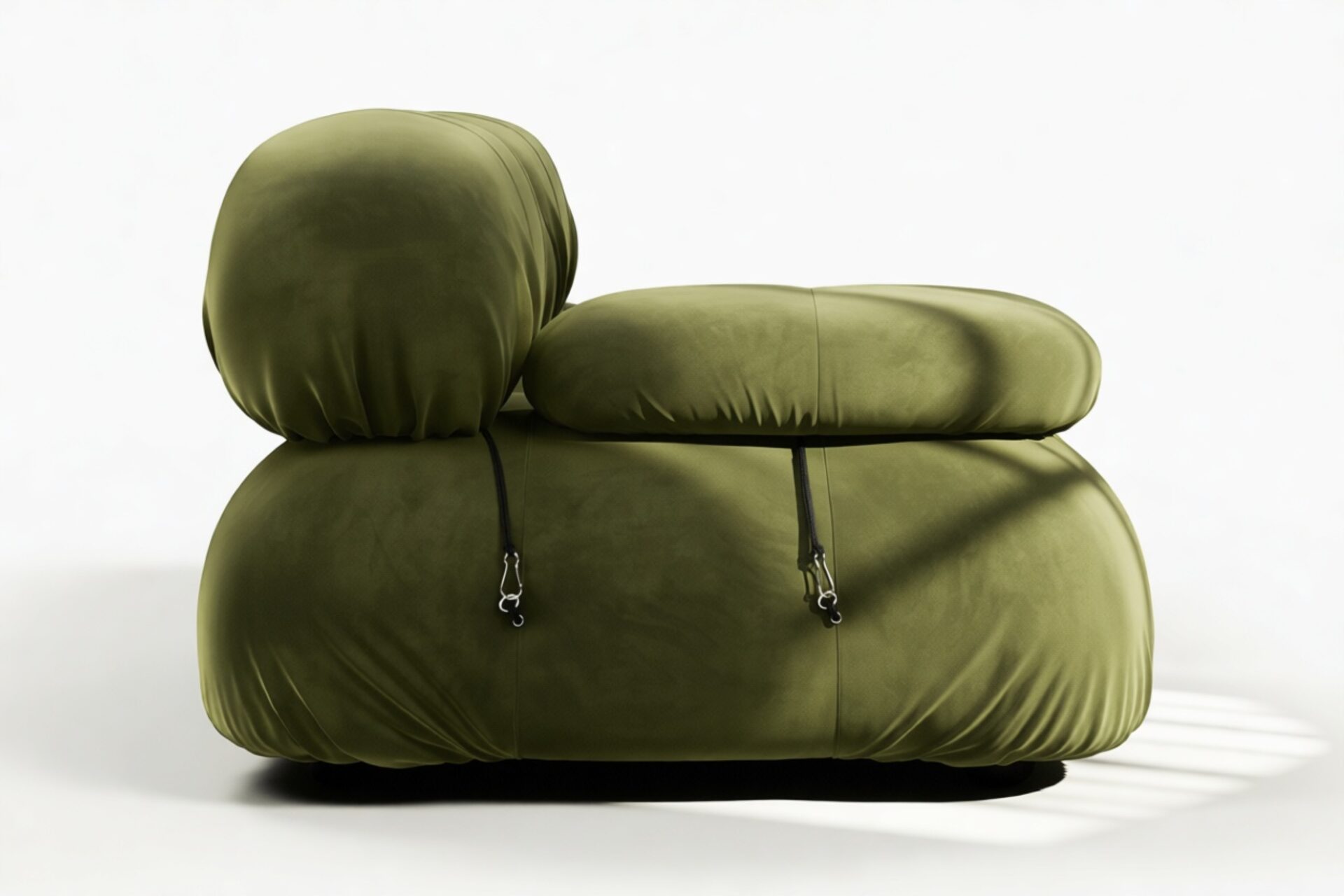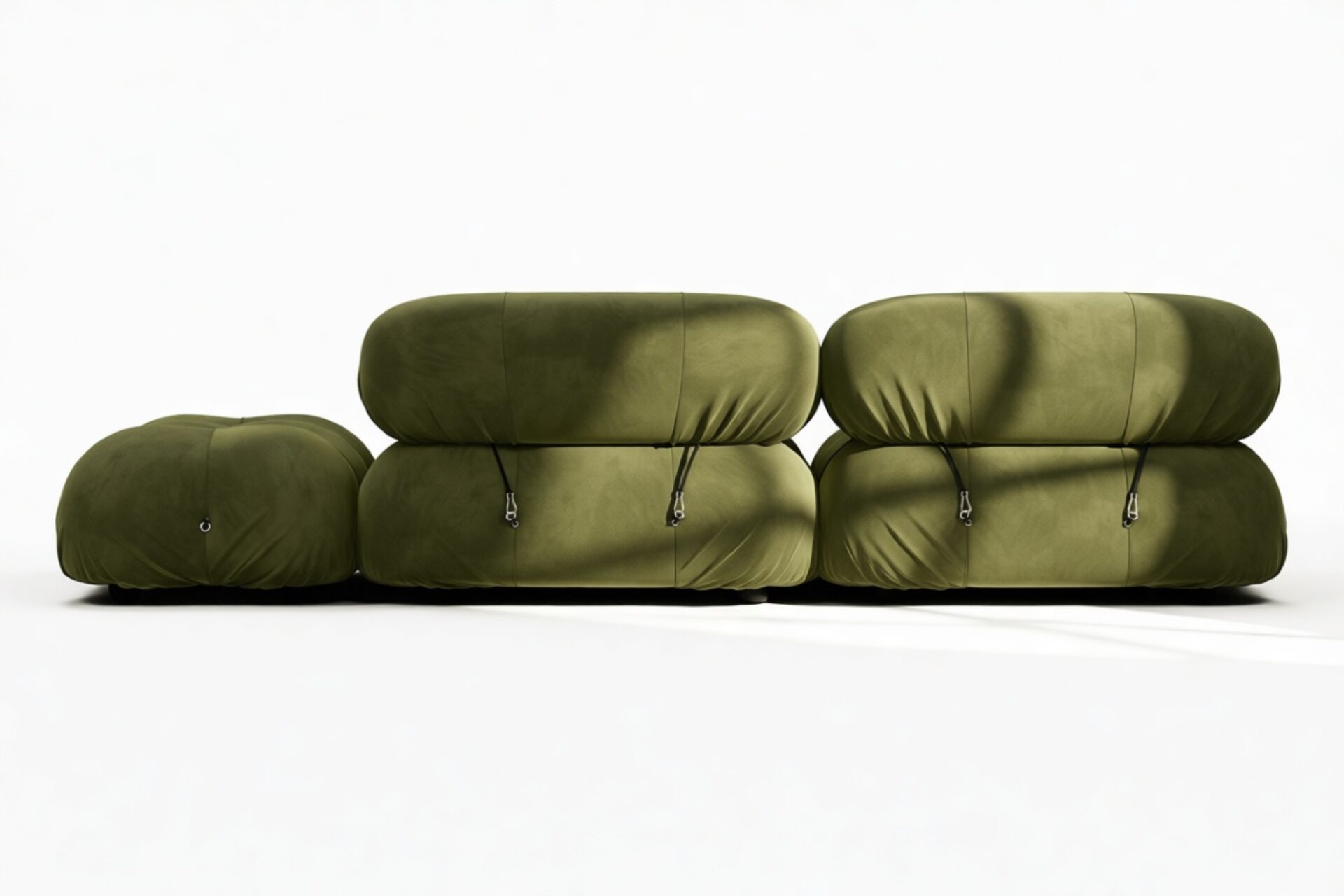 - Modular Instructions: Each section of the Mario Bellini Sofa is modular and is attached with string ties and carabiners. To assemble or rearrange your sofa, simply unclip the carabiners from one ring and attach to a corresponding ring on the module you wish to connect to.