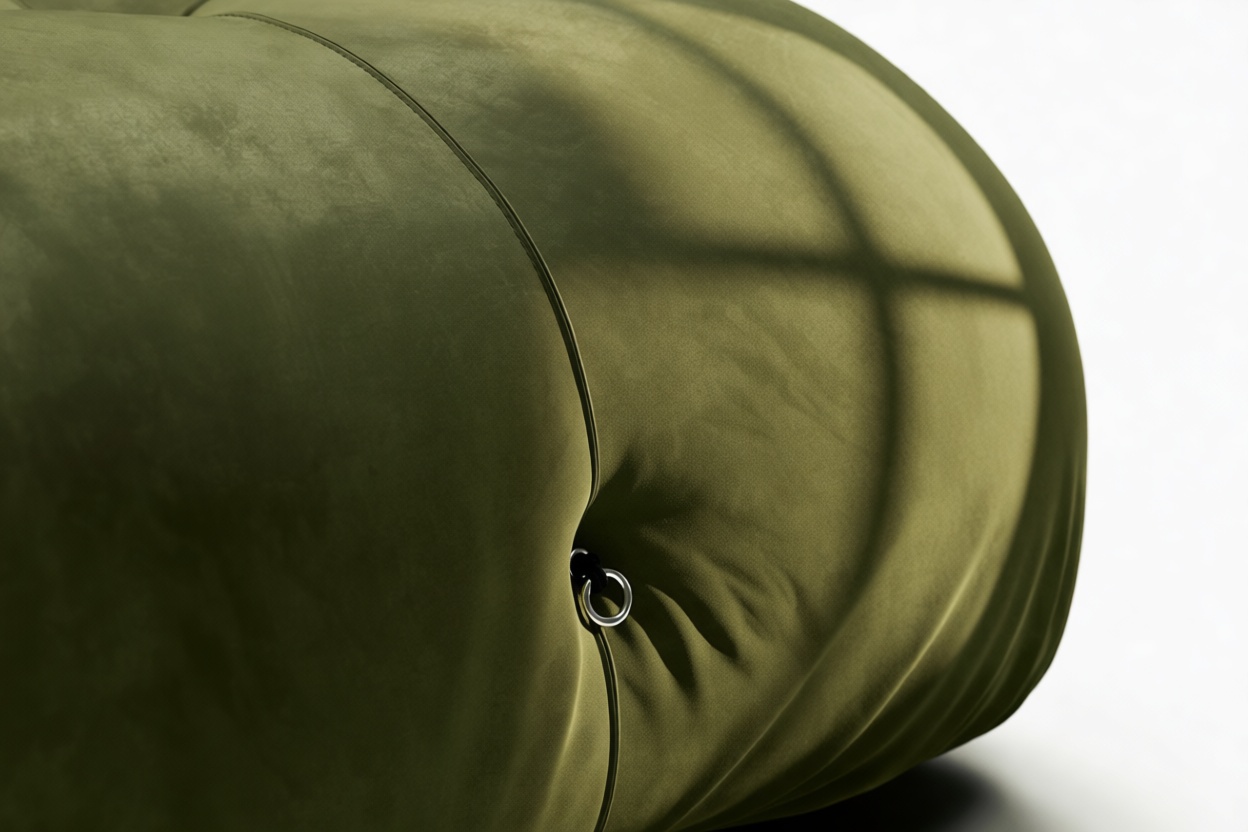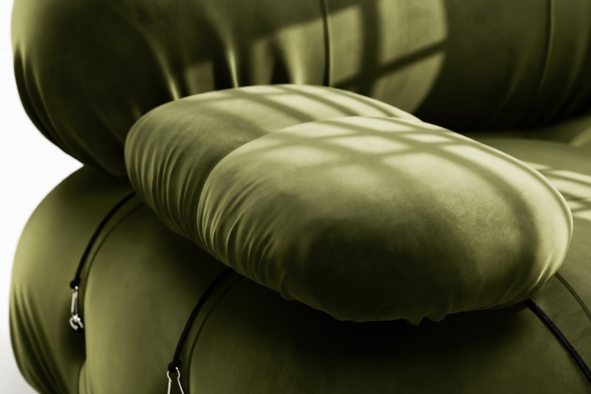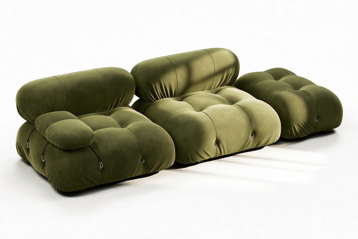 - Modular Instructions: Each section of the Mario Bellini Sofa is modular and is attached with string ties and carabiners. To assemble or rearrange your sofa, simply unclip the carabiners from one ring and attach to a corresponding ring on the module you wish to connect to.