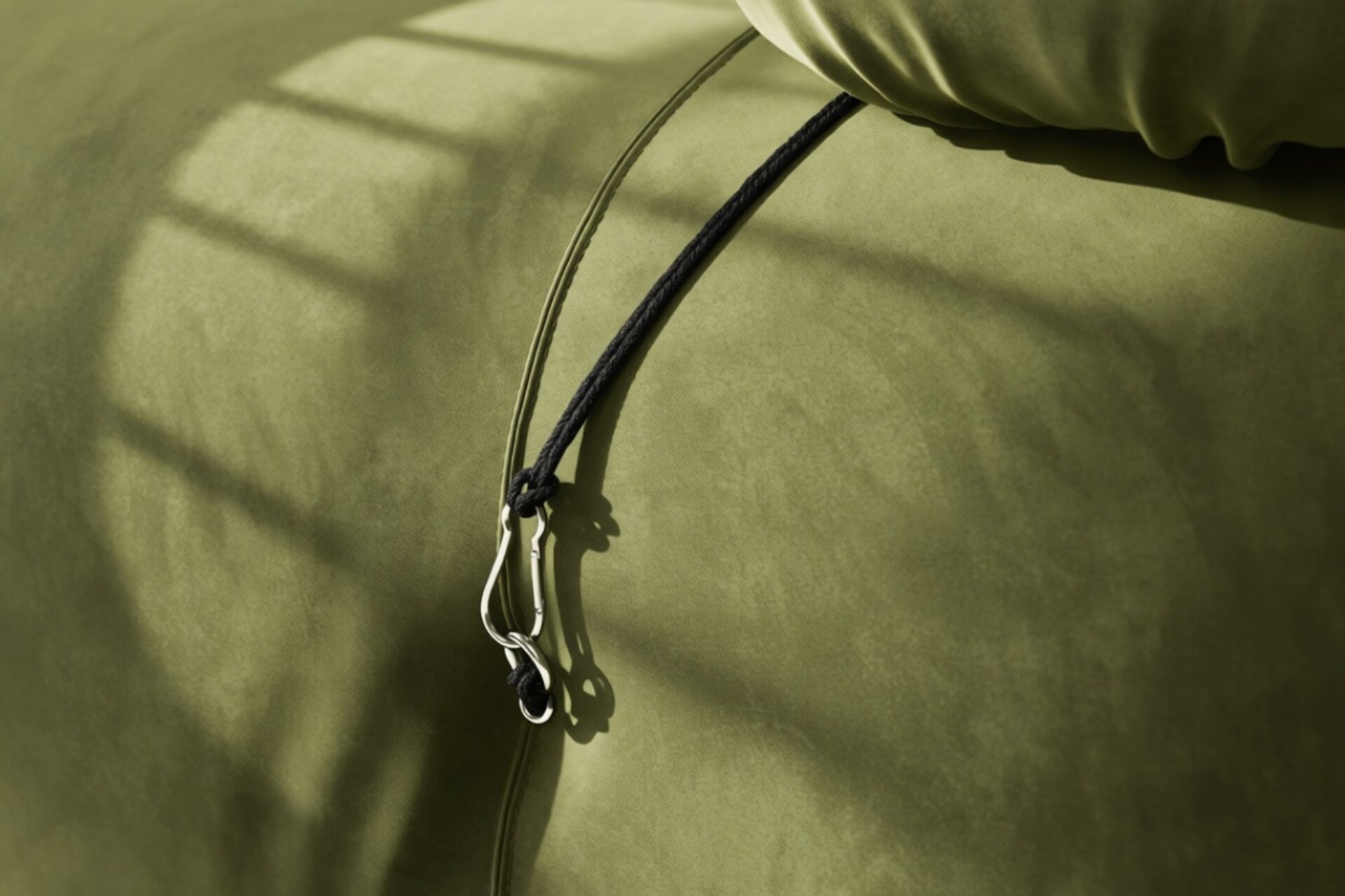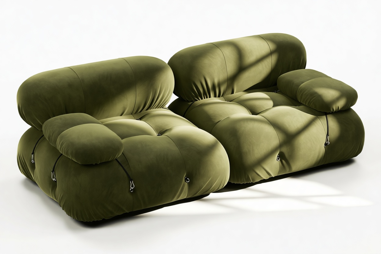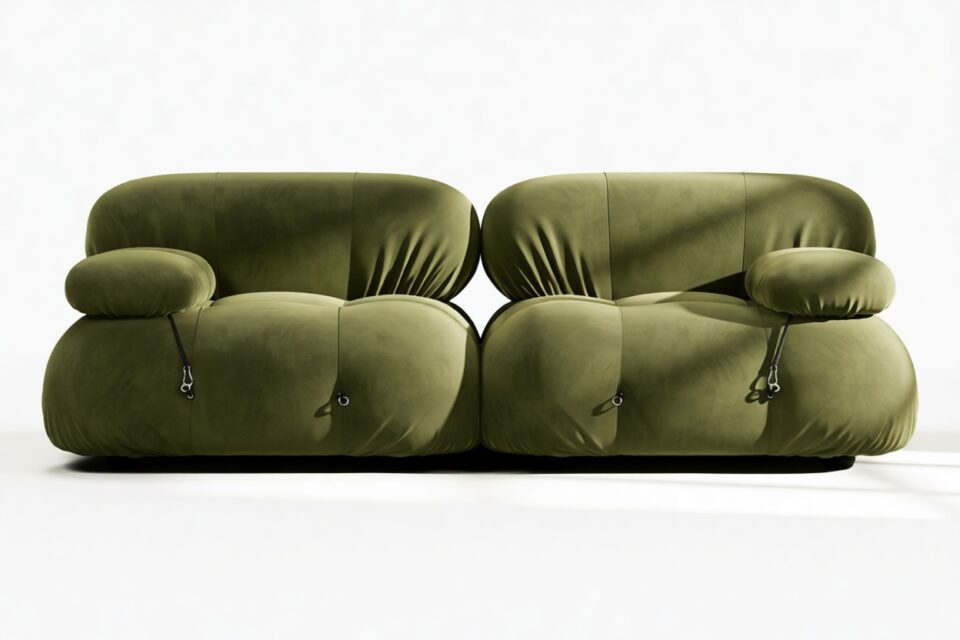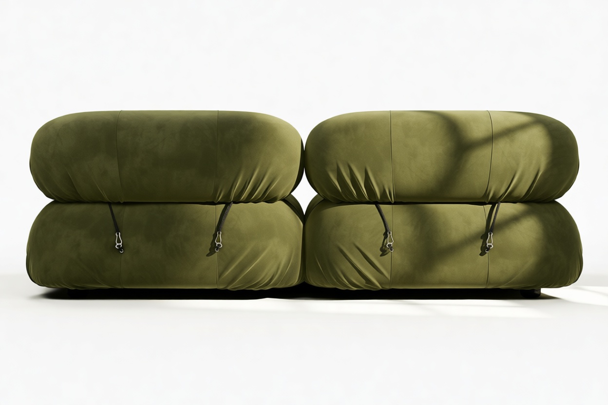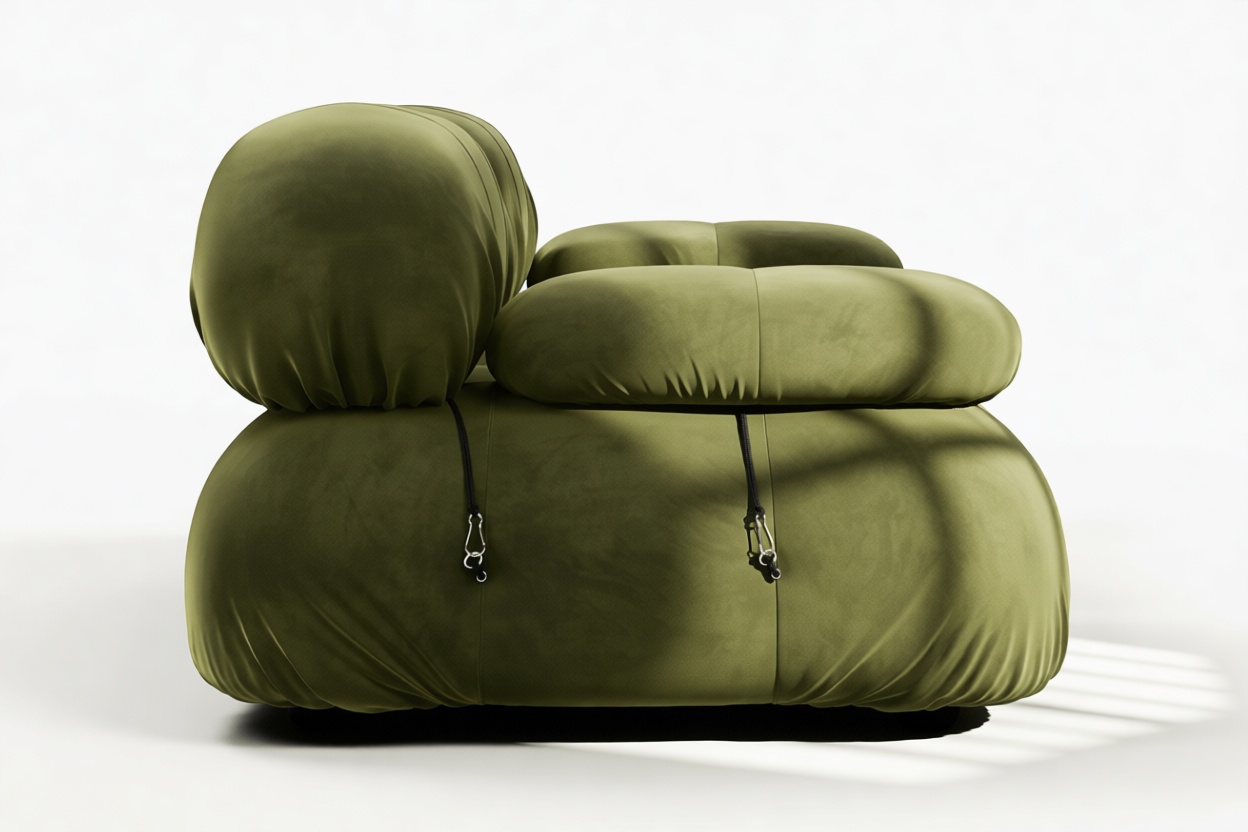 - Modular Instructions: Each section of the Mario Bellini Sofa is modular and is attached with string ties and carabiners. To assemble or rearrange your sofa, simply unclip the carabiners from one ring and attach to a corresponding ring on the module you wish to connect to.