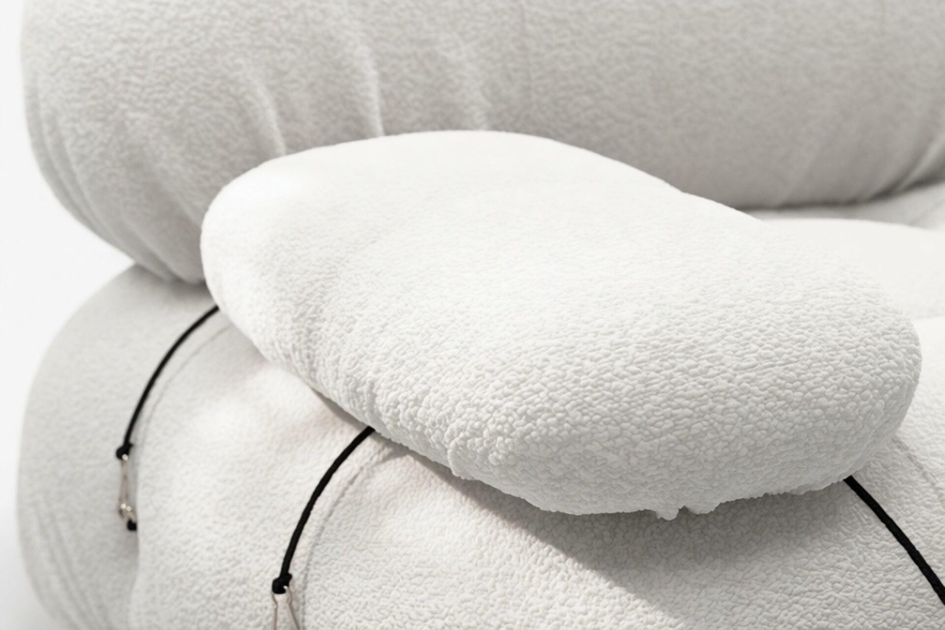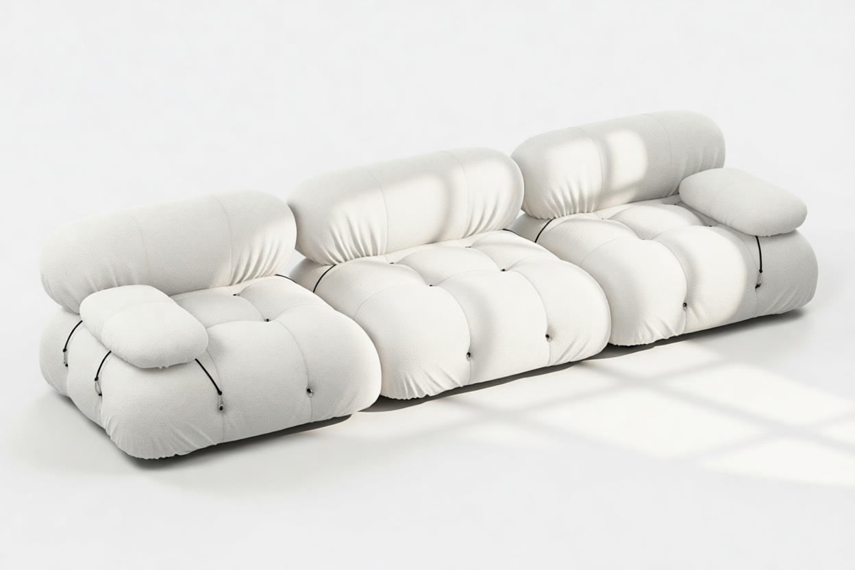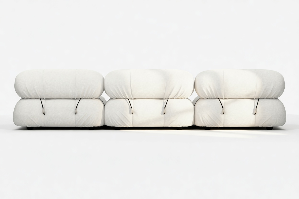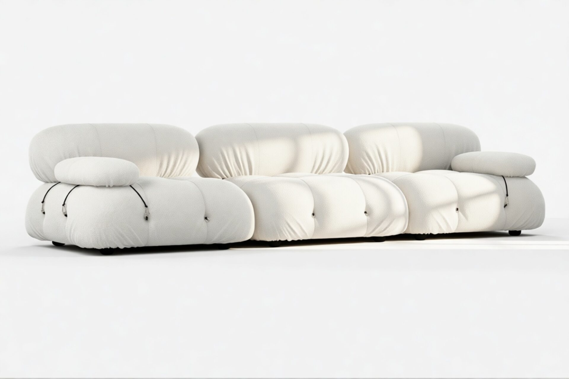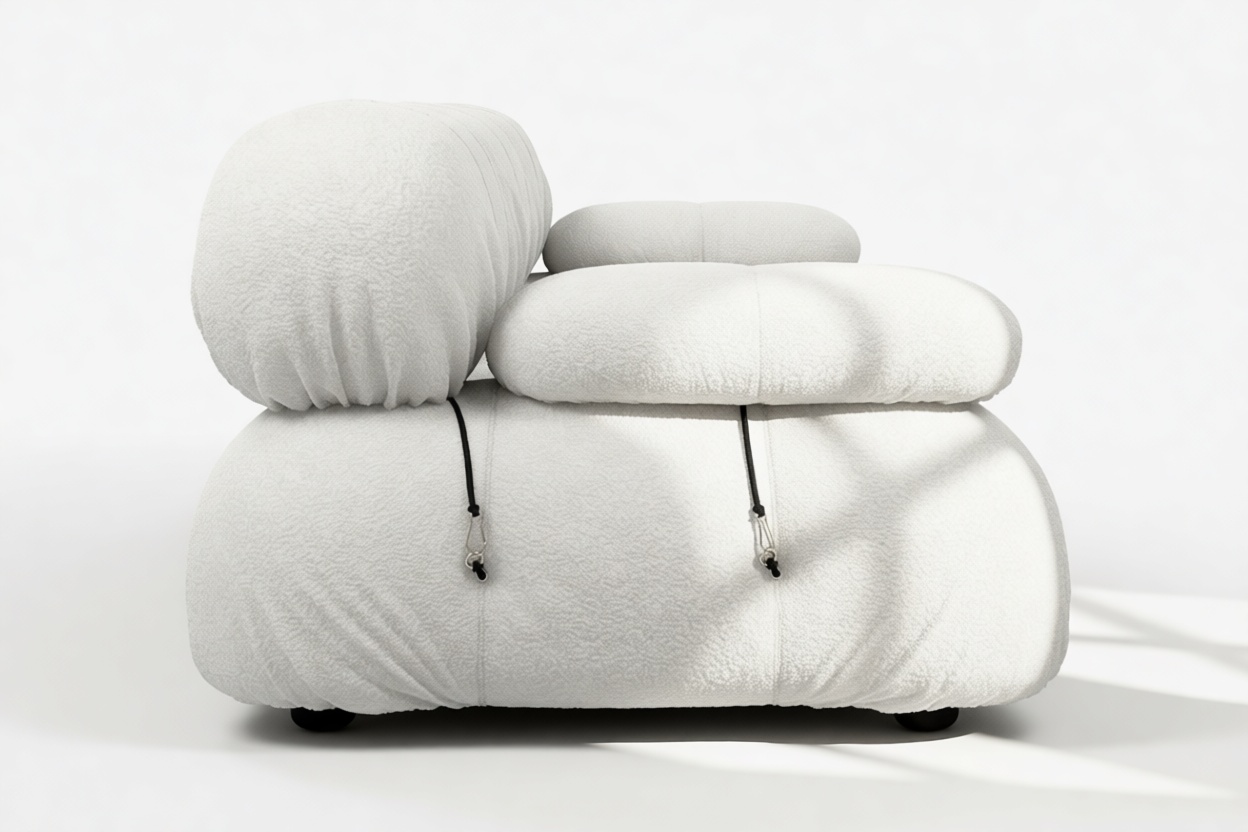 - Modular Instructions: Each section of the Mario Bellini Sofa is modular and is attached with string ties and carabiners. To assemble or rearrange your sofa, simply unclip the carabiners from one ring and attach to a corresponding ring on the module you wish to connect to.