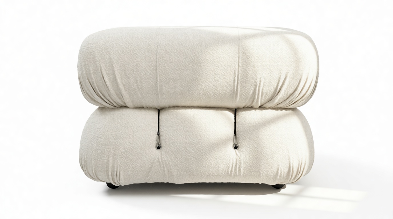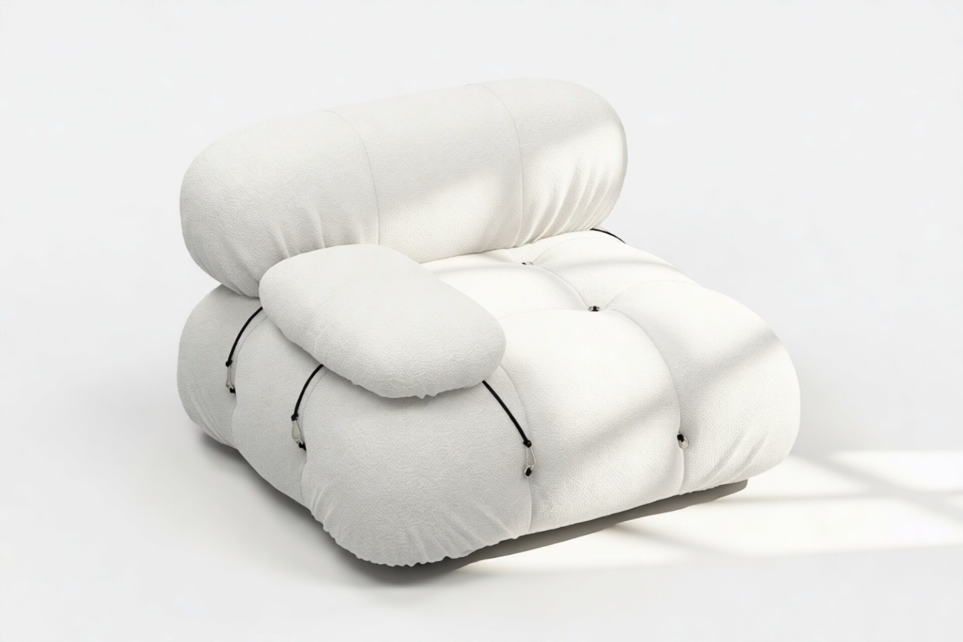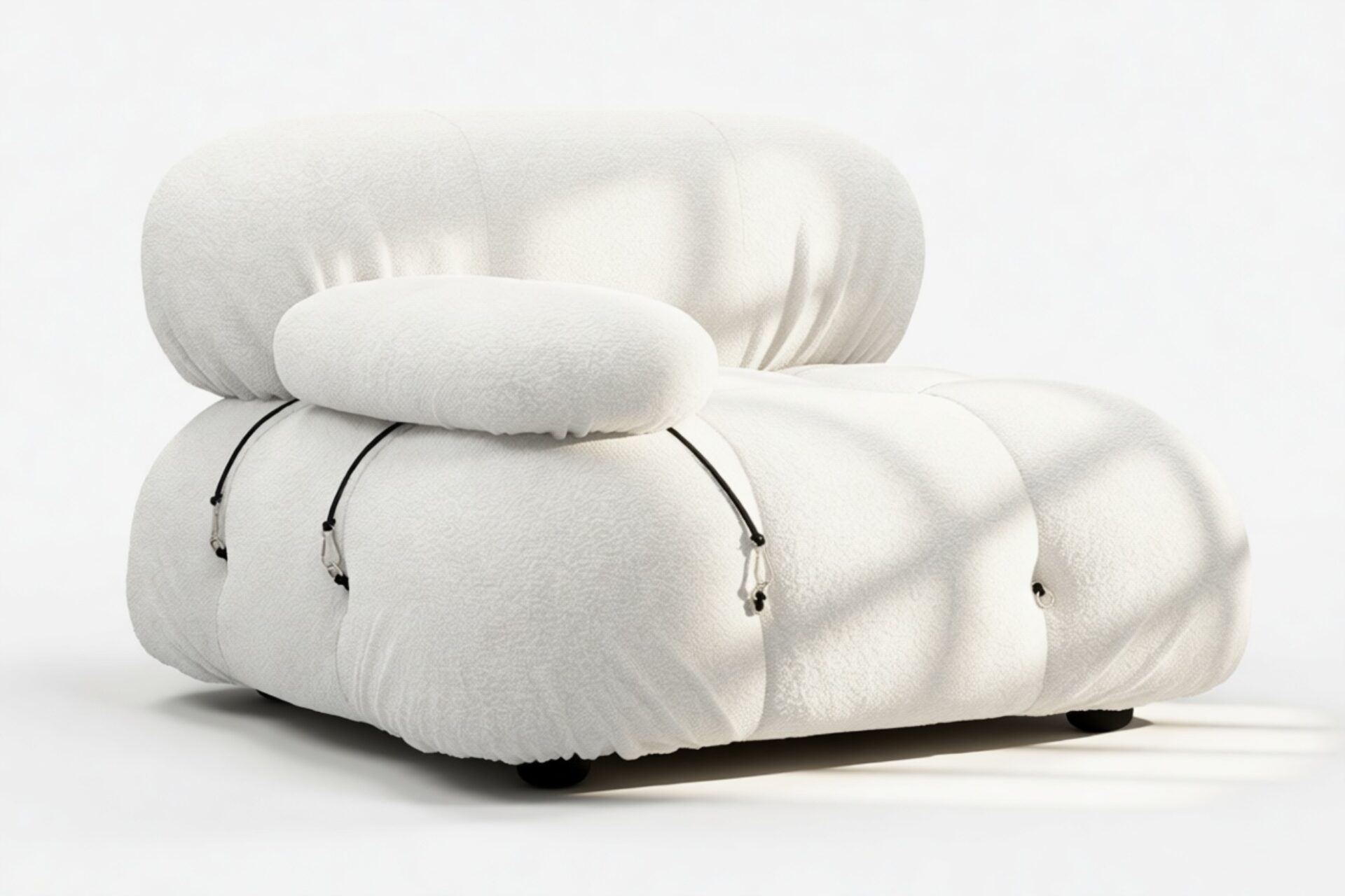 - Modular Instructions: Each section of the Mario Bellini Sofa is modular and is attached with string ties and carabiners. To assemble or rearrange your sofa, simply unclip the carabiners from one ring and attach to a corresponding ring on the module you wish to connect to.