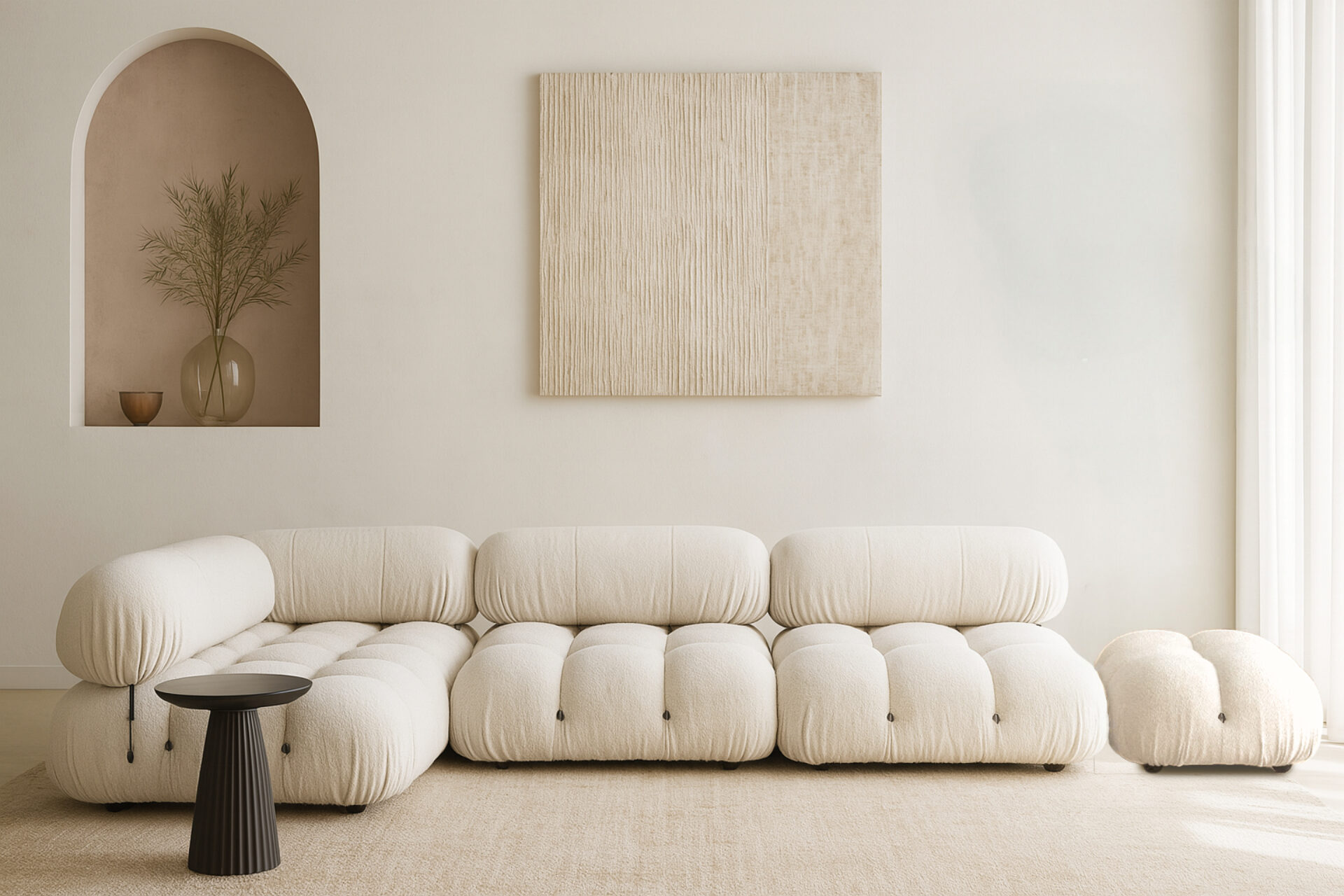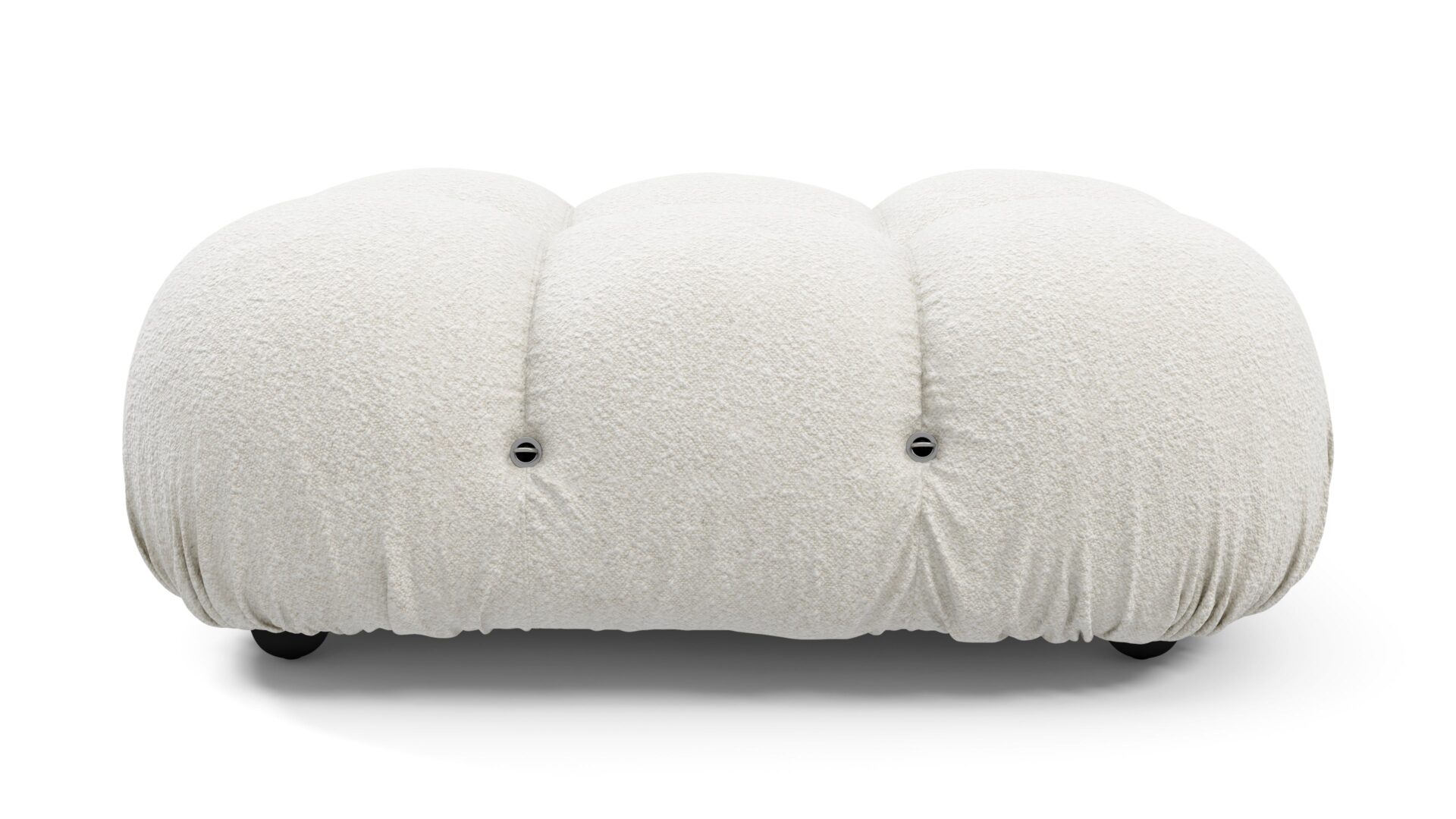 Step back into the 1970s with the Bellini sectional sofa exuding groovy vibes and carefree living. Defying conventions, its modular design allows for easy customization to suit any layout, style, or mood. Embraced by furniture enthusiasts, the Bellini features tie rods and rings for effortless rearrangement. Crafted with a sturdy wooden frame and soft White Boucle fabric, this luxurious sofa offers relaxation and style.