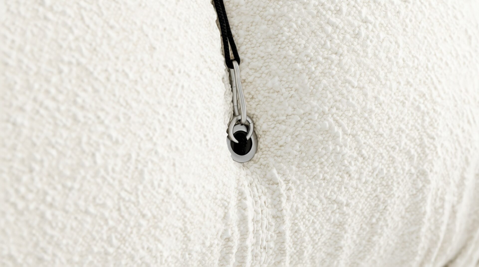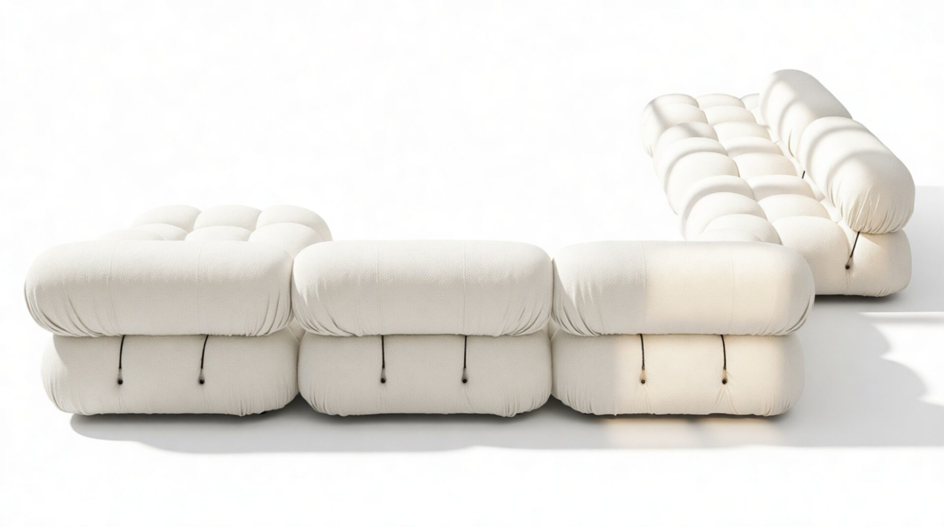 - Modular Instructions: Each section of the Mario Bellini Sofa is modular and is attached with string ties and carabiners. To assemble or rearrange your sofa, simply unclip the carabiners from one ring and attach to a corresponding ring on the module you wish to connect to.