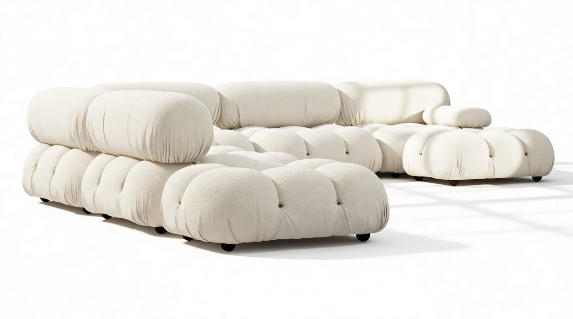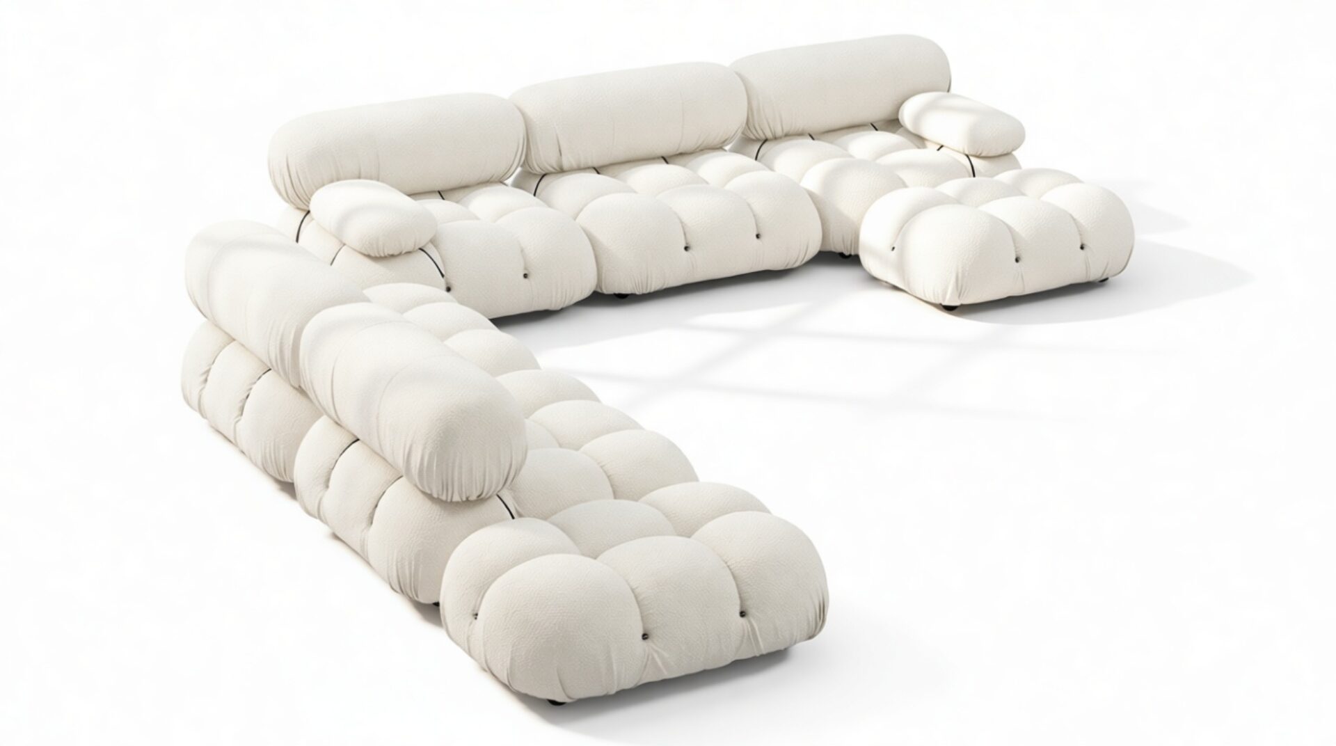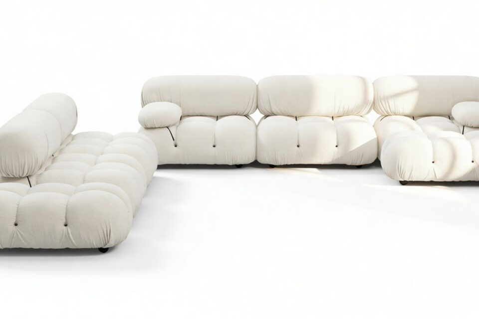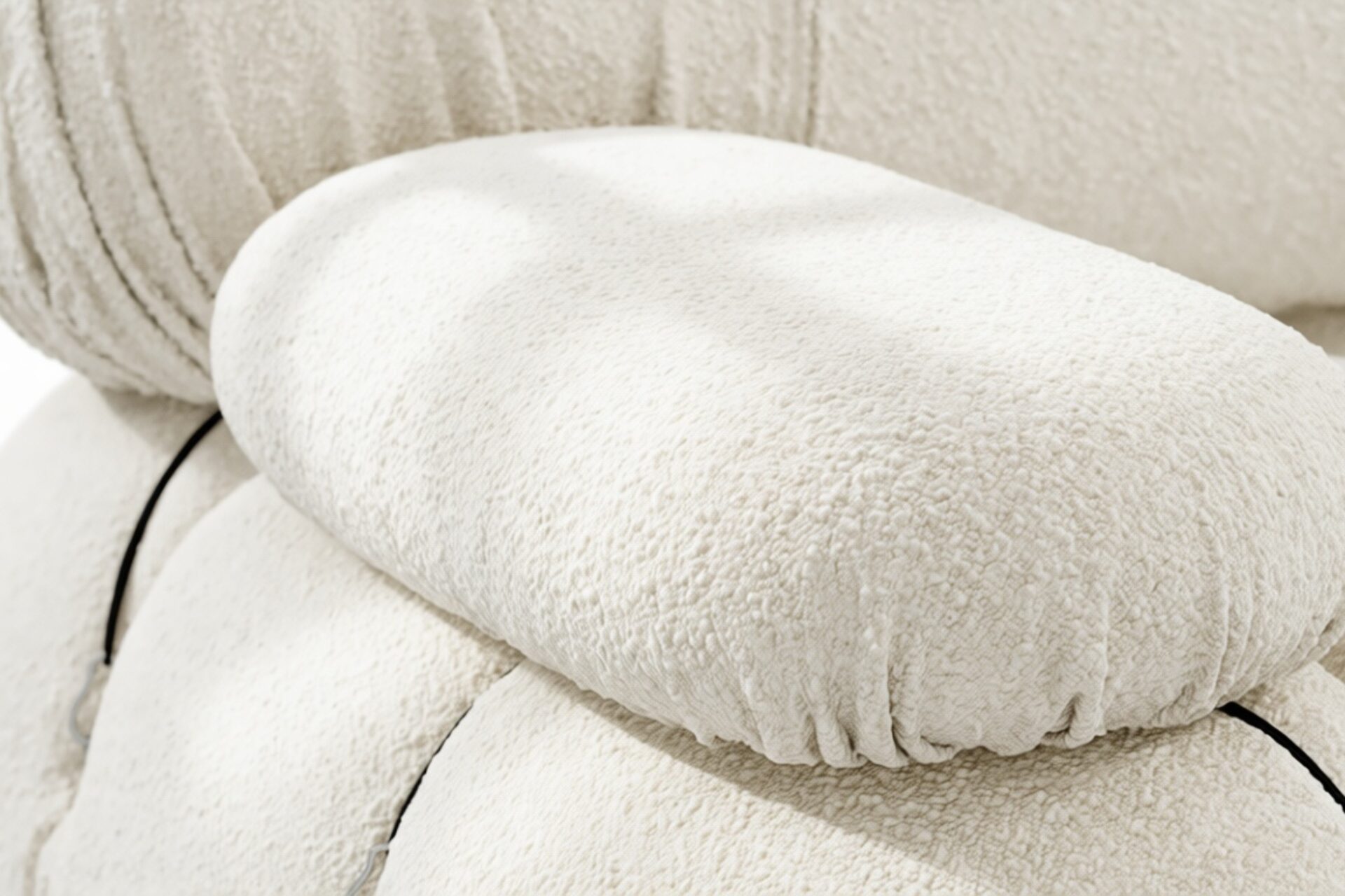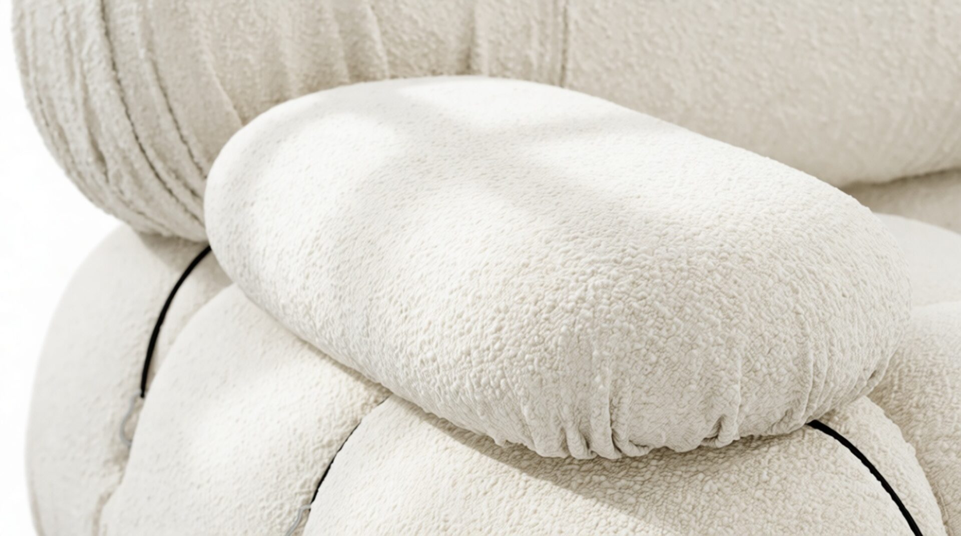 Transport your living space back to the chic vibe of the 1970s with the Bellini Sectional Sofa in White Boucle. Crafted with a robust wooden frame and sumptuously soft cold-pressed foam, this contemporary piece exudes casual opulence. Its modular design and plush cushions offer limitless configurations to effortlessly match your style and needs, making it a favorite among furniture enthusiasts seeking timeless elegance.