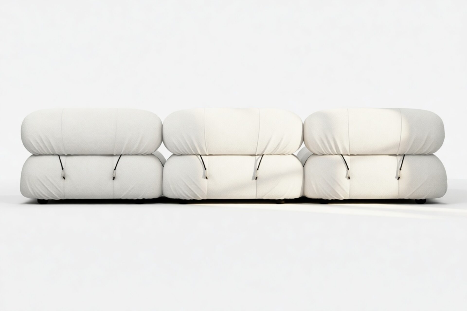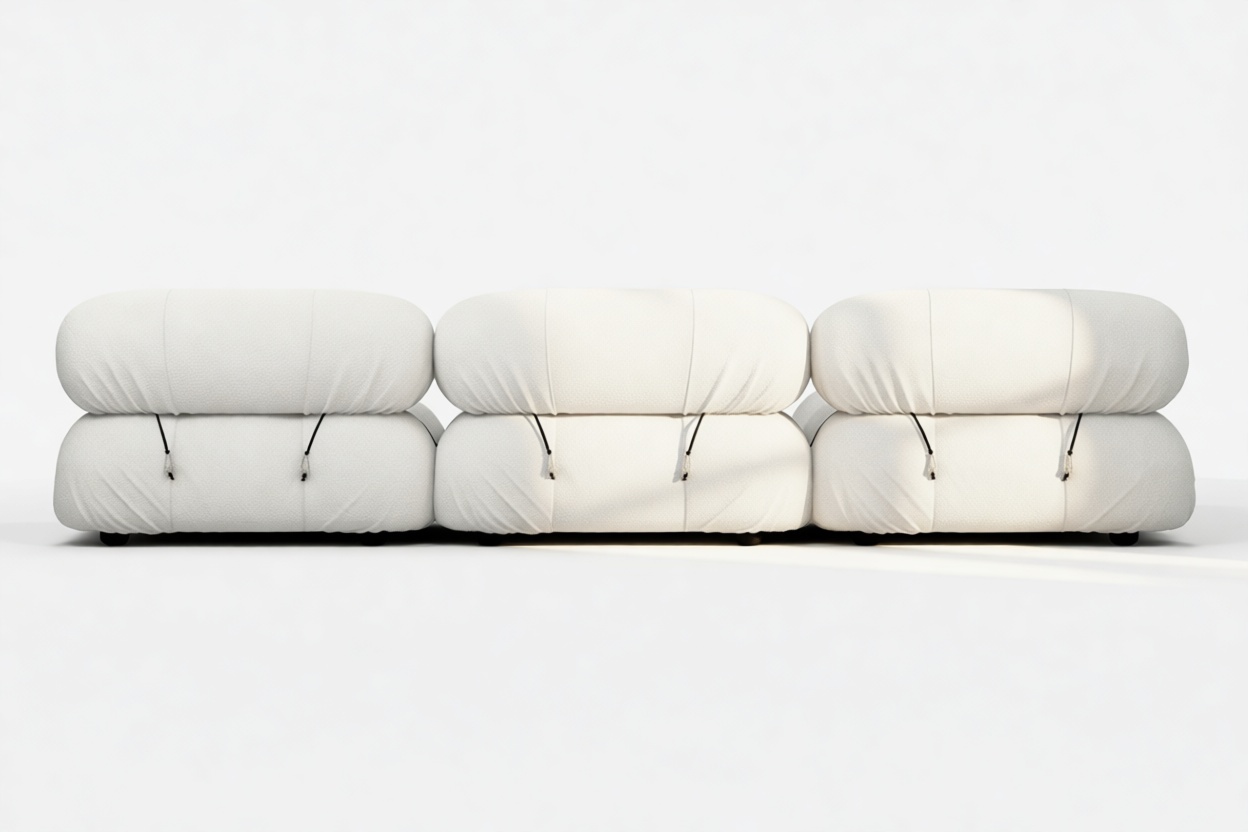 - Modular Instructions: Each section of the Mario Bellini Sofa is modular and is attached with string ties and carabiners. To assemble or rearrange your sofa, simply unclip the carabiners from one ring and attach to a corresponding ring on the module you wish to connect to.
