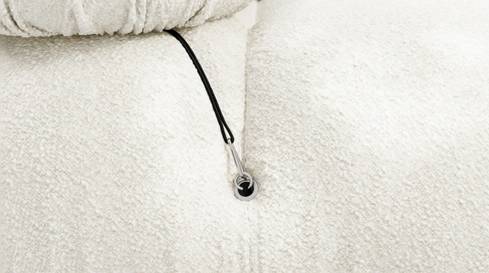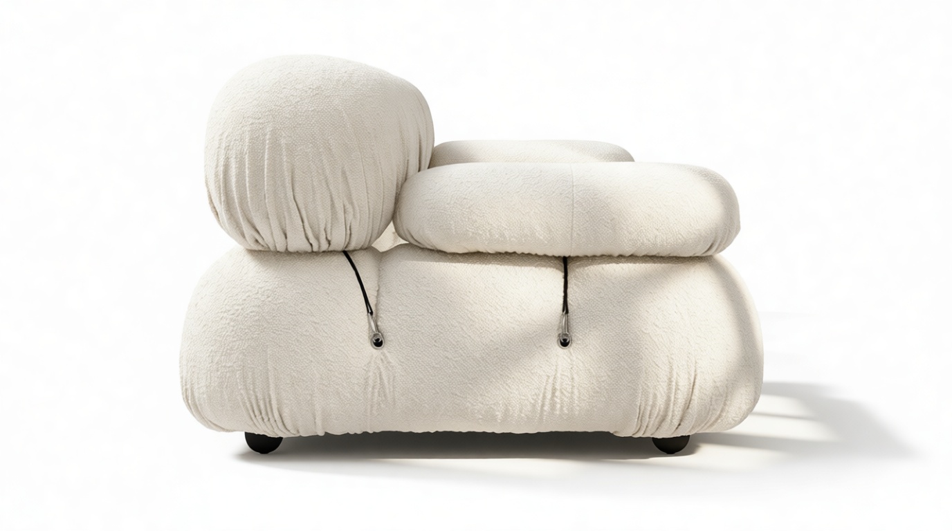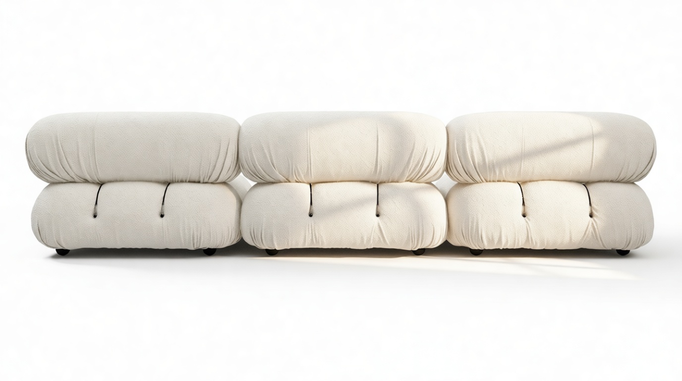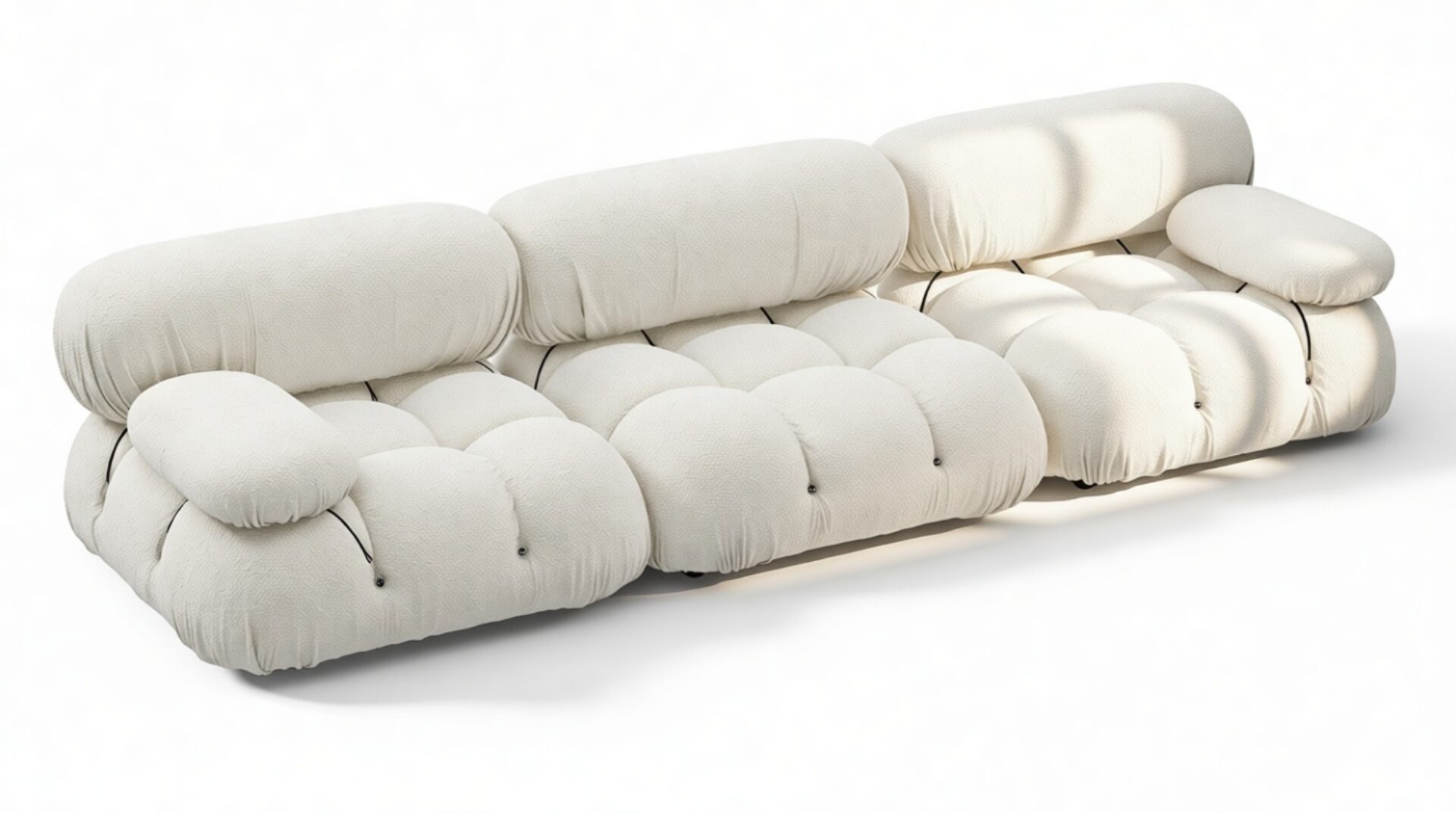 - Modular Instructions: Each section of the Mario Bellini Sofa is modular and is attached with string ties and carabiners. To assemble or rearrange your sofa, simply unclip the carabiners from one ring and attach to a corresponding ring on the module you wish to connect to.