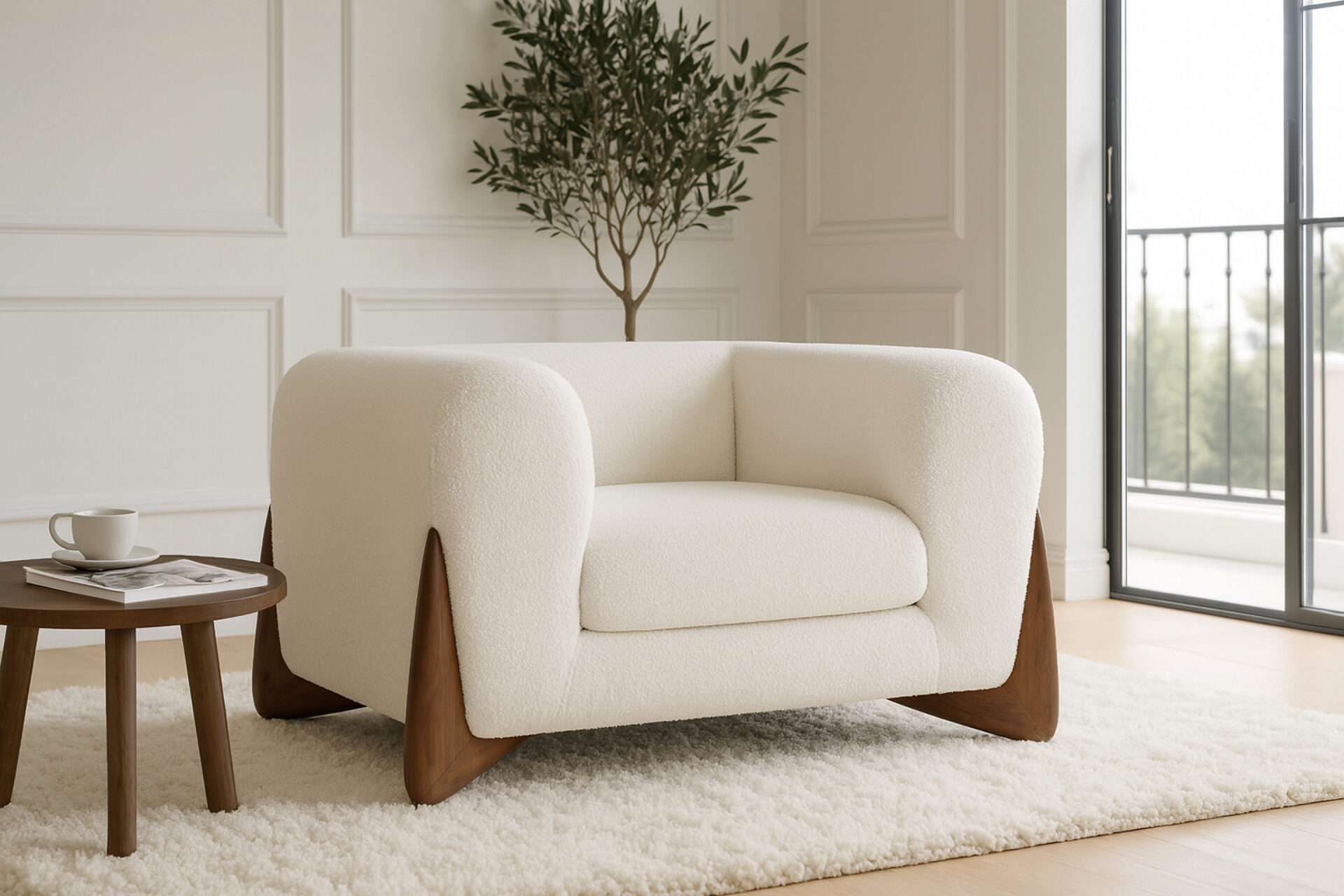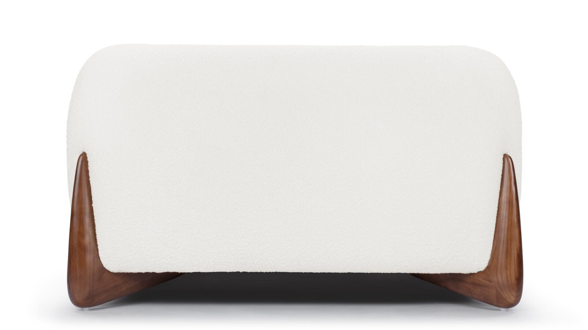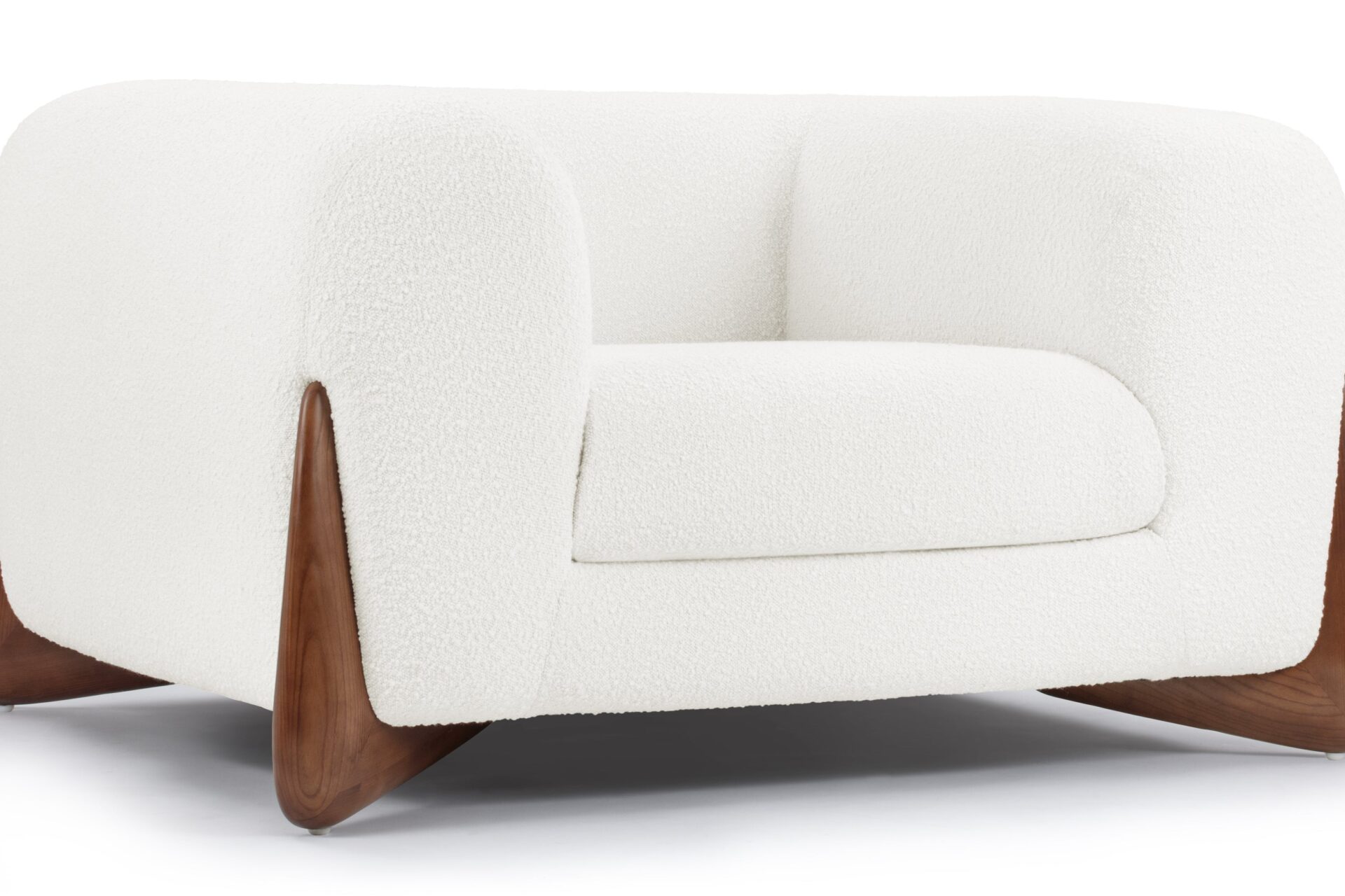 Elevate your space with the luxurious combination of the dark, rich walnut tones and the pure white bouclé in our chair. This pairing adds a hint of opulence while anchoring the chair in a seamless fusion of natural beauty and contemporary design.