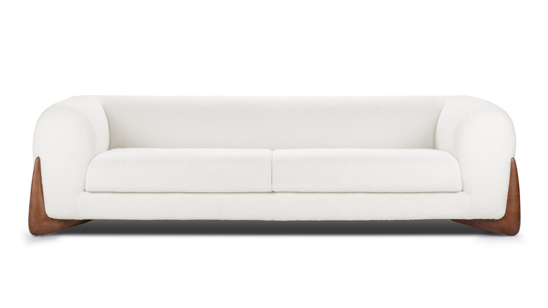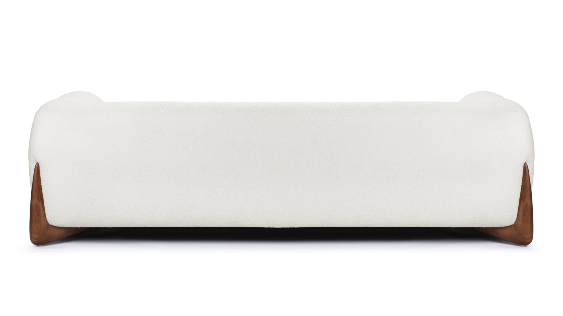 Elevate your space with the luxurious contrast between the deep, rich tones of walnut and the pristine white bouclé upholstery. This superb combination infuses a sense of opulence and sophistication, grounding the Breton sofa in a seamless fusion of natural beauty and modern design.
