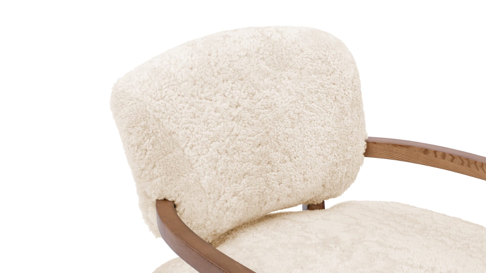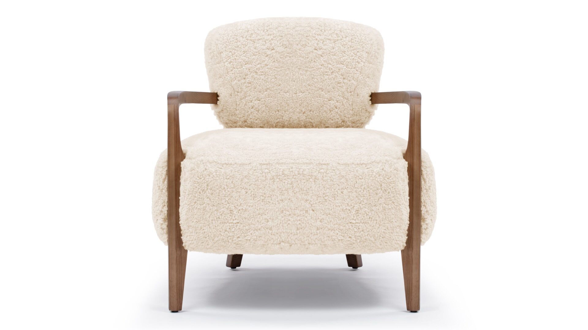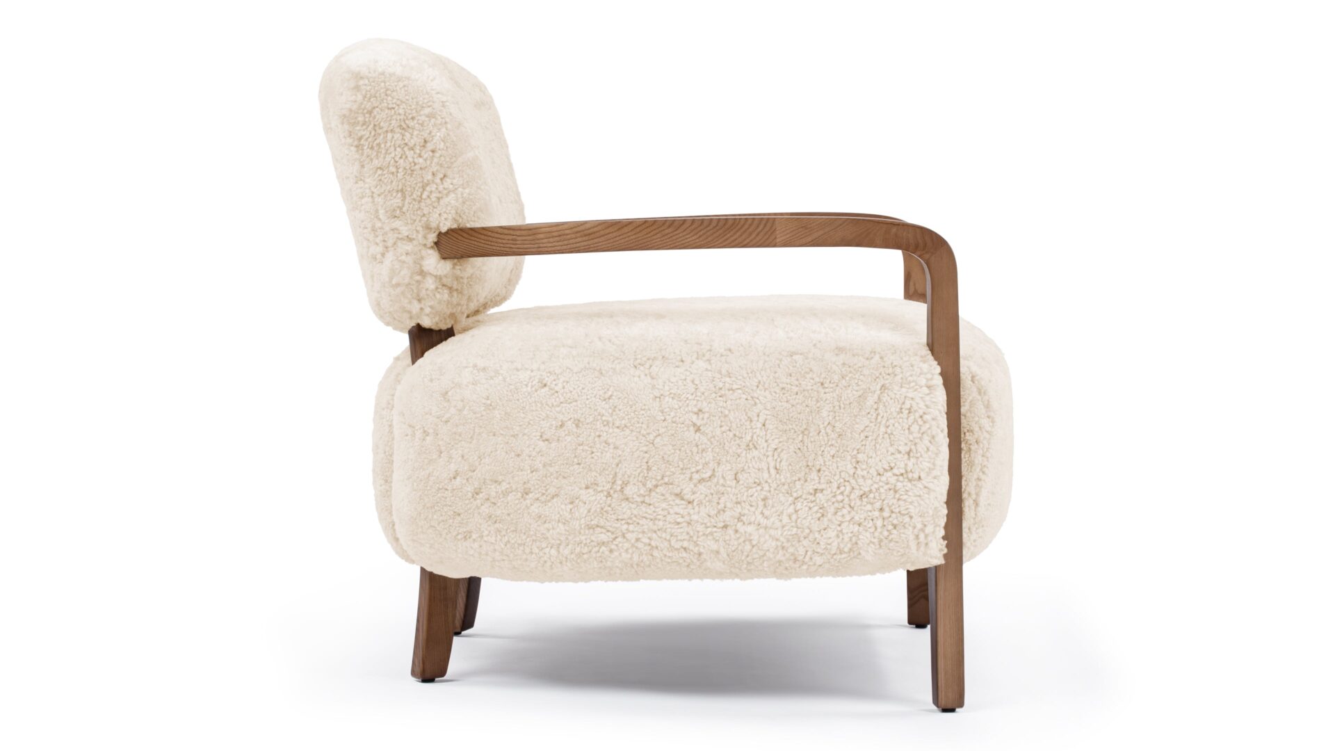 Elevate your space with the Cabana Chair, a luxurious seating choice designed with plush vegan sheepskin. Its sophisticated profile effortlessly complements any interior style, from living rooms to cozy reading corners. The Natural Luxe Sheepskin upholstery of the chair offers indulgent comfort, enhanced by generous cushioning and a sturdy walnut frame. Add elegance and warmth to your home with this Nordic-influenced statement piece.
