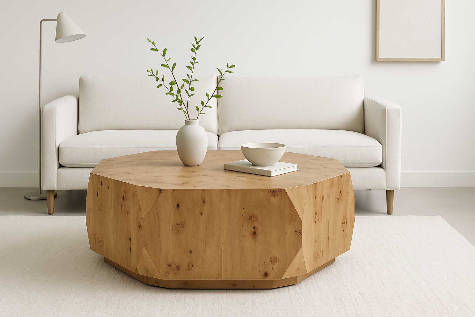 Introducing the stunning Calista Coffee Table, showcasing a flawless fusion of modern flair and natural allure. Crafted with precision, this exceptional piece boasts a captivating walnut finish that accentuates its captivating geometric shape. Elevate any room with its exquisite burl wood veneer, exquisite craftsmanship, and sleek lines, ensuring it becomes a timeless focal point in your décor.