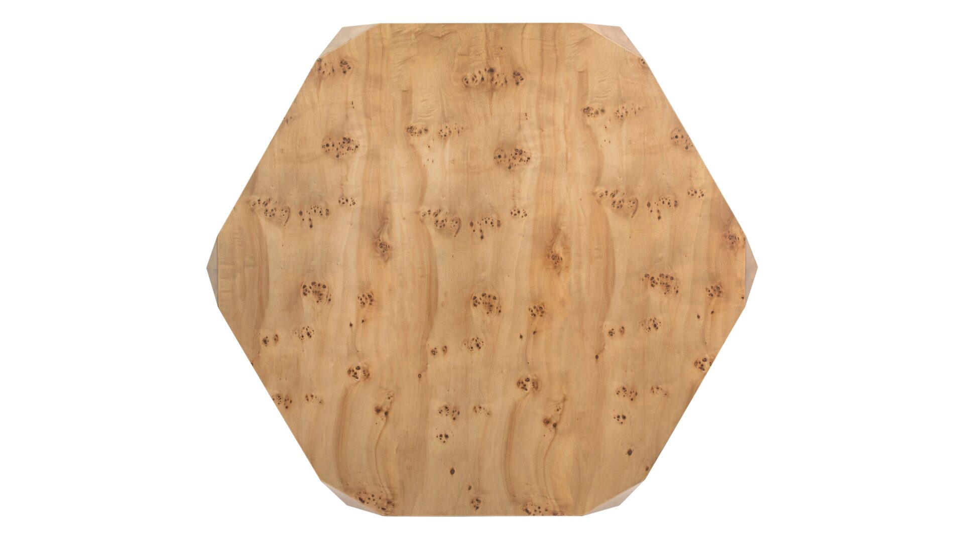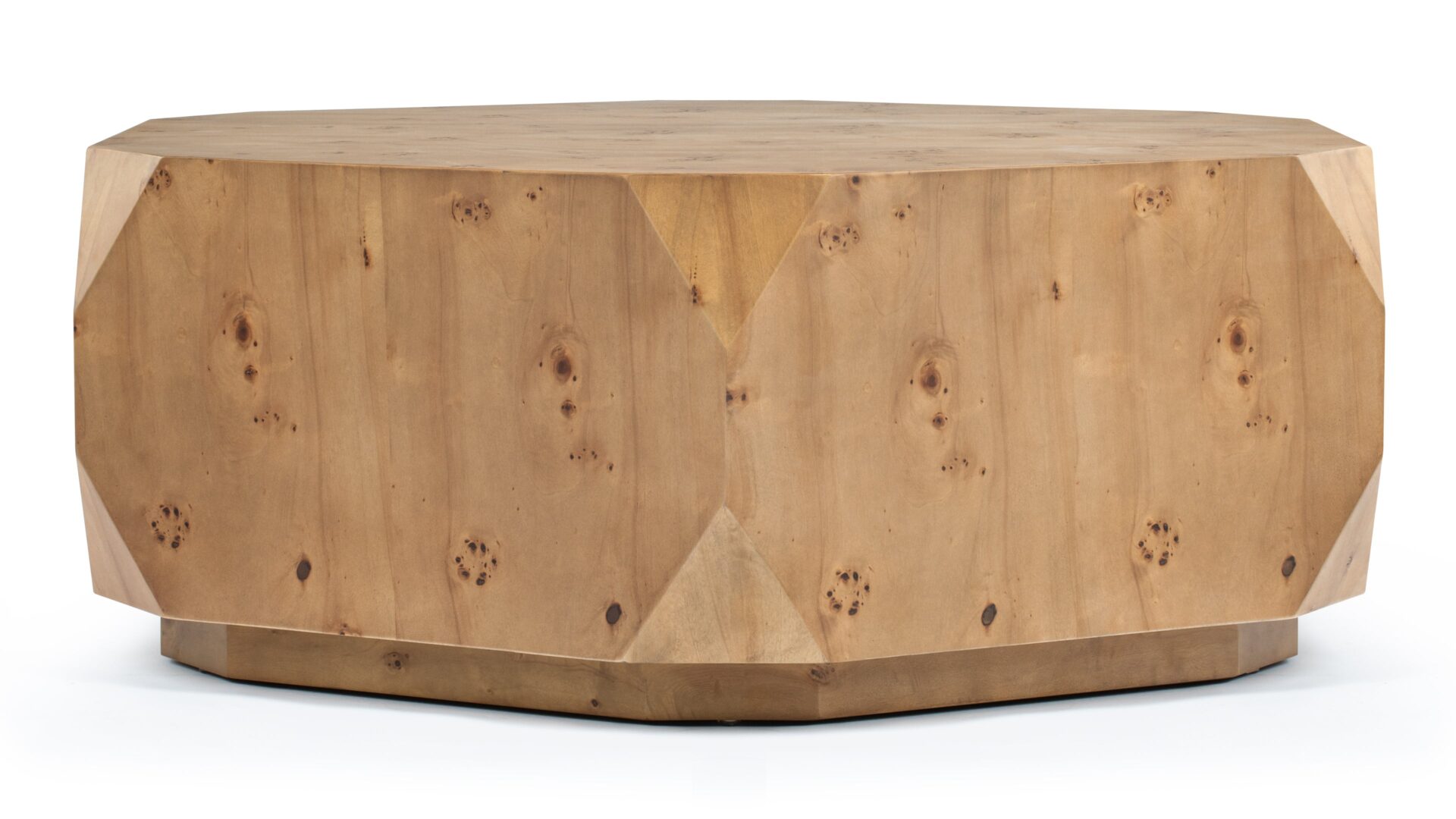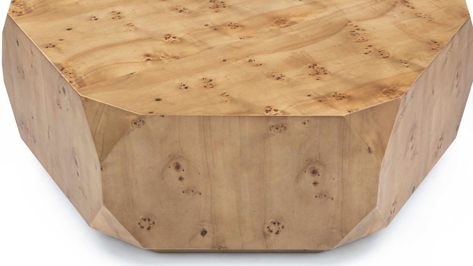 Elevate your living space with the distinctive Callie Coffee Table featuring a remarkable burl wood veneer finish. The exquisite veneer highlights the inherent beauty of the wood, revealing mesmerizing swirling patterns and intricate grains that enhance the minimalist design of the table.
