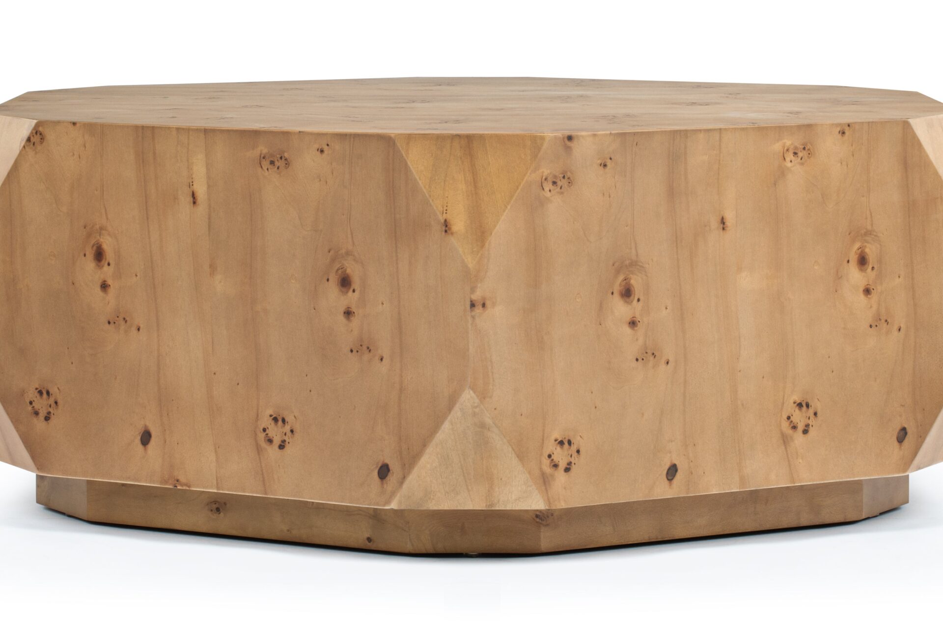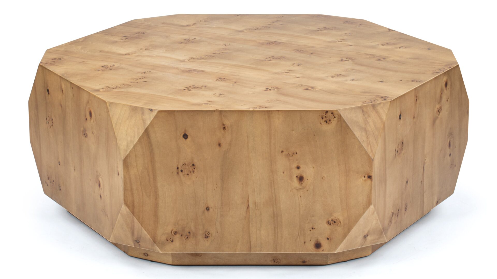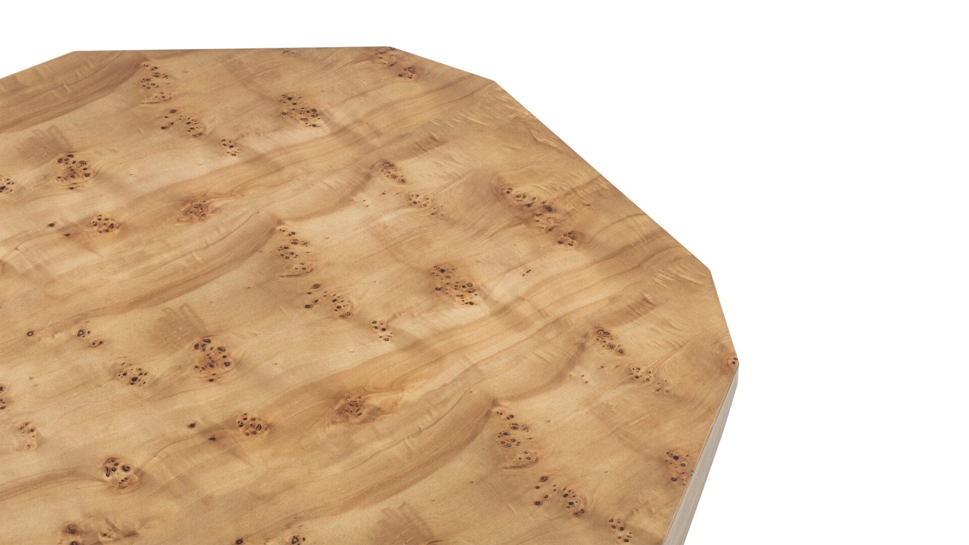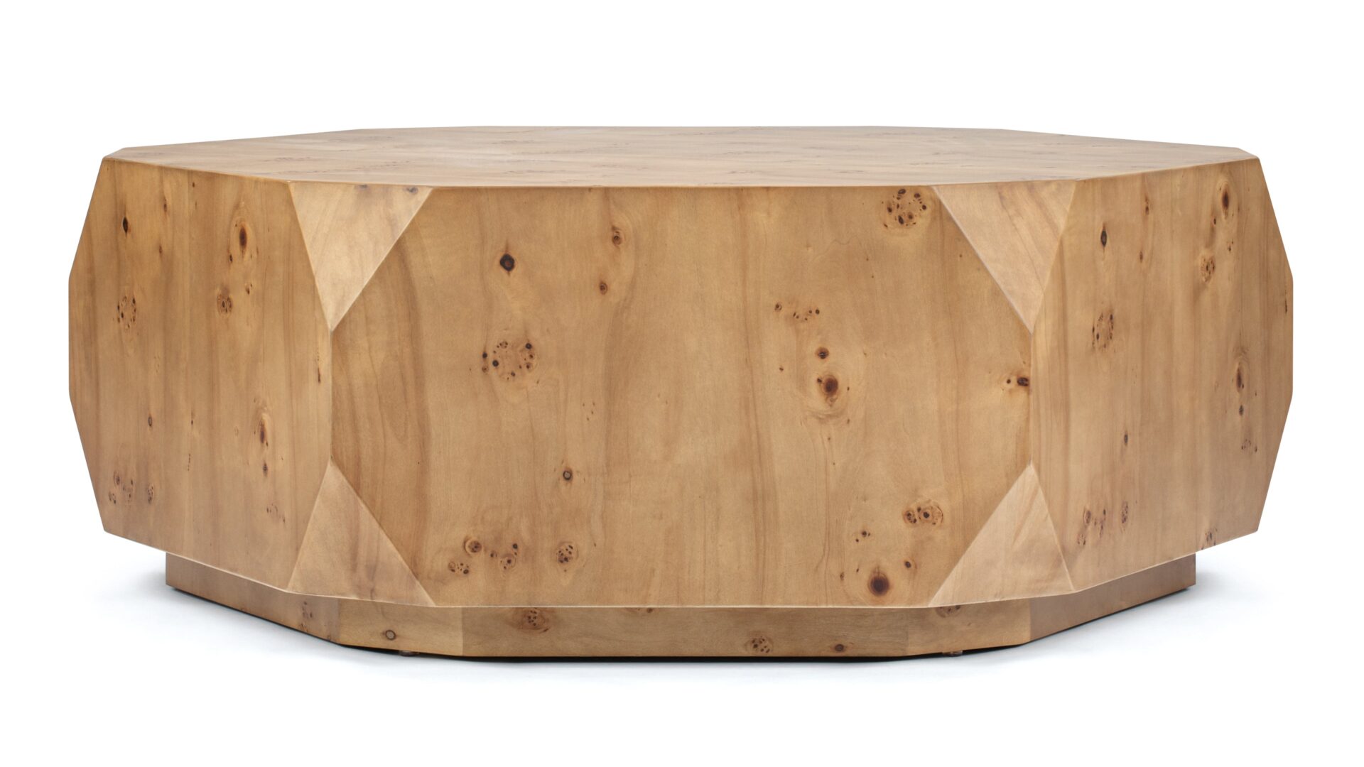 Elevate your living space with the distinctive Callie Coffee Table featuring a remarkable burl wood veneer finish. The exquisite veneer highlights the inherent beauty of the wood, revealing mesmerizing swirling patterns and intricate grains that enhance the minimalist design of the table.