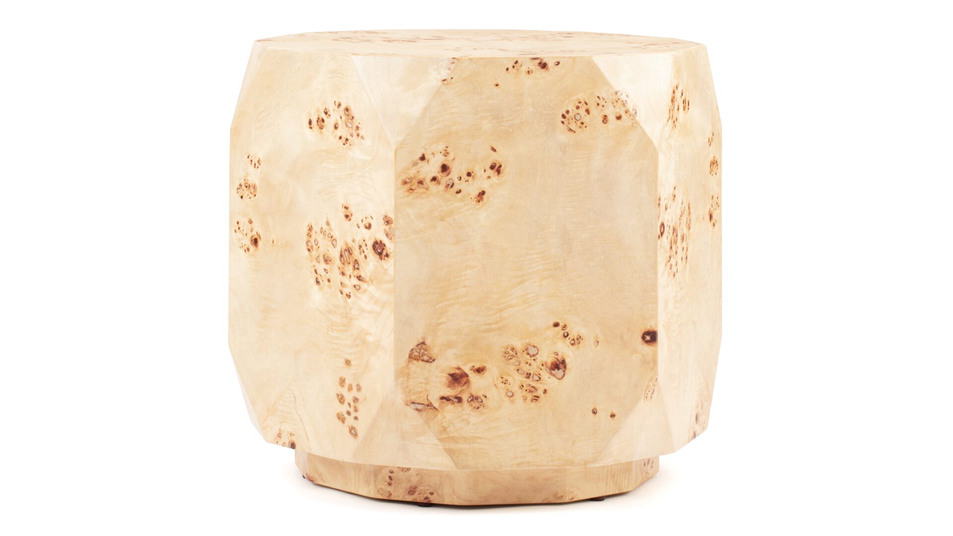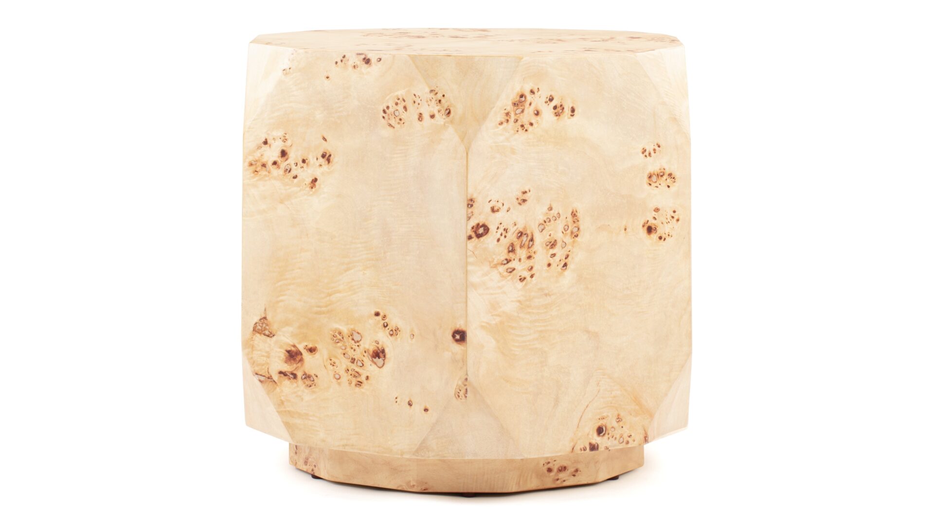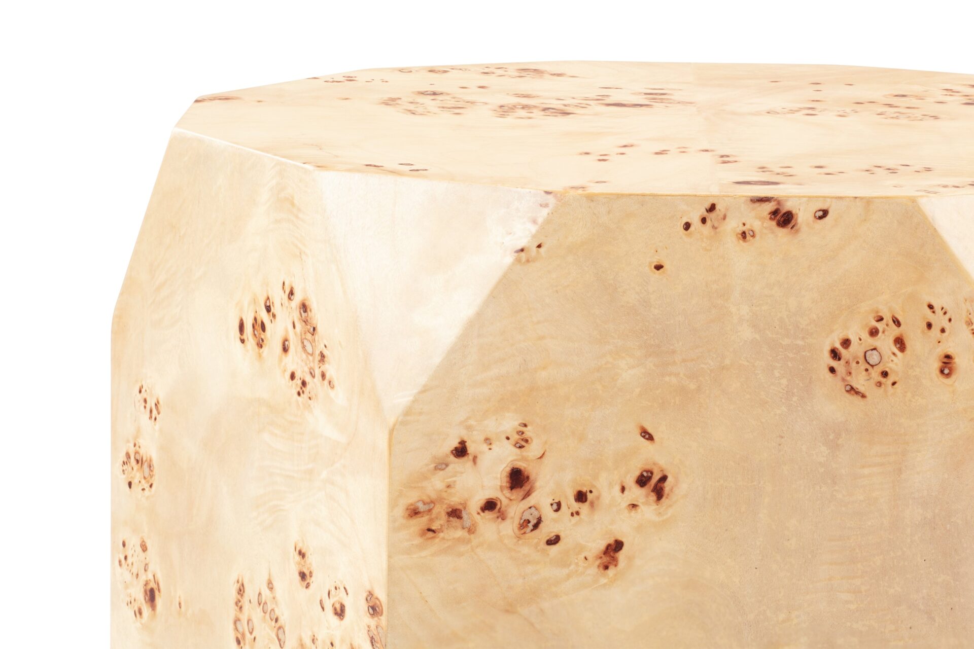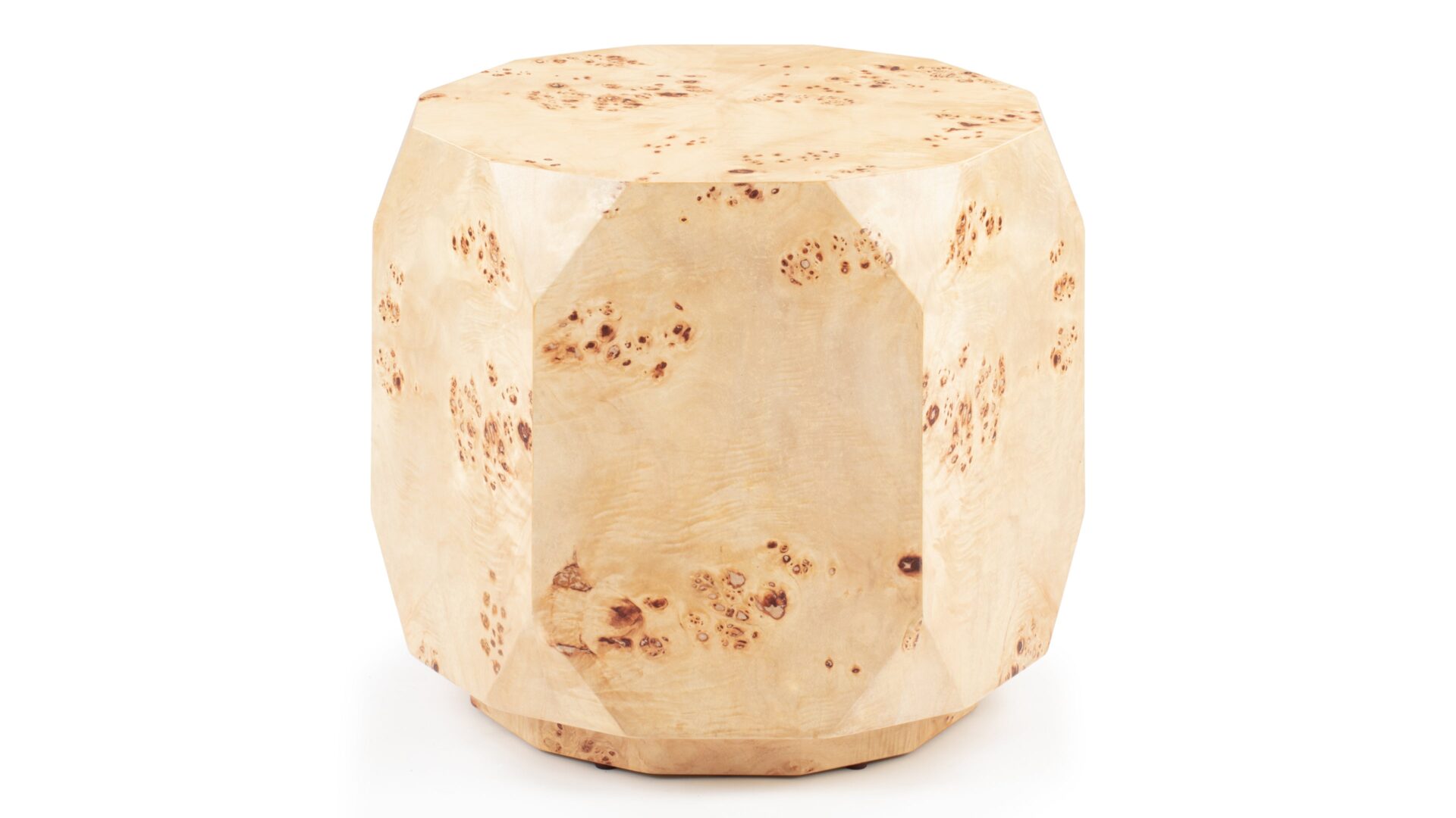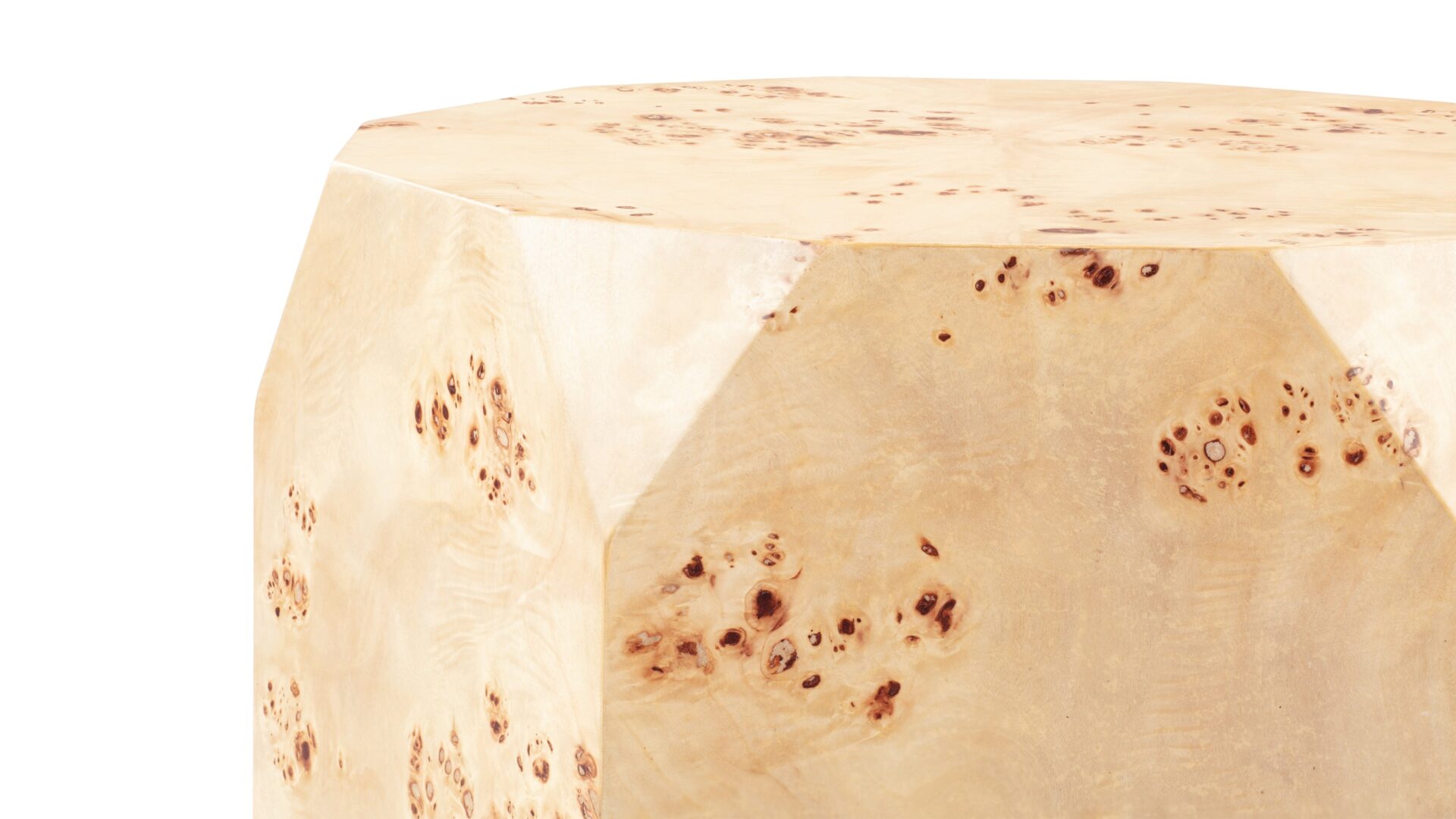 Introducing the alluring Callie Side Table, a fusion of modern design and natural allure. This finely crafted piece effortlessly enhances any living area with its unique charm and subtle sophistication. Its mesmerizing faceted geometric form, with a natural burl wood veneer finish, creates a visually stunning silhouette. The Callie Side Table is a versatile statement piece that seamlessly adjusts to your unique style and preferences, destined to be the focal point of any space for years to come.