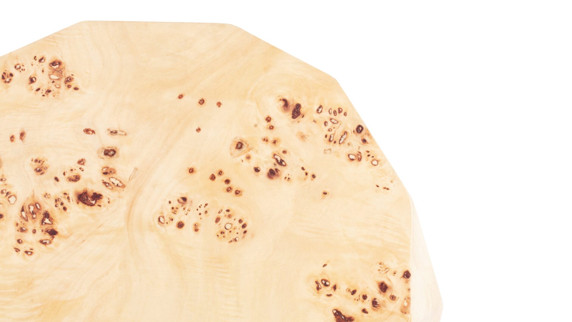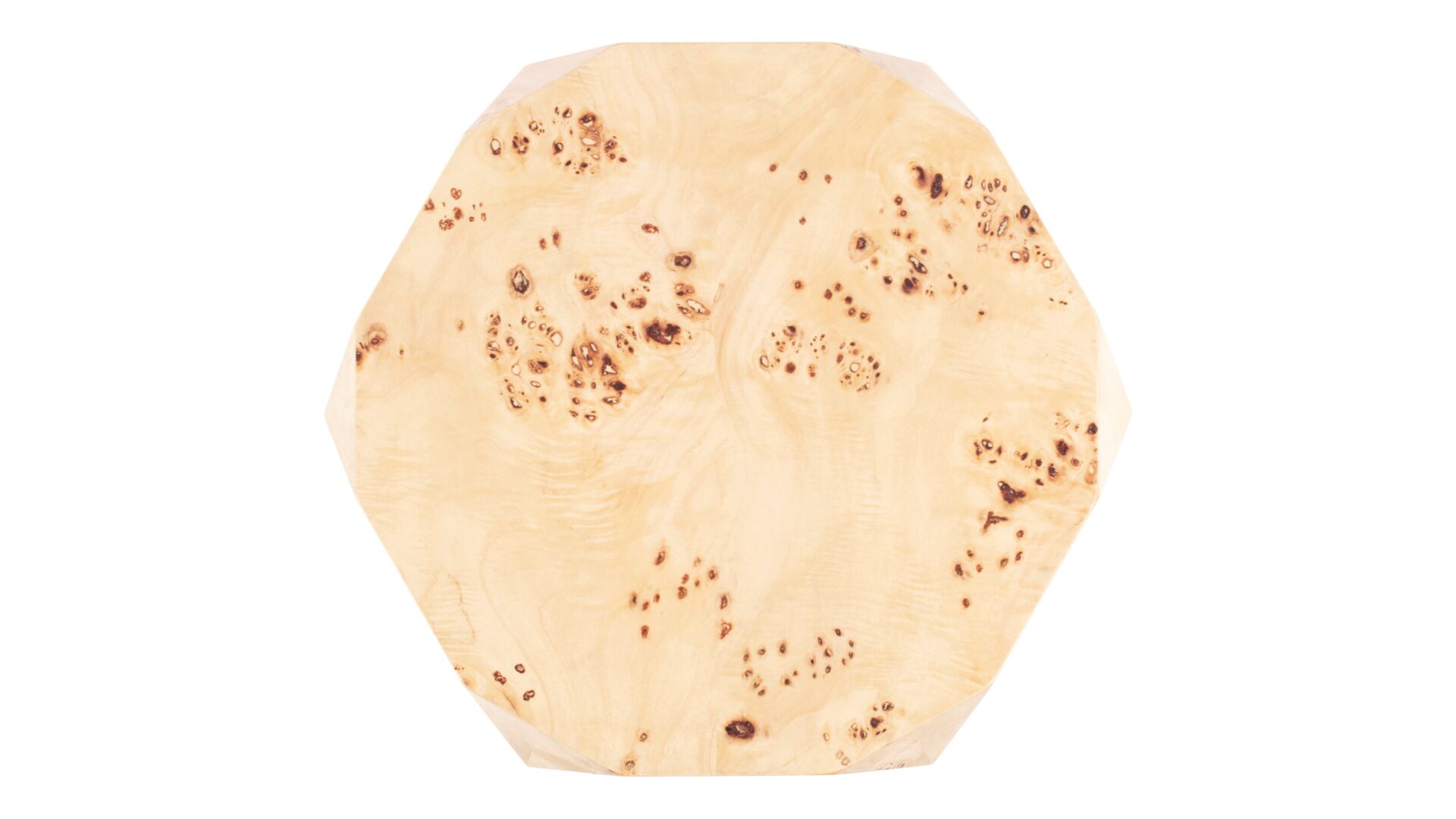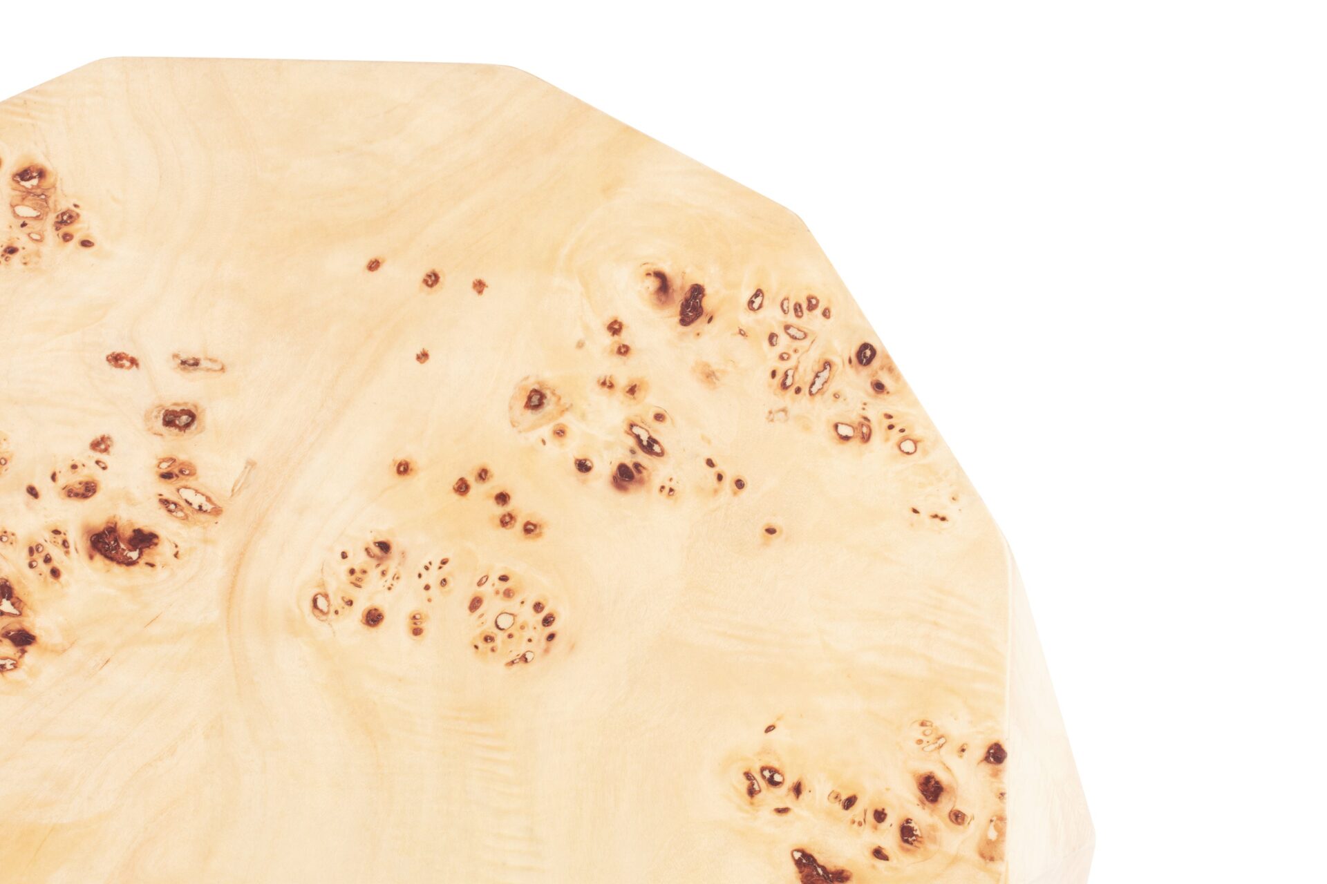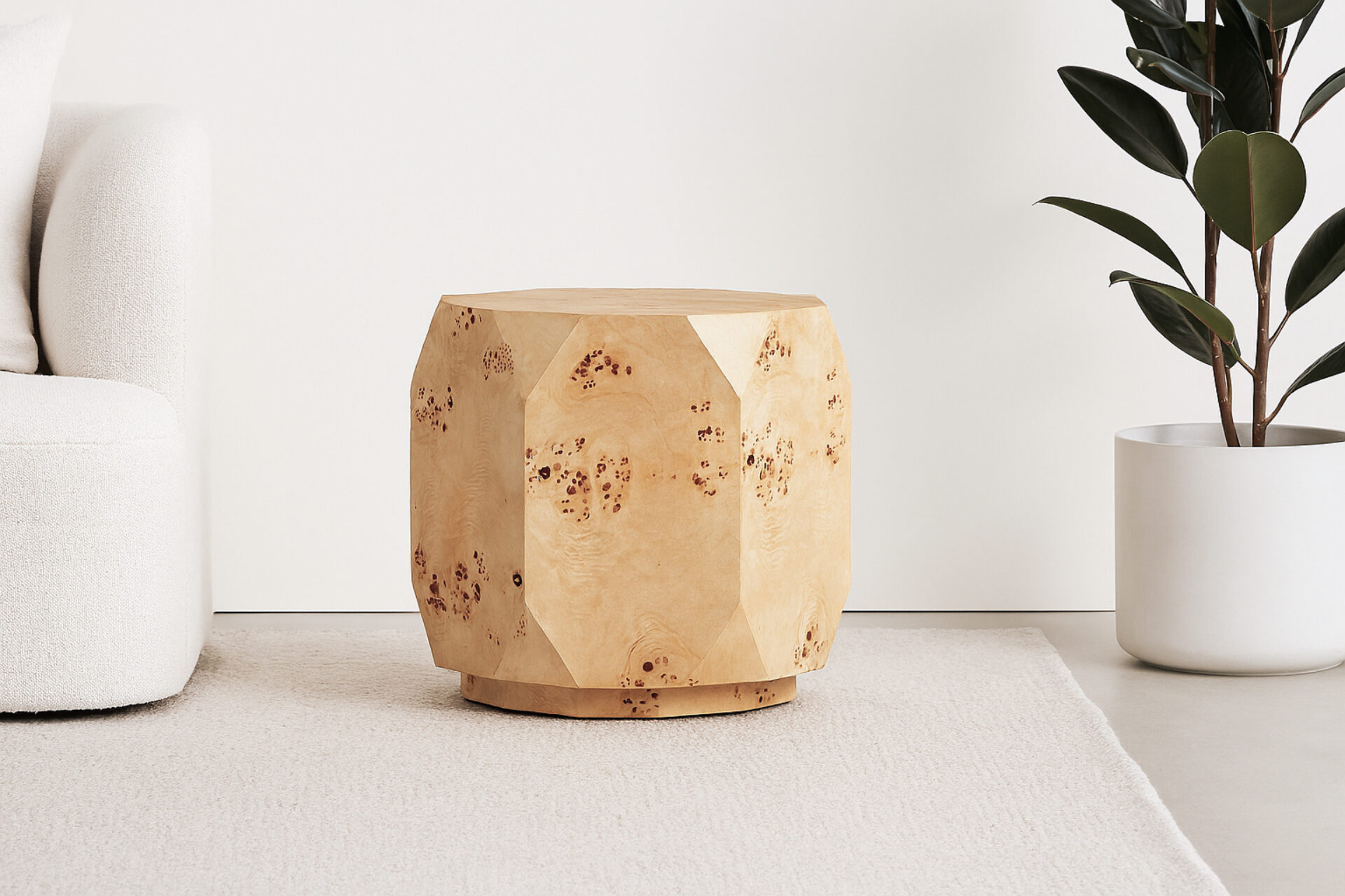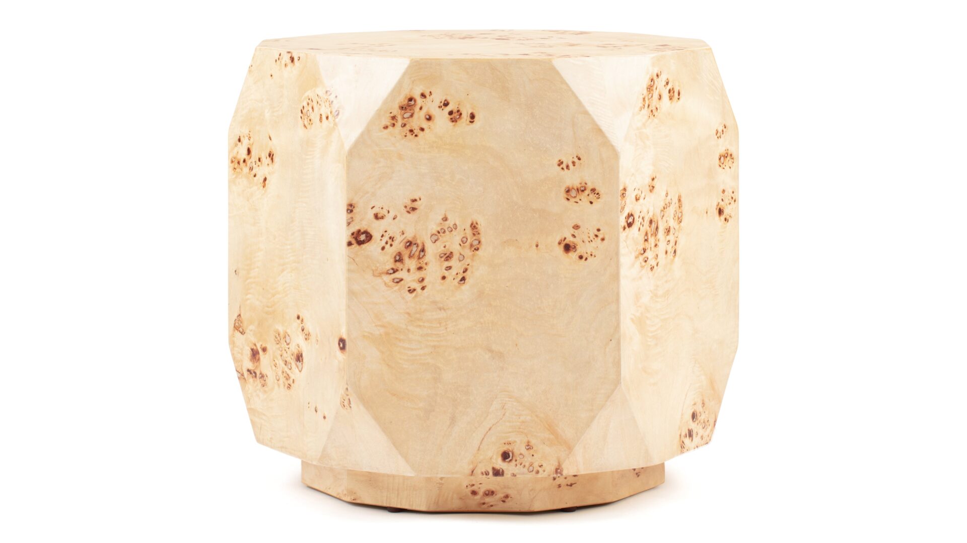 Introducing the alluring Callie Side Table, a fusion of modern design and natural allure. This finely crafted piece effortlessly enhances any living area with its unique charm and subtle sophistication. Its mesmerizing faceted geometric form, with a natural burl wood veneer finish, creates a visually stunning silhouette. The Callie Side Table is a versatile statement piece that seamlessly adjusts to your unique style and preferences, destined to be the focal point of any space for years to come.