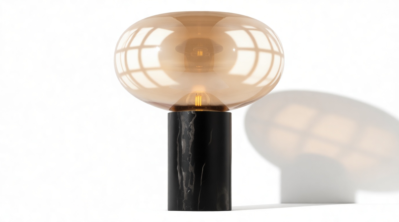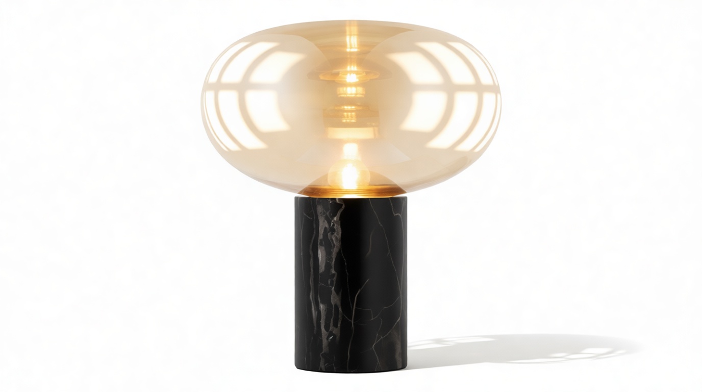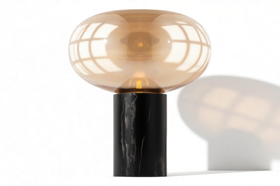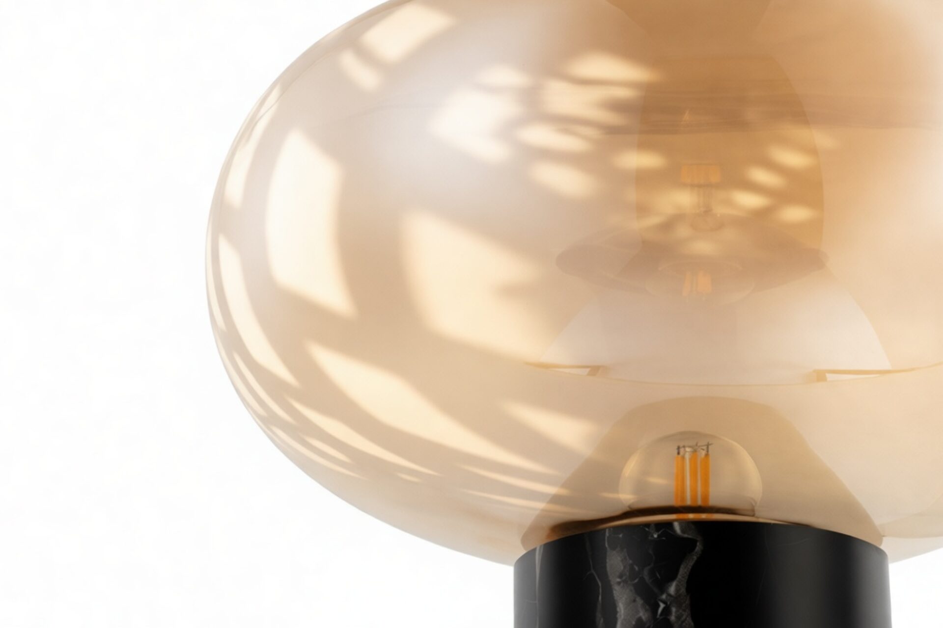Expertly crafted with meticulous attention to detail, the lamp's glass curves elegantly manipulate ambient light, showcasing a captivating interplay of shadows and illumination. Complementing this, the durable Black Marquina marble base introduces a touch of refinement, anchoring the lamp in a discreet yet significant manner.