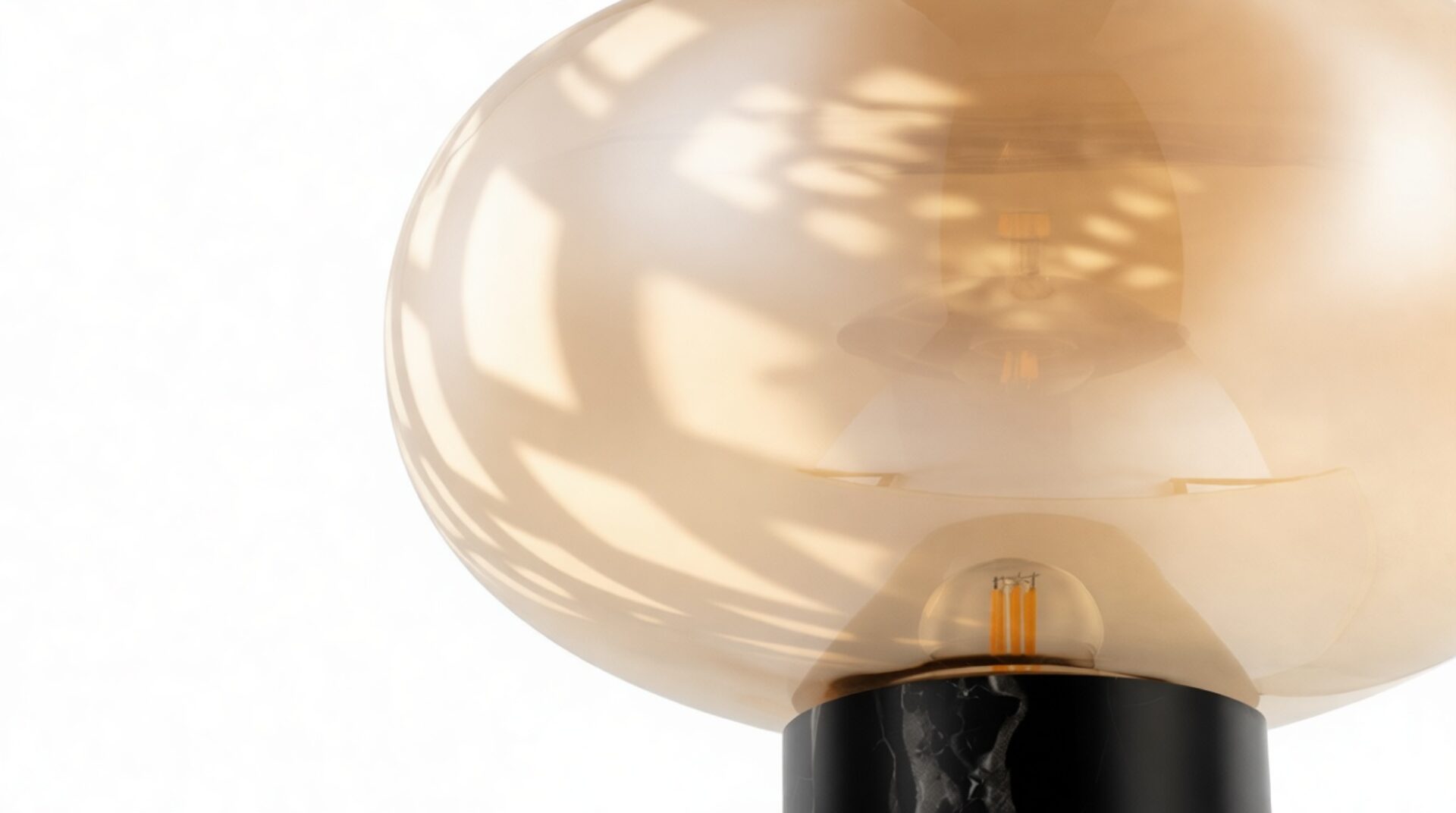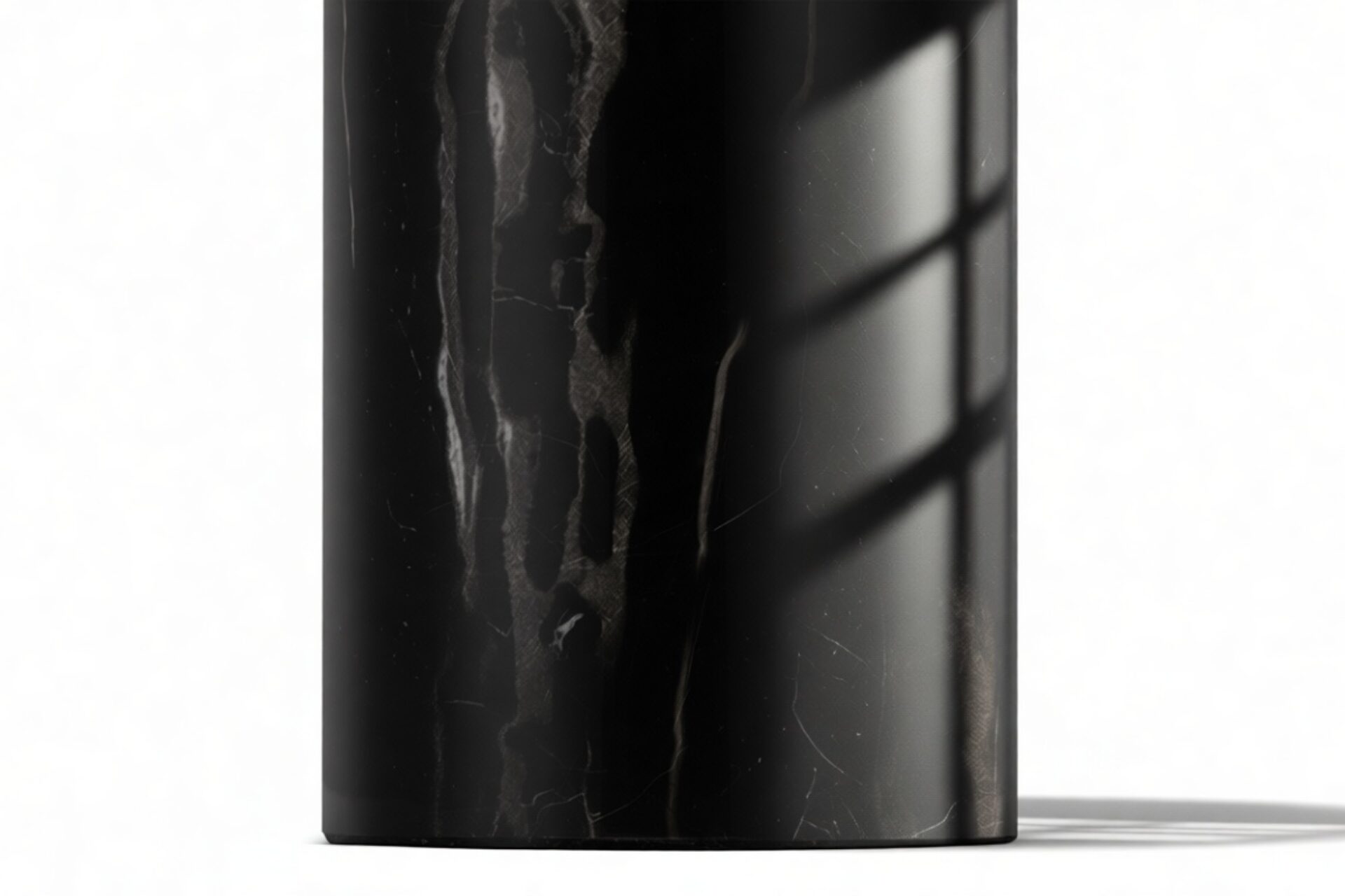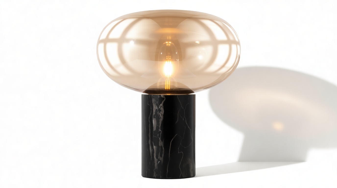 Expertly crafted with meticulous attention to detail, the lamp's glass curves elegantly manipulate ambient light, showcasing a captivating interplay of shadows and illumination. Complementing this, the durable Black Marquina marble base introduces a touch of refinement, anchoring the lamp in a discreet yet significant manner.
