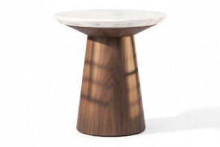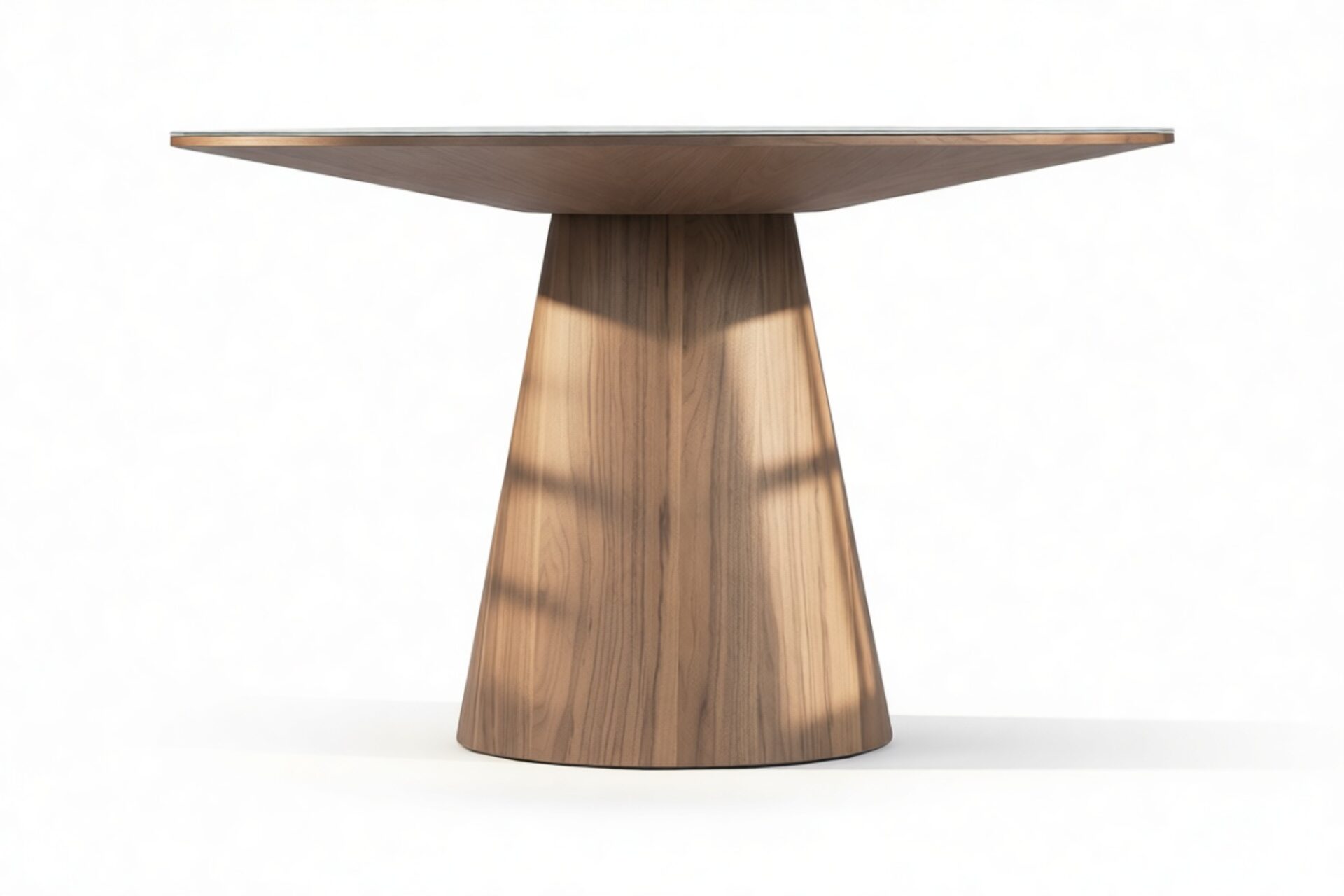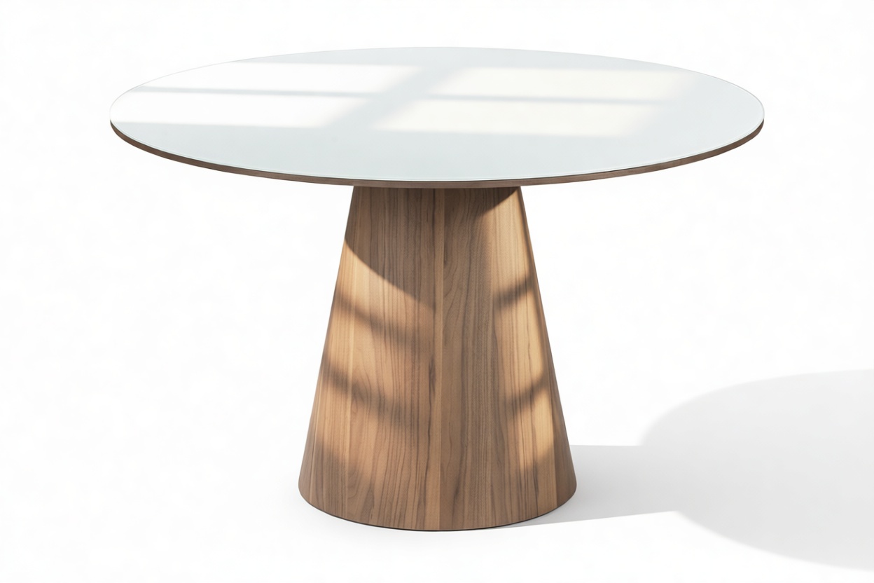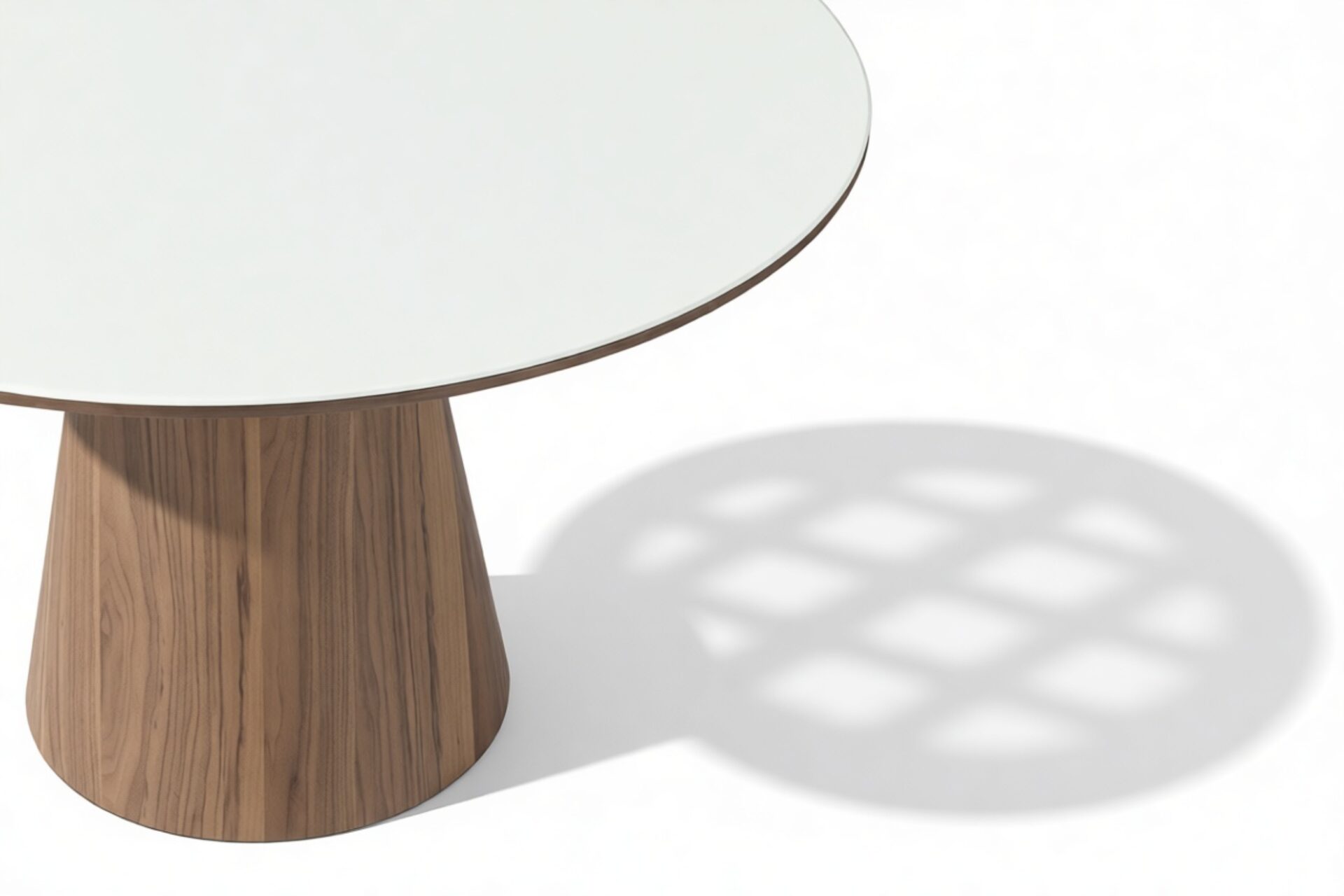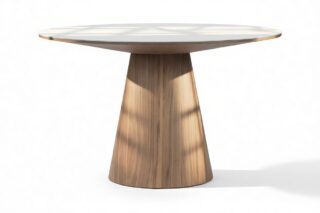 Experience a stunning contrast between the sleek surface and natural wood grain with the Cellier Dining Table. This exquisite piece is meticulously designed with your choice of ceramic or white translucent glass tabletop, elegantly paired with a luxurious walnut base. The combination adds warmth and texture, enhancing the refined form of the Cellier Dining Table.