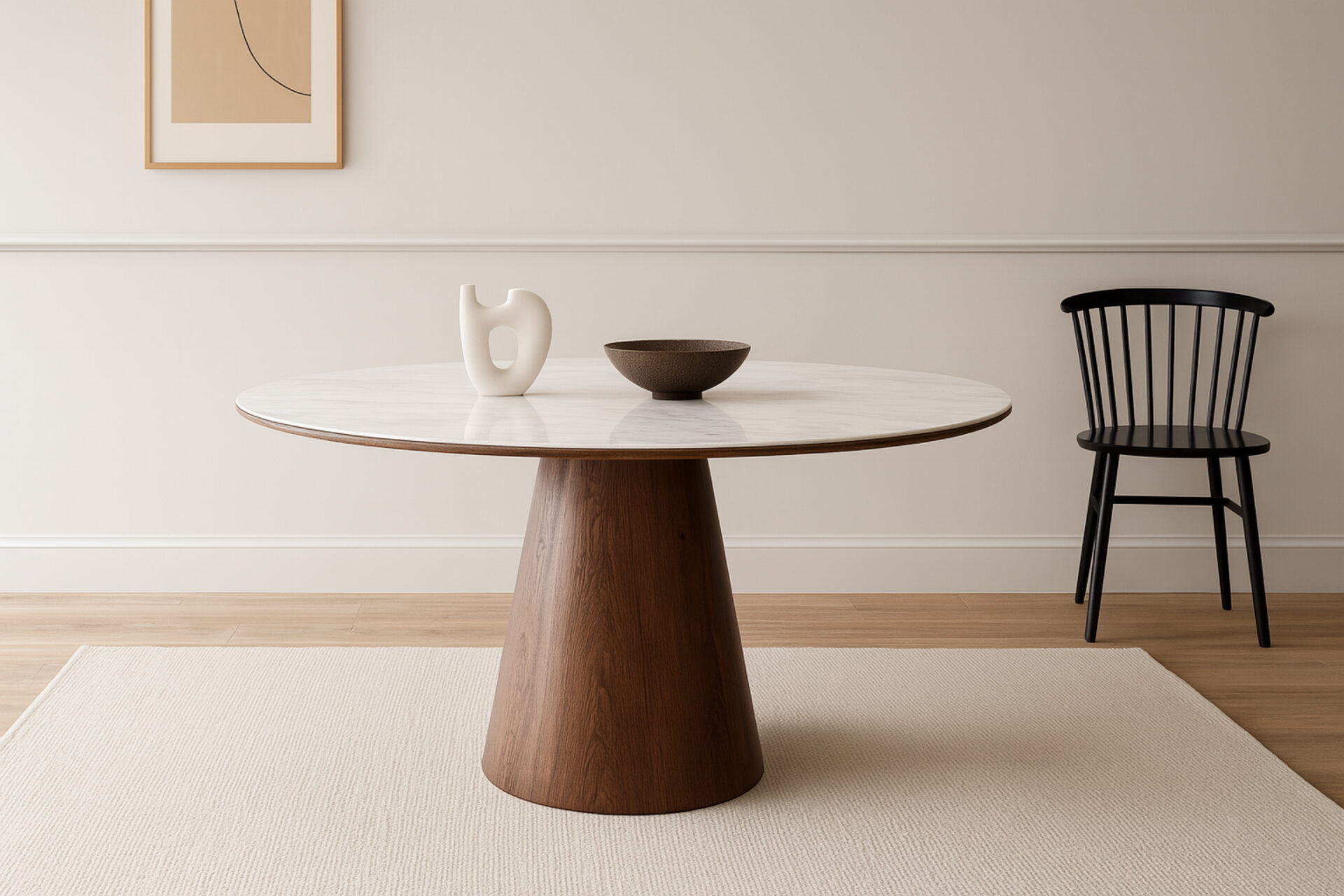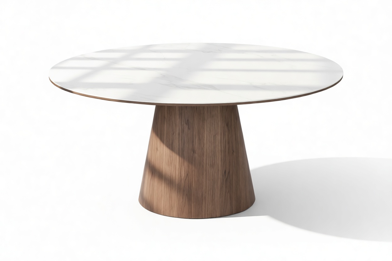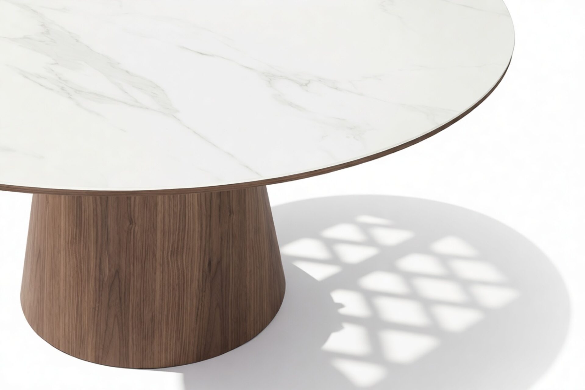 Unleash modern sophistication with the Cellier Dining Table, unveiling a sleek pedestal base and airy tabletop design for a perfect blend of function and elegance. The striking marble-look ceramic tabletop, paired with a luxurious walnut base, exudes chic contrast. Available in two sizes for entertaining four or six guests with style, this table is a must-have for contemporary dining spaces.