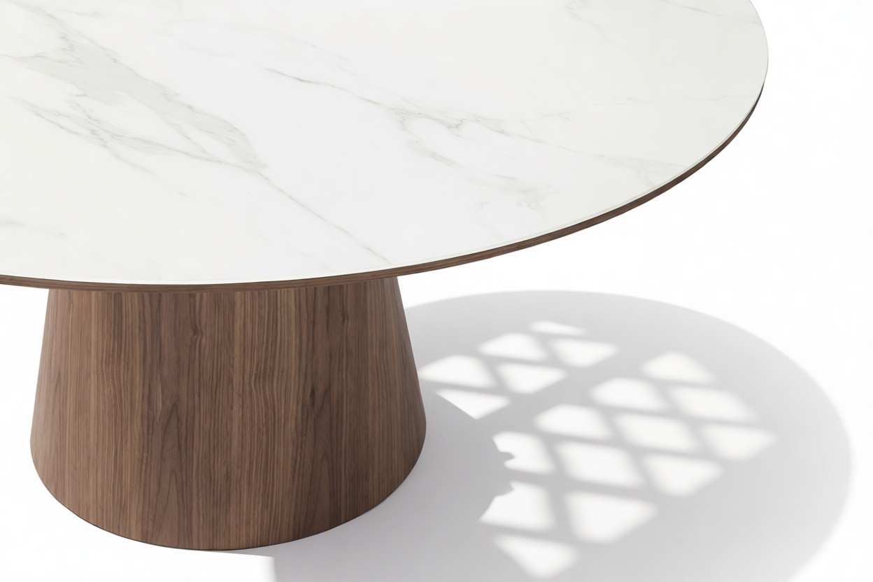 Experience a stunning contrast between the sleek surface and natural wood grain with the Cellier Dining Table. This exquisite piece is meticulously designed with your choice of ceramic or white translucent glass tabletop, elegantly paired with a luxurious walnut base. The combination adds warmth and texture, enhancing the refined form of the Cellier Dining Table.