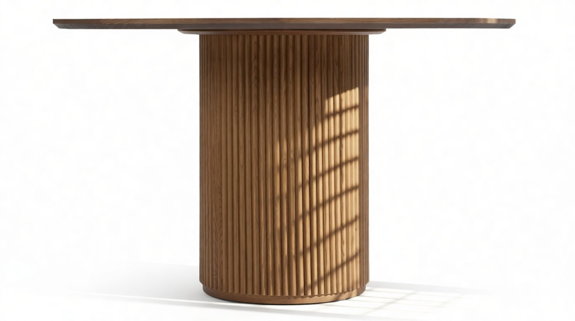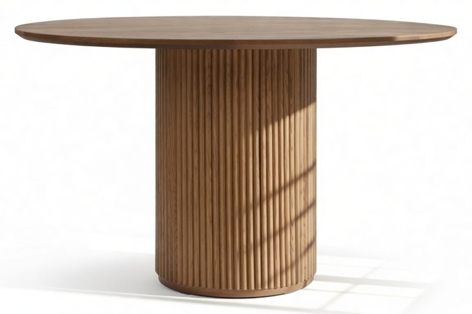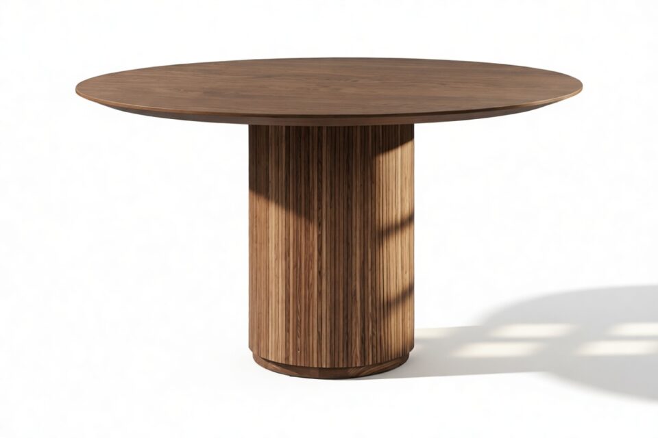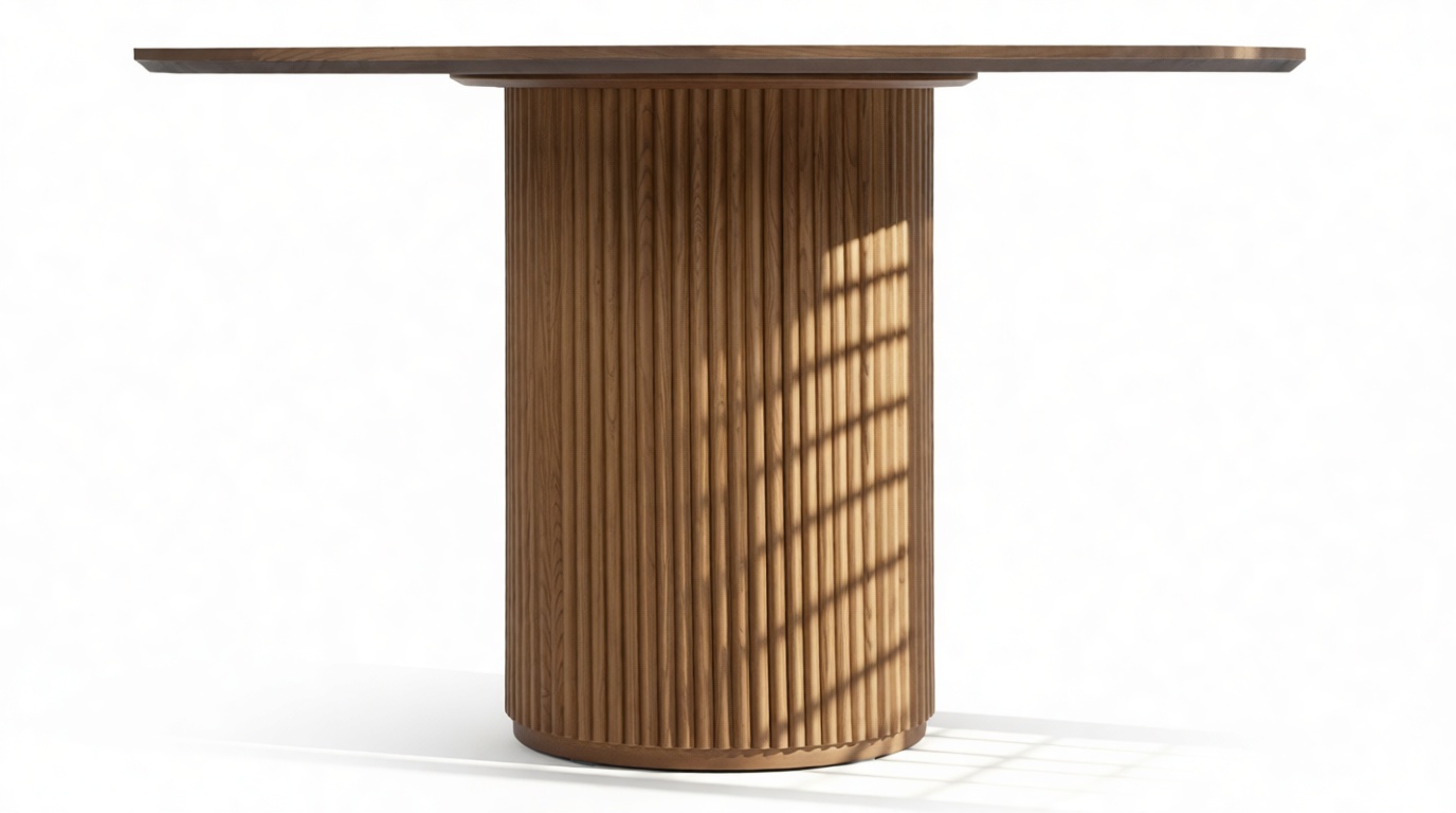 Elegantly blending modern and traditional aesthetics, the Cellule dining table is a contemporary masterpiece crafted from durable walnut-finished hardwood. The iconic design features a sleek round top with a beveled edge, supported by a substantial reeded base. This exquisite table offers a versatile dining solution, seamlessly harmonizing with any dining space.