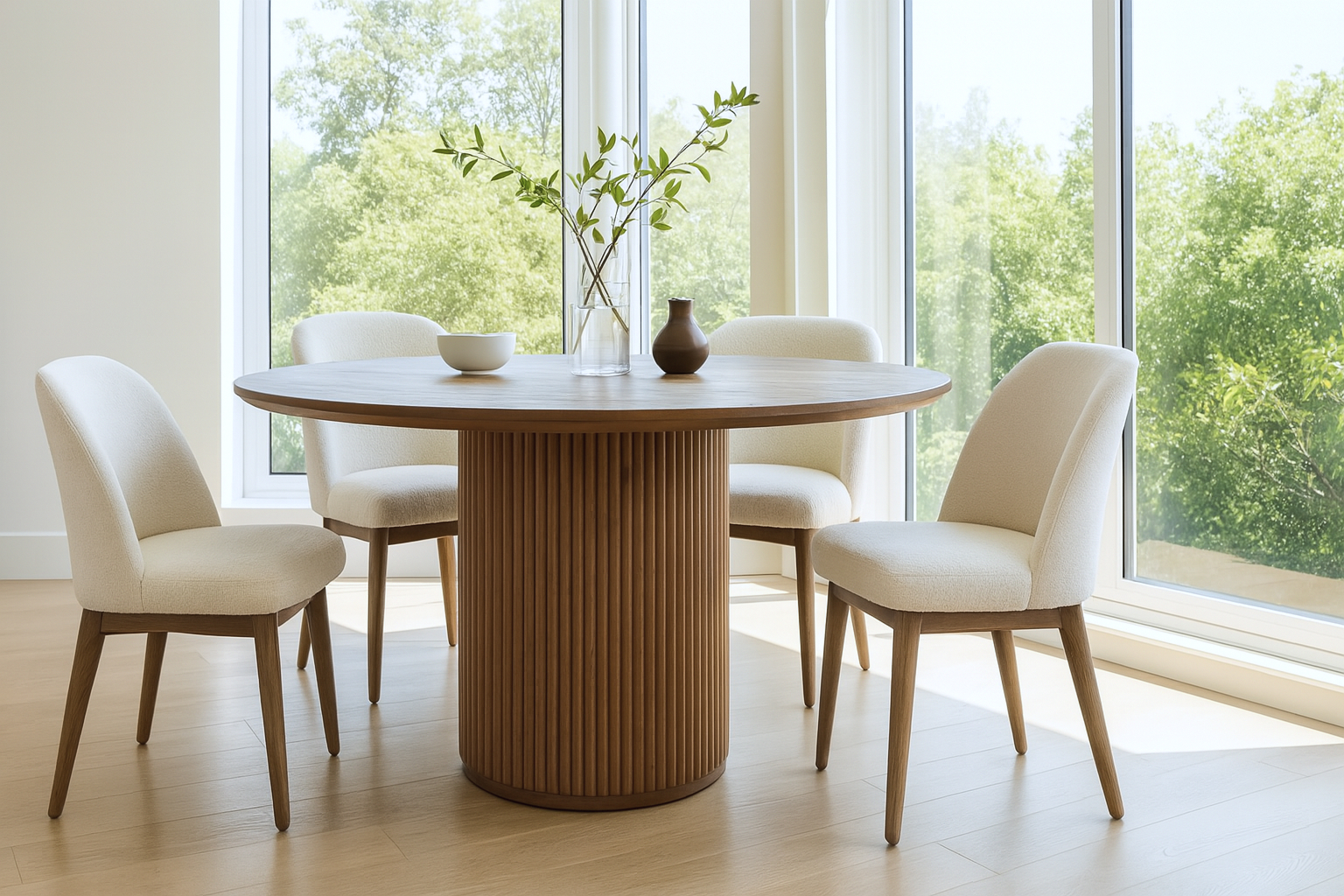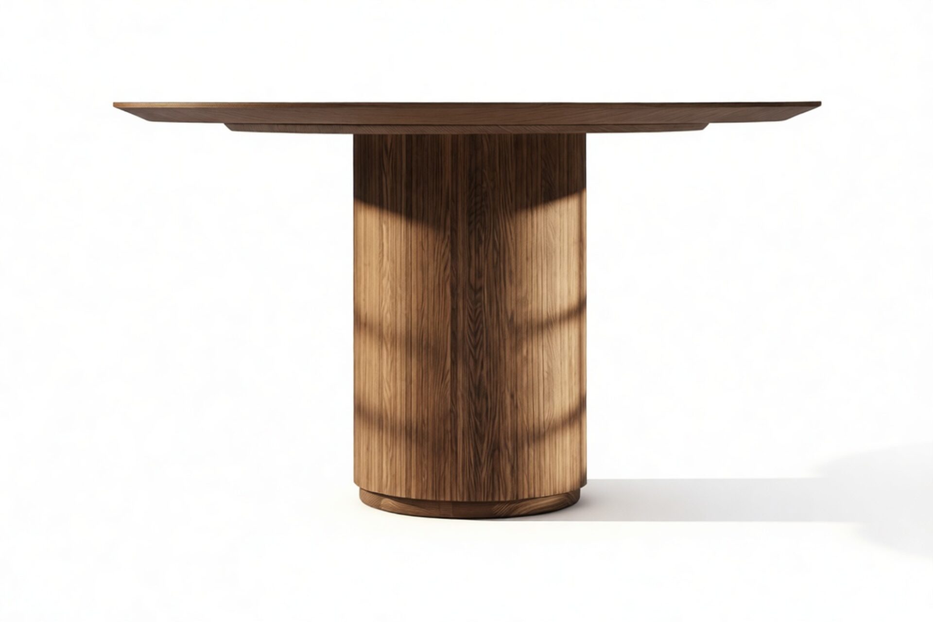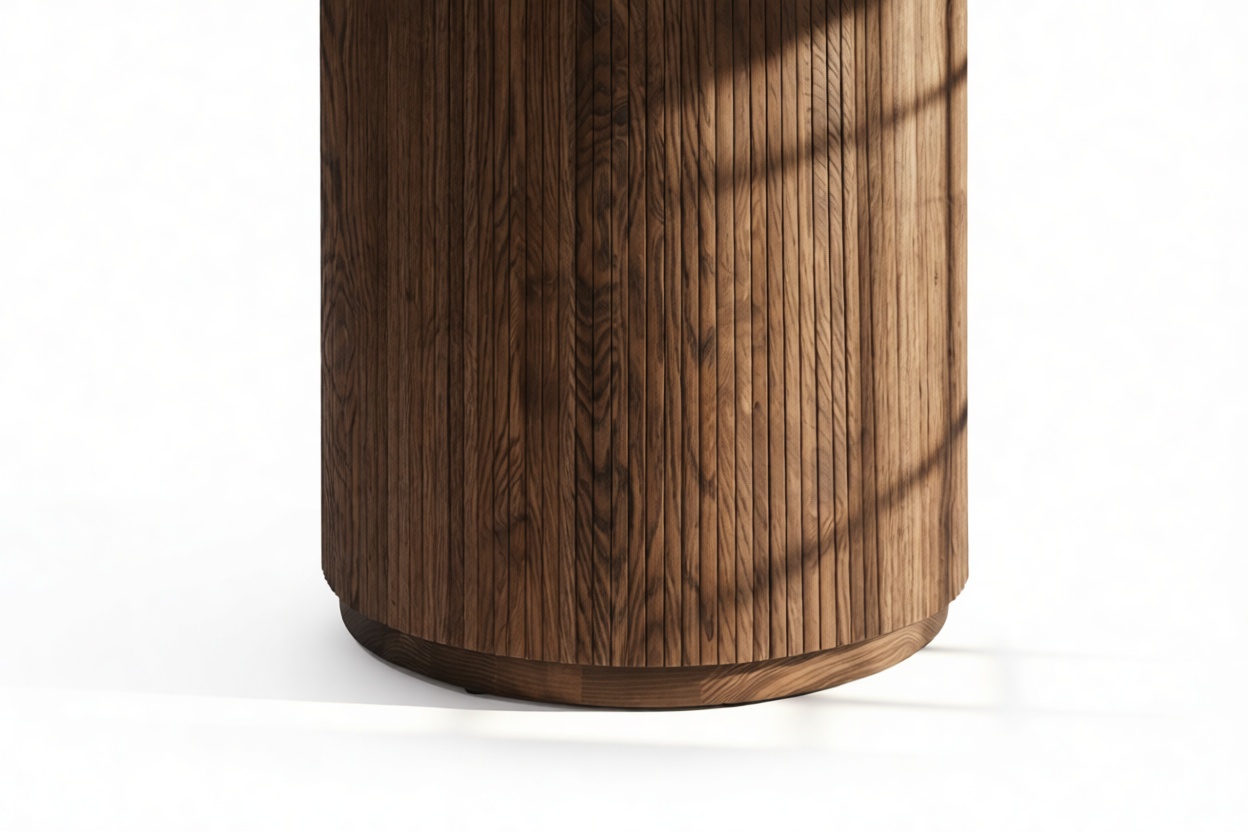 Elegantly blending modern and traditional aesthetics, the Cellule dining table is a contemporary masterpiece crafted from durable walnut-finished hardwood. The iconic design features a sleek round top with a beveled edge, supported by a substantial reeded base. This exquisite table offers a versatile dining solution, seamlessly harmonizing with any dining space.