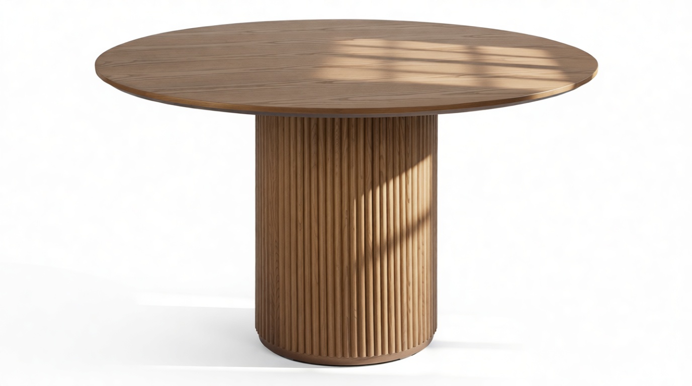 Crafted from hardwood with a walnut finish, this exquisite modern table showcases a round top enhanced by a beveled edge, and a sturdy pedestal base elegantly accented with reeding.