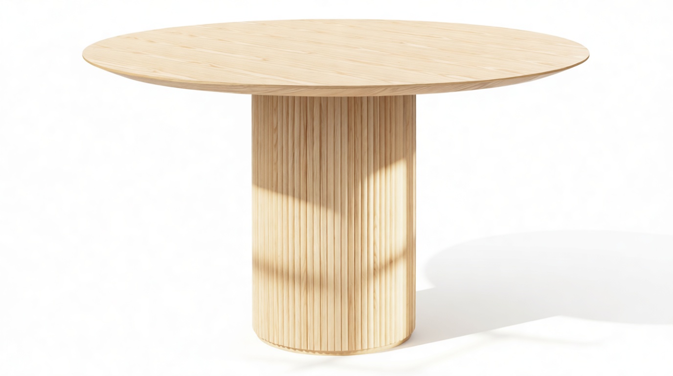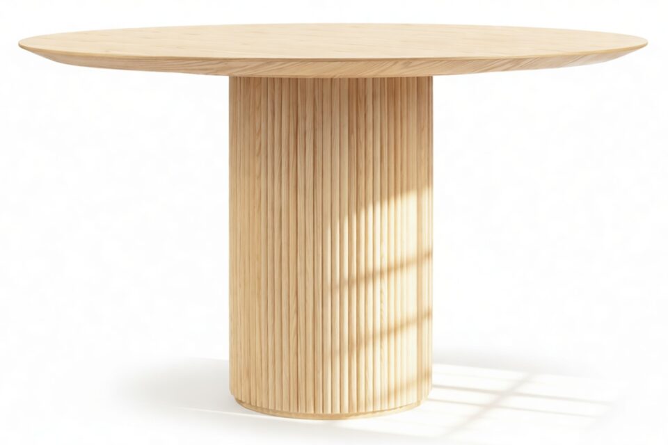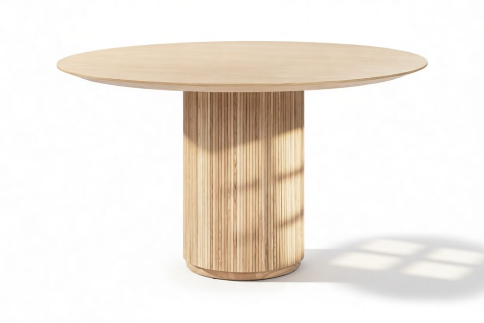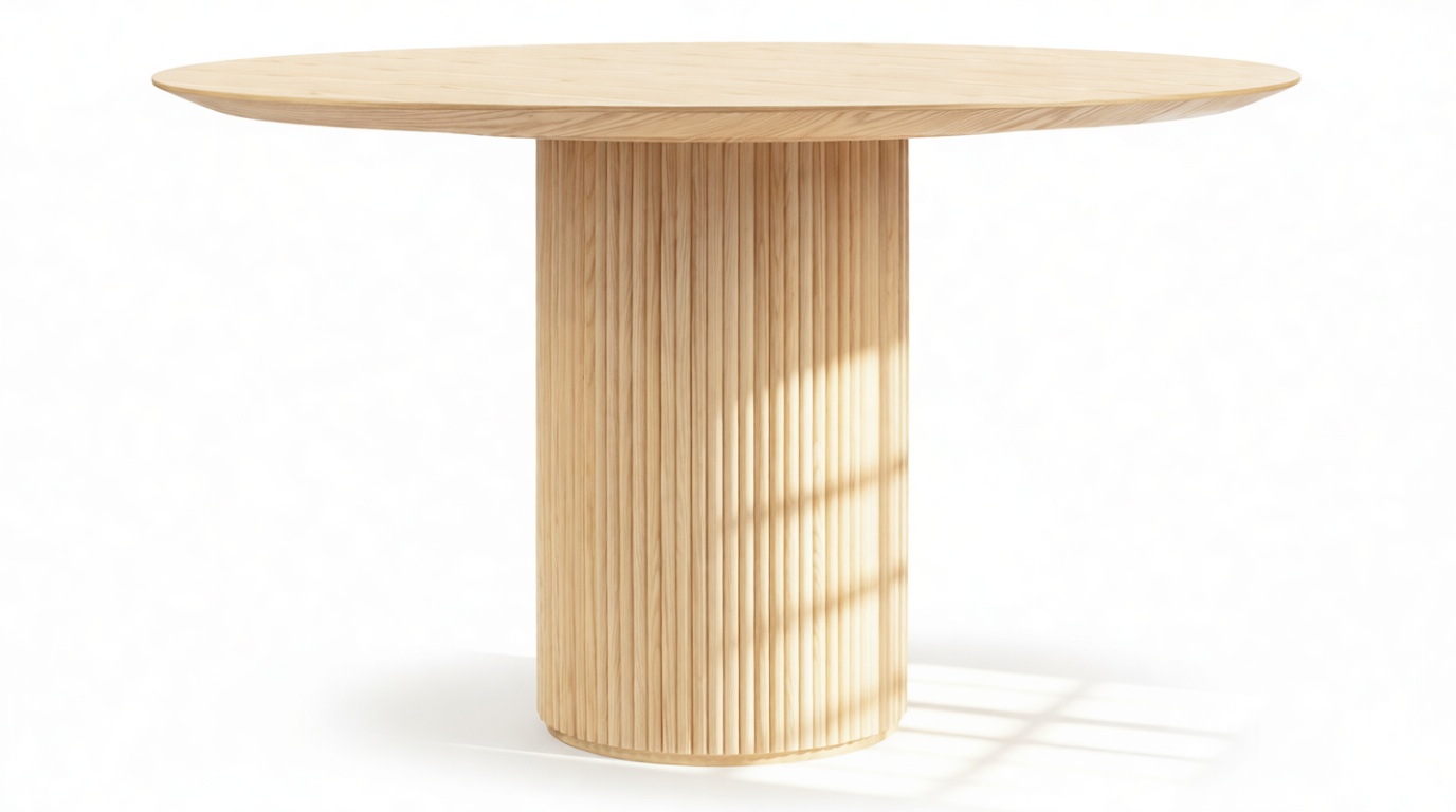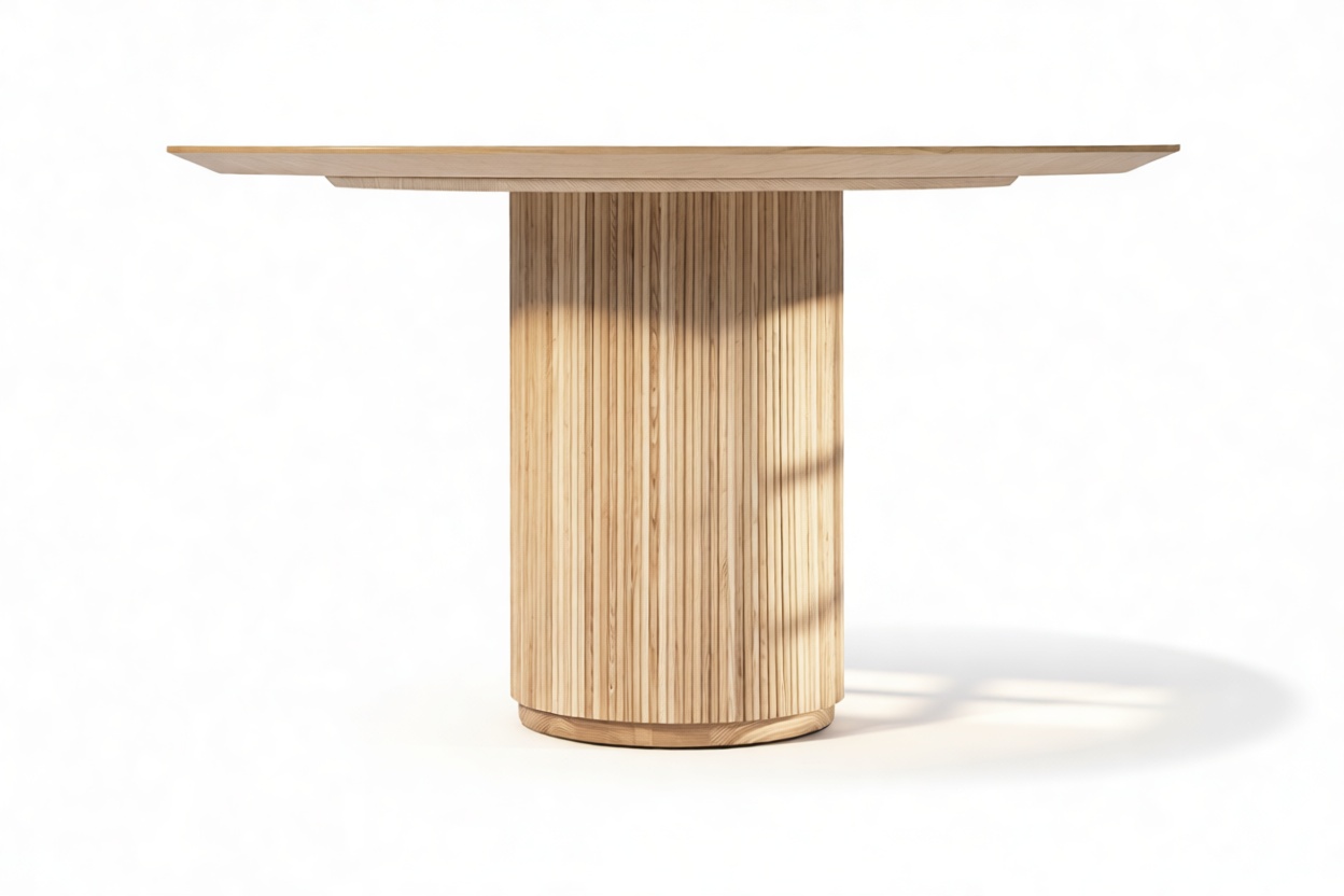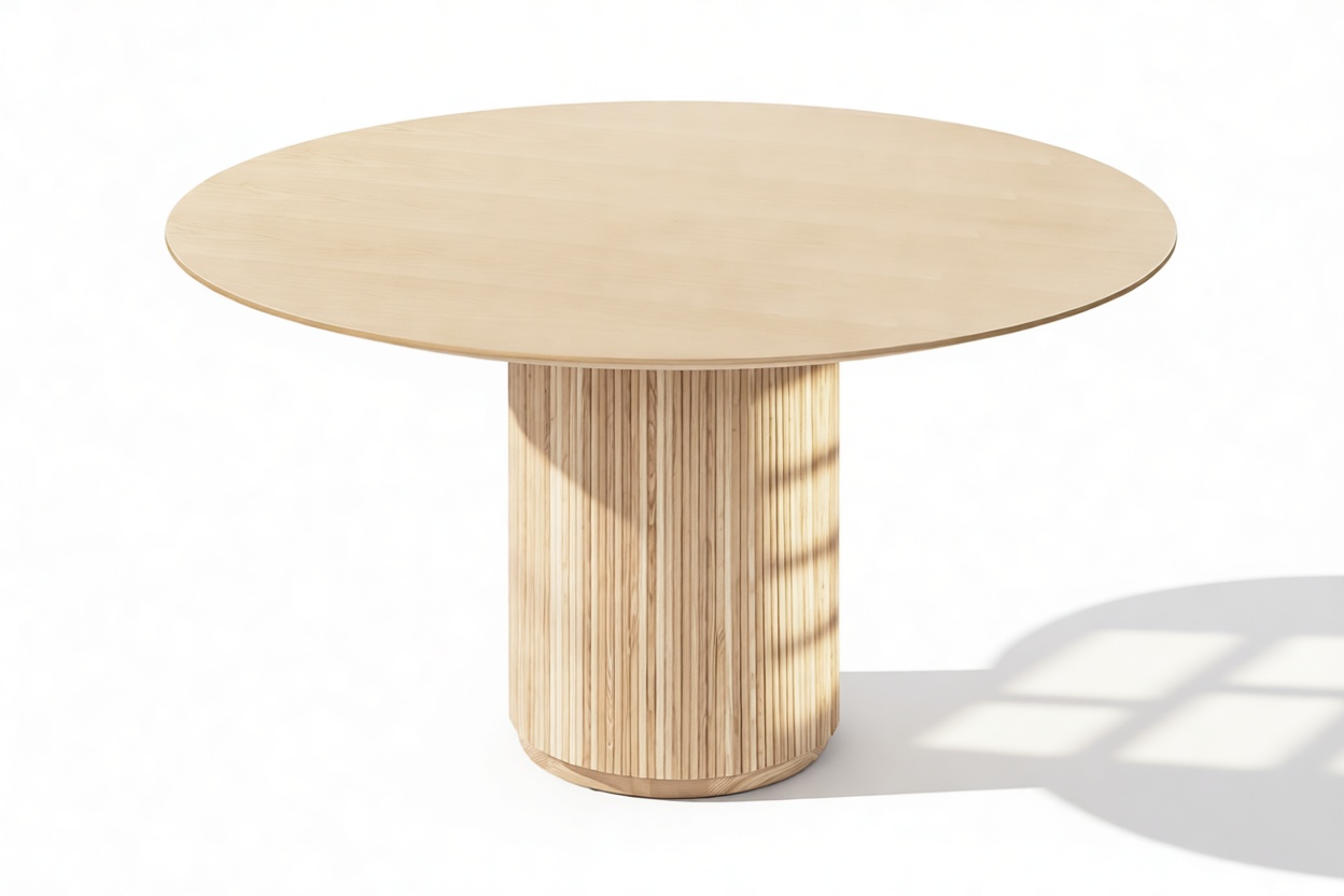 Crafted from ash hardwood in a coated natural finish, this exquisite modern table showcases a circular top enhanced by its beveled edge and a substantial pedestal base, elegantly balanced with ash reeding.