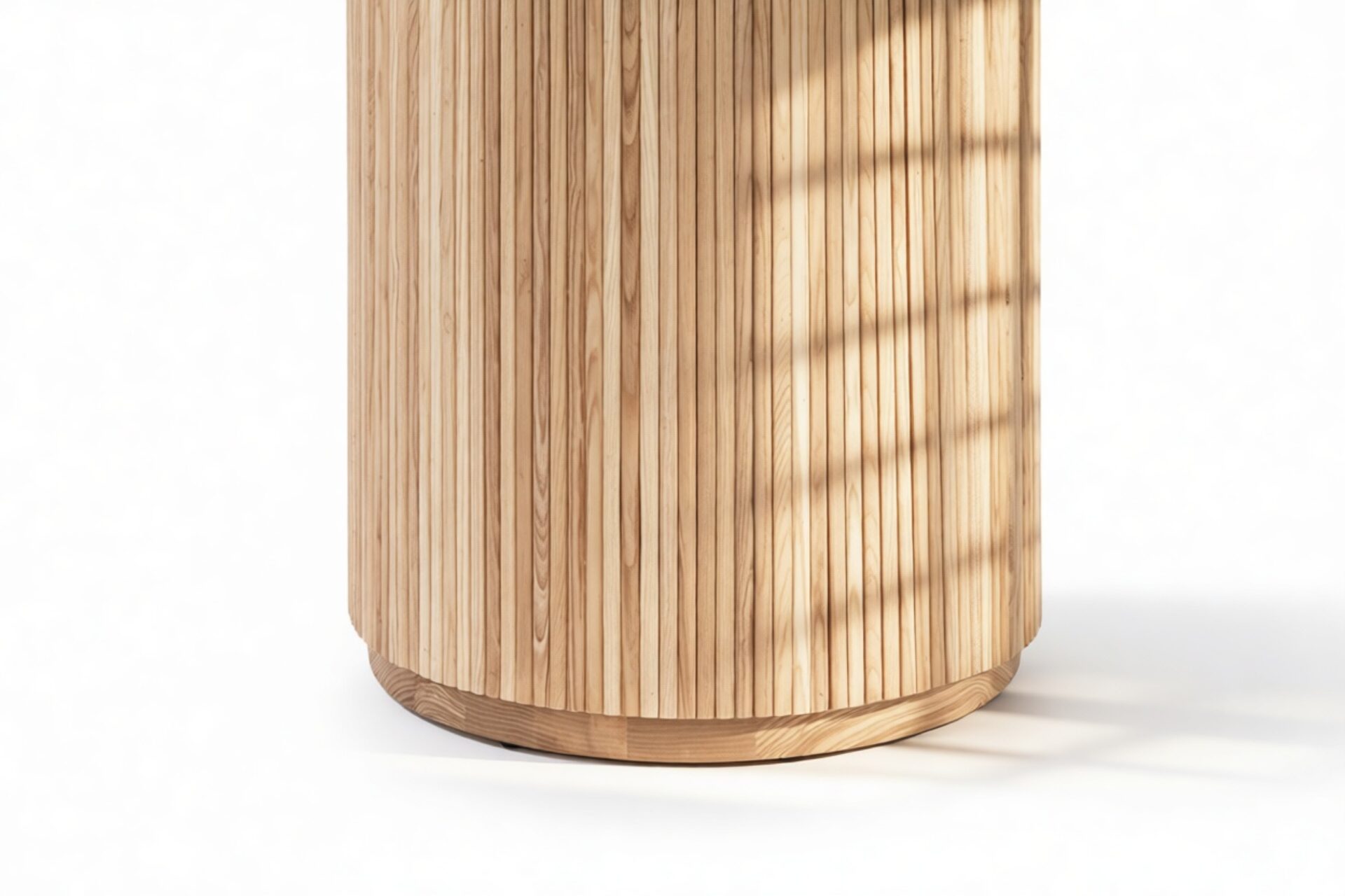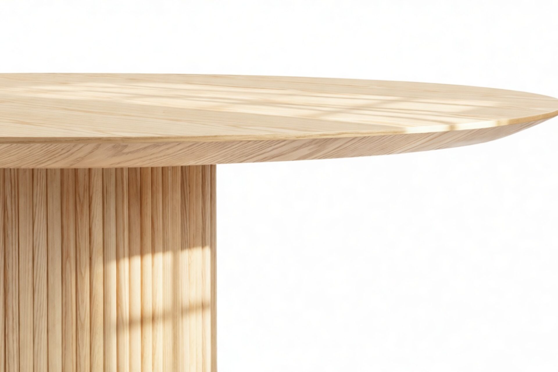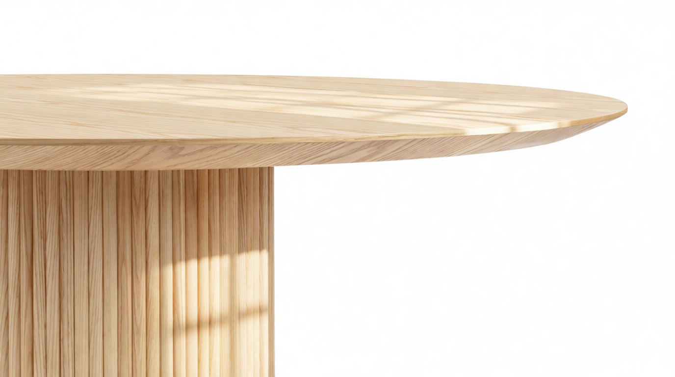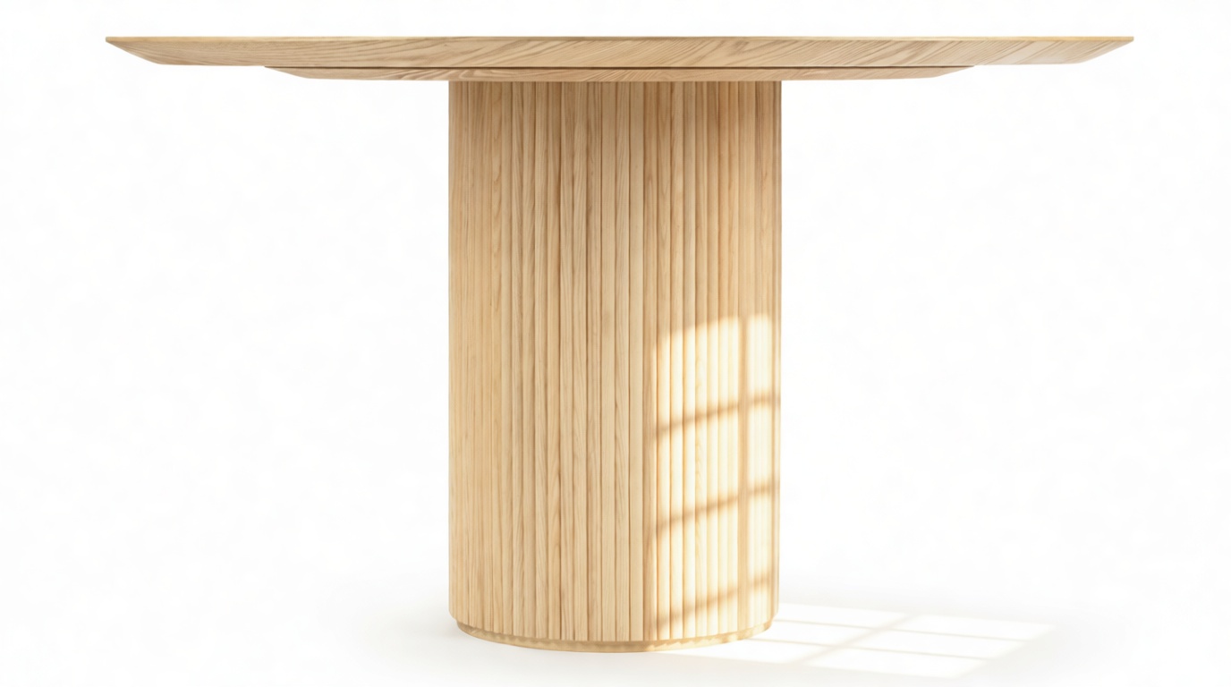 Crafted from ash hardwood in a coated natural finish, this exquisite modern table showcases a circular top enhanced by its beveled edge and a substantial pedestal base, elegantly balanced with ash reeding.