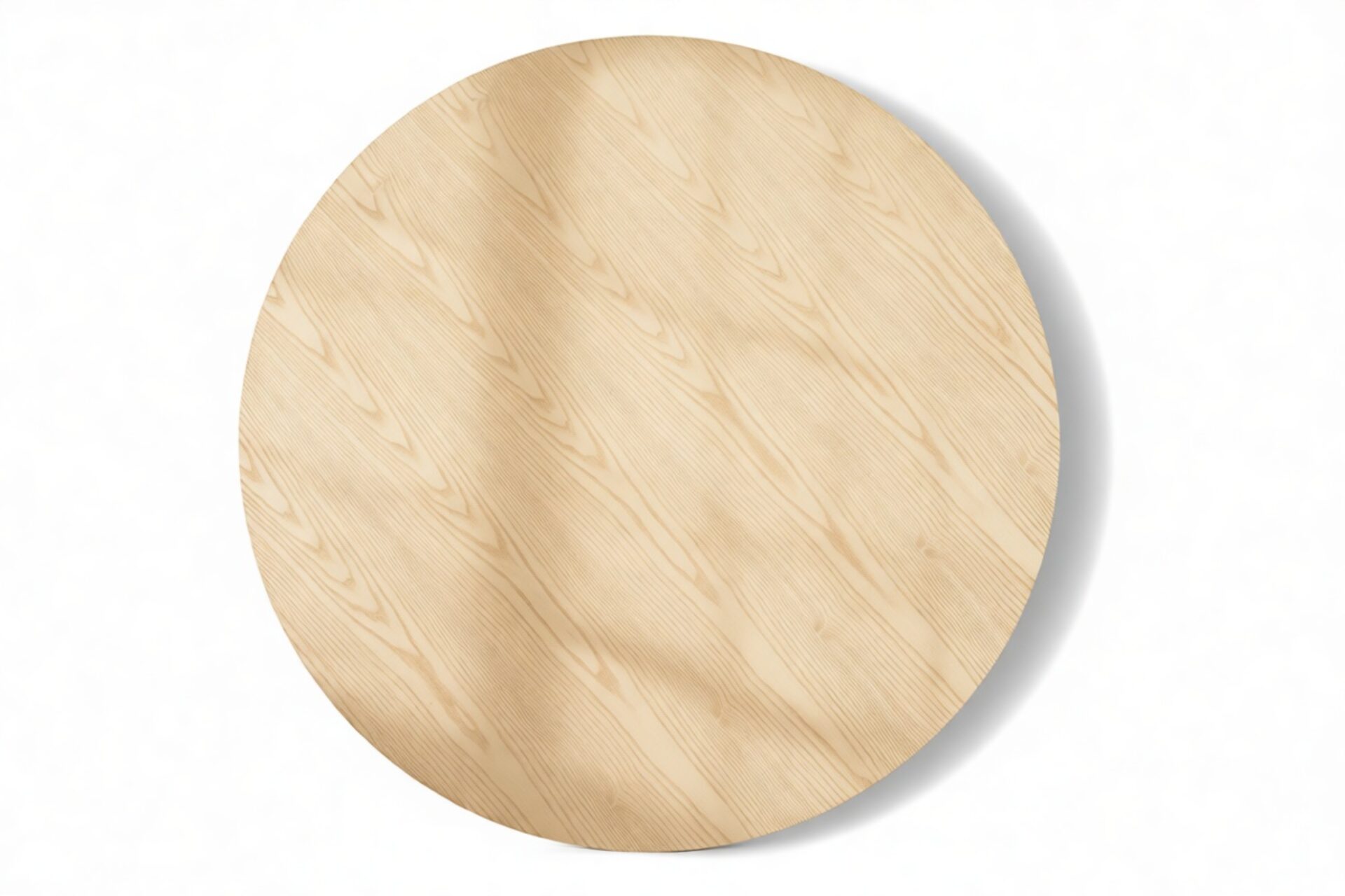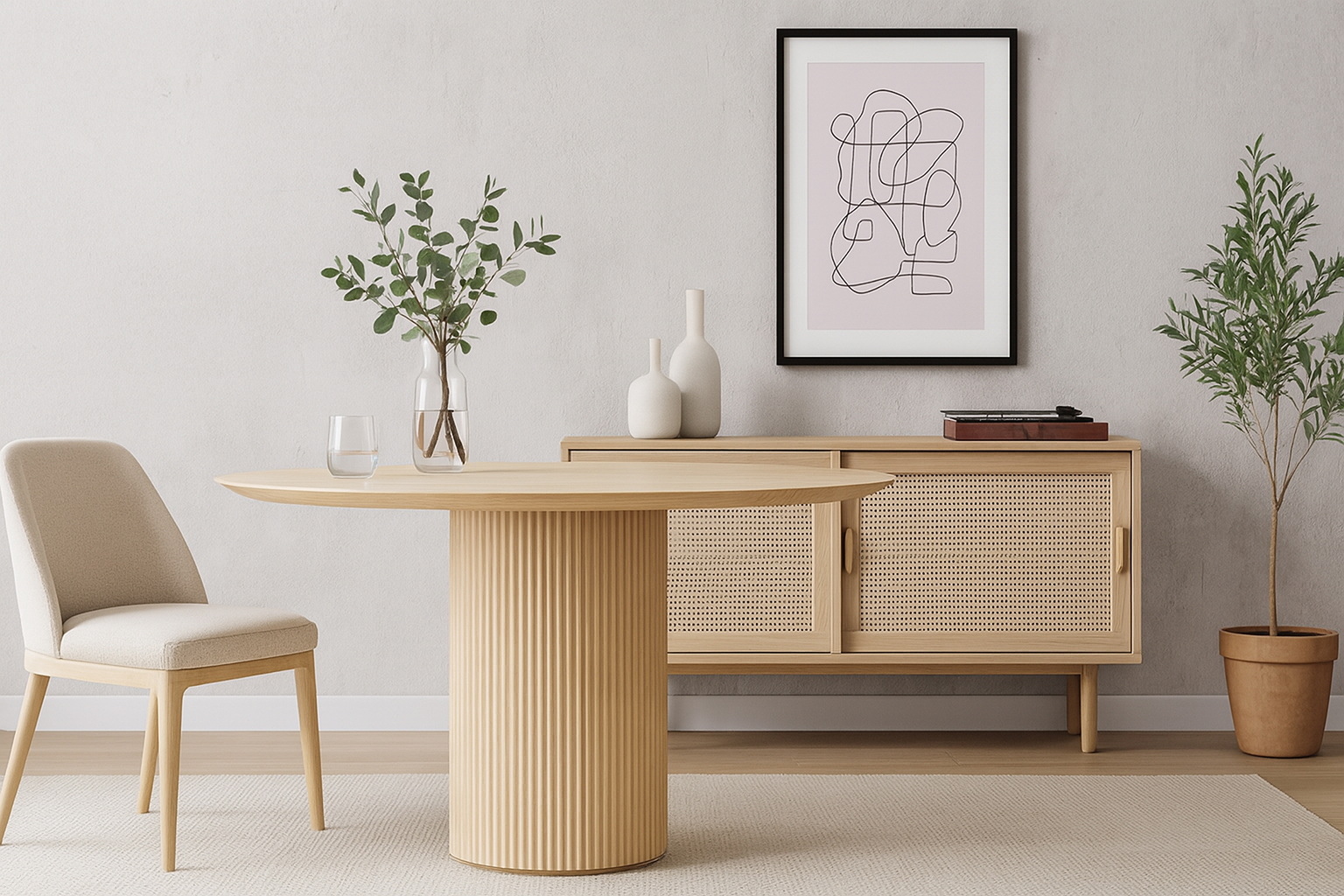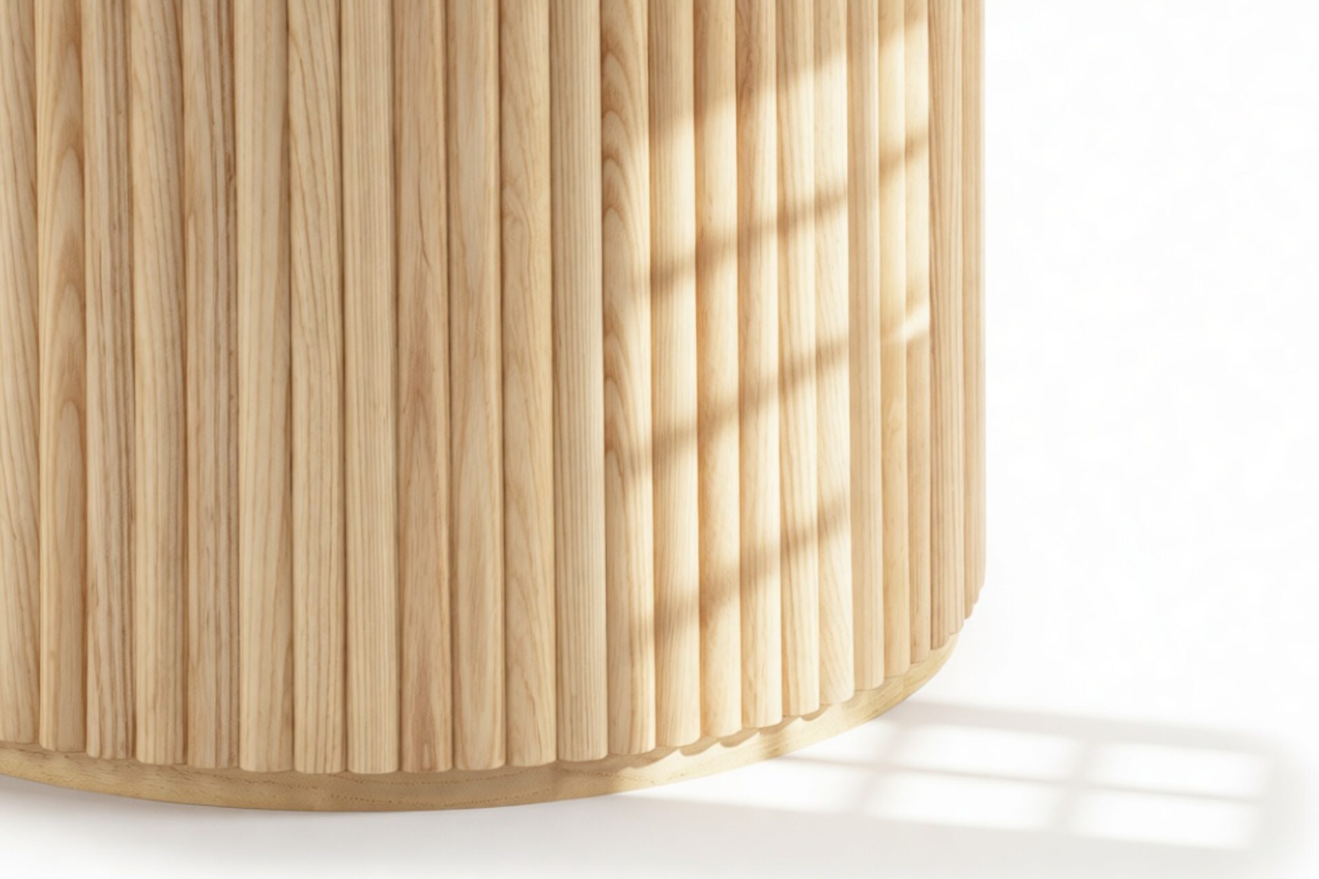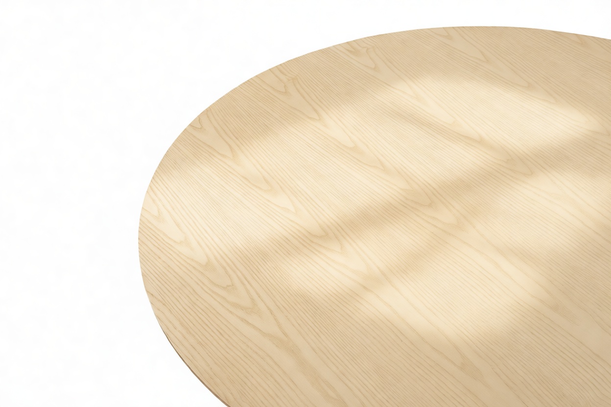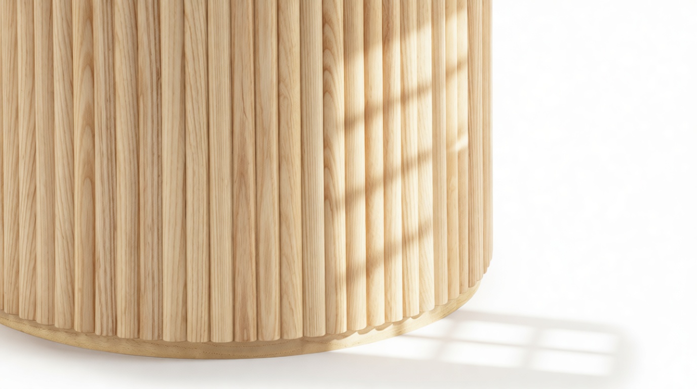 Crafted from ash hardwood in a coated natural finish, this exquisite modern table showcases a circular top enhanced by its beveled edge and a substantial pedestal base, elegantly balanced with ash reeding.