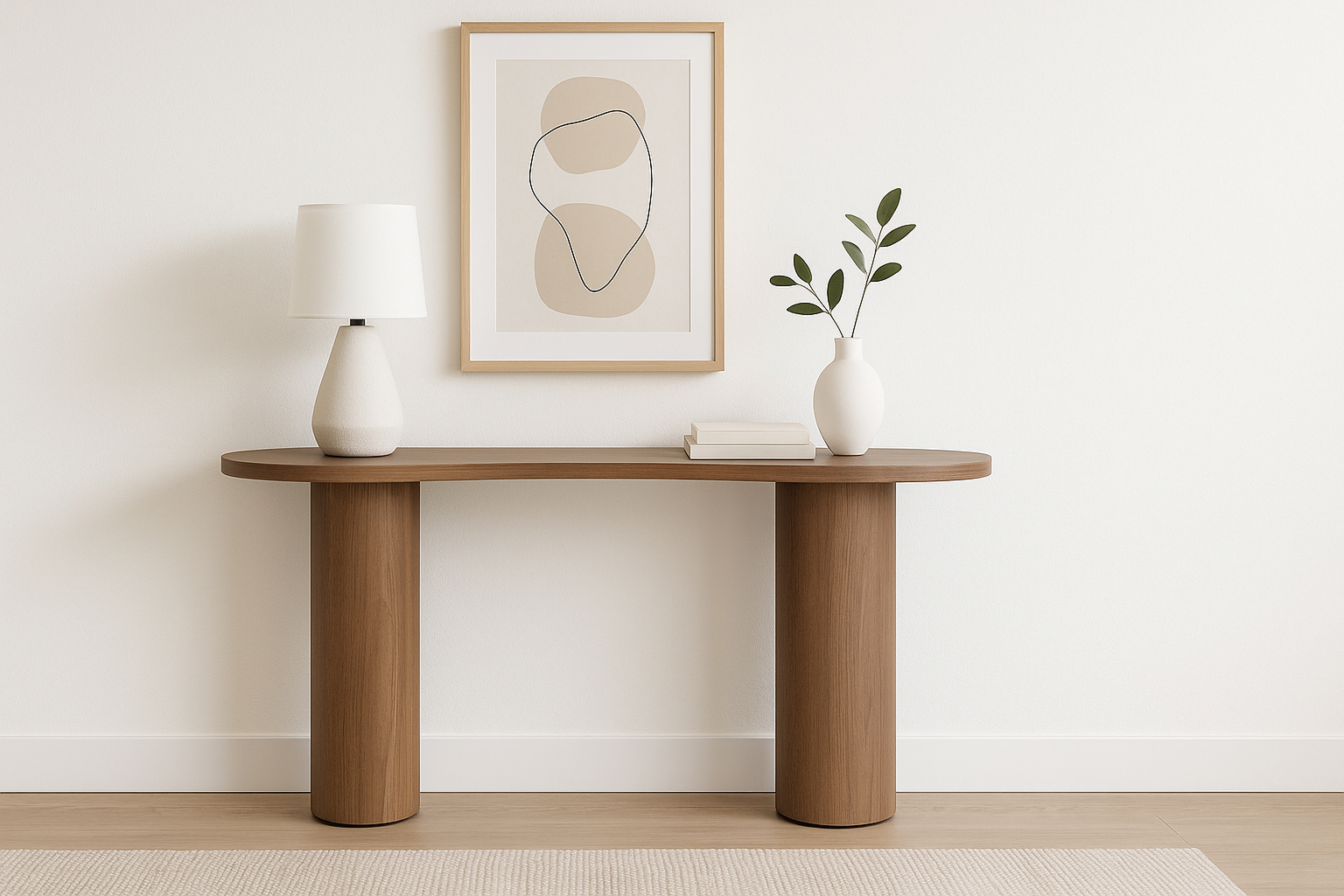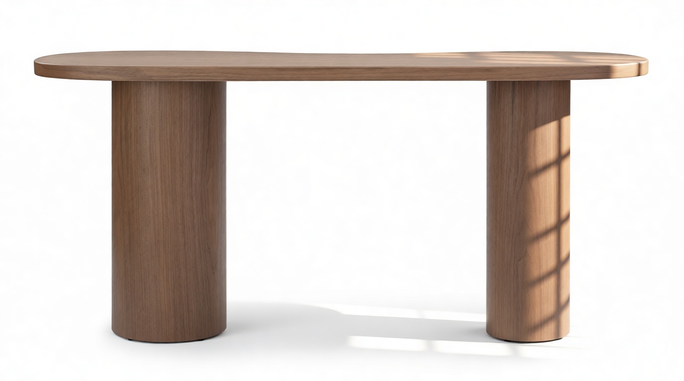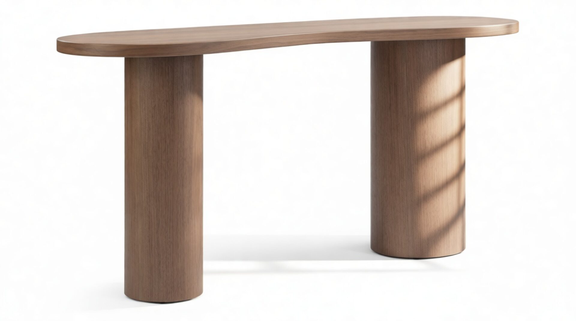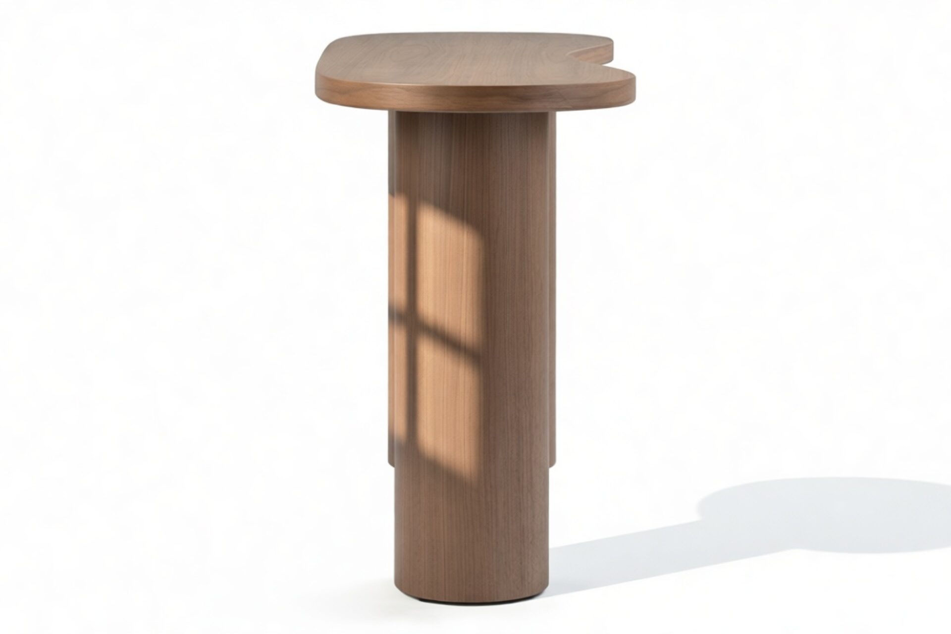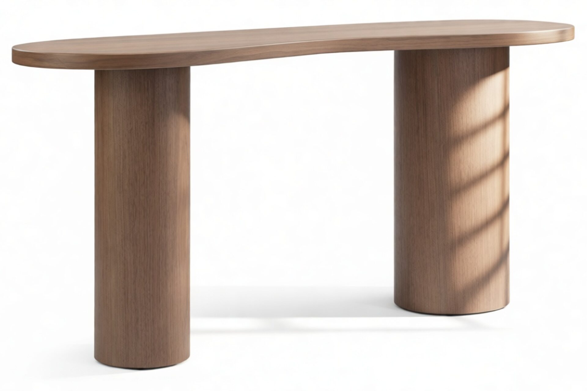 Elevate your space with the Centro Console Table - a contemporary masterpiece marrying organic shapes with minimalist design. Crafted from luxurious walnut veneer, its unique kidney-shaped top and striking cylindrical legs combine artistic allure with practical durability. Versatile in style, it seamlessly enhances modern, mid-century, and organic decors, making it a sophisticated and flexible centerpiece for any setting.