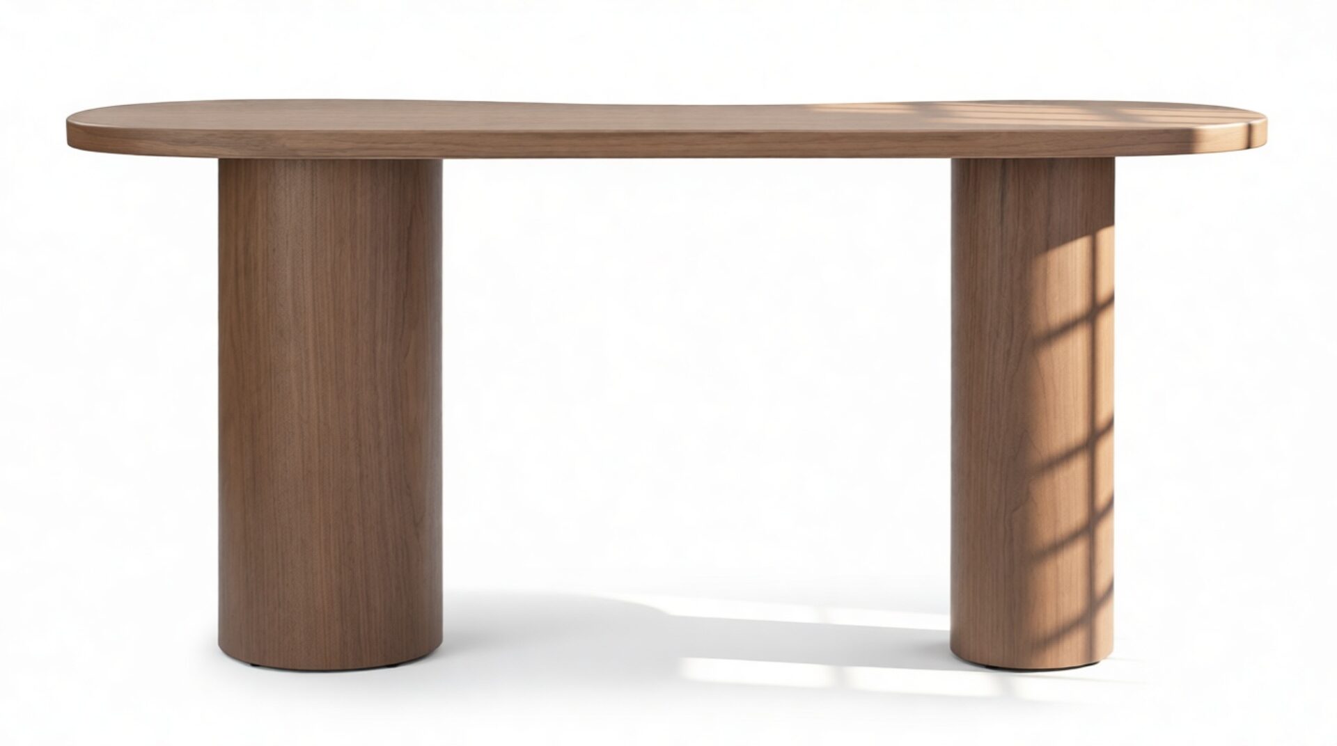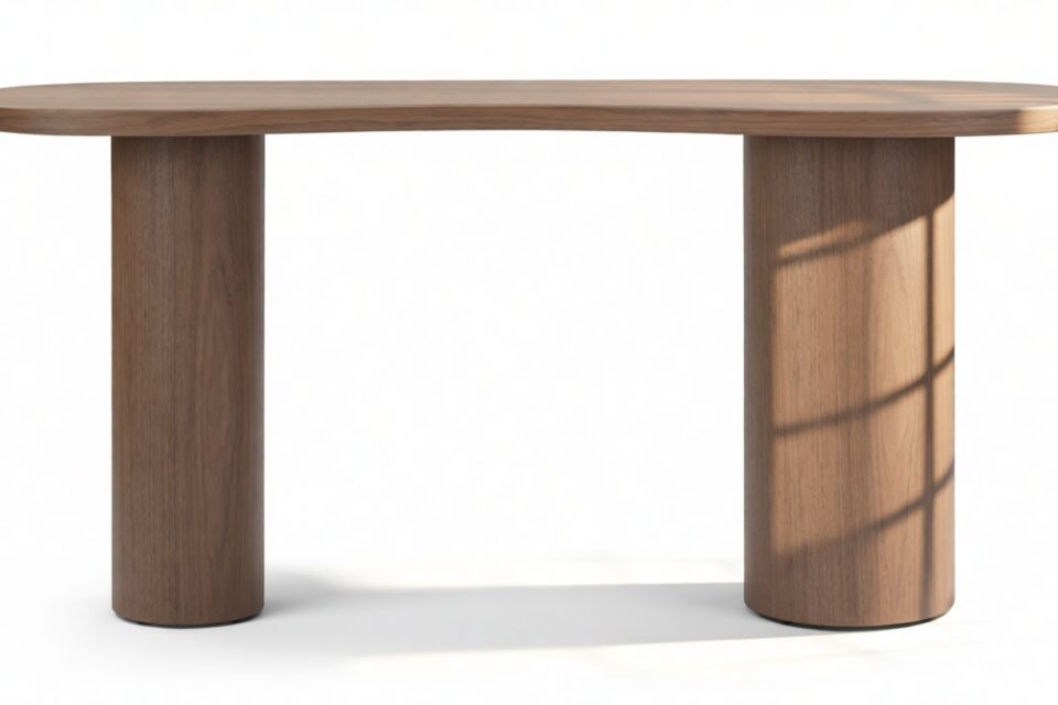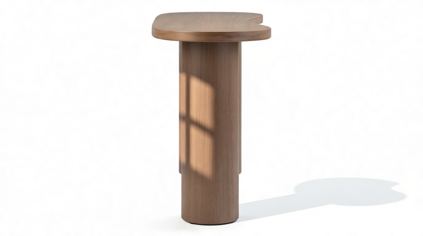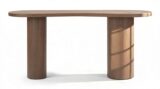 Discover the Centro Console Table, a contemporary masterpiece that seamlessly blends organic forms with minimalist aesthetics. Fashioned from luxurious walnut veneer, its unique kidney-shaped top showcases the natural beauty of the wood grain, offering a cozy and welcoming ambiance. Supported by two striking cylindrical legs, this table strikes a perfect harmony between artistic allure and practical durability, establishing itself as an elegant yet functional centerpiece in any setting.