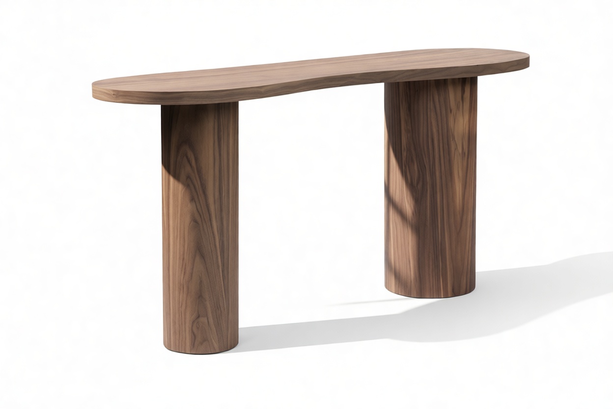 Elevate your space with the Centro Console Table - a contemporary masterpiece marrying organic shapes with minimalist design. Crafted from luxurious walnut veneer, its unique kidney-shaped top and striking cylindrical legs combine artistic allure with practical durability. Versatile in style, it seamlessly enhances modern, mid-century, and organic decors, making it a sophisticated and flexible centerpiece for any setting.