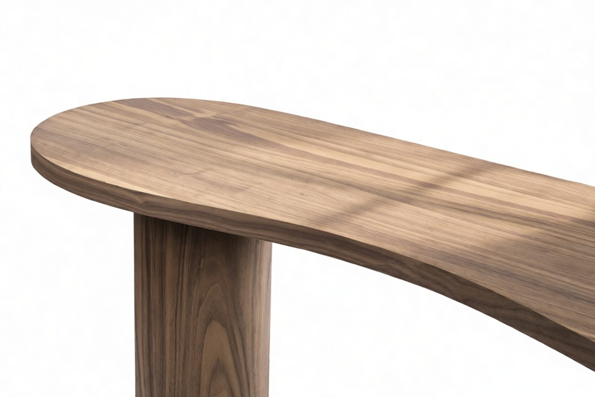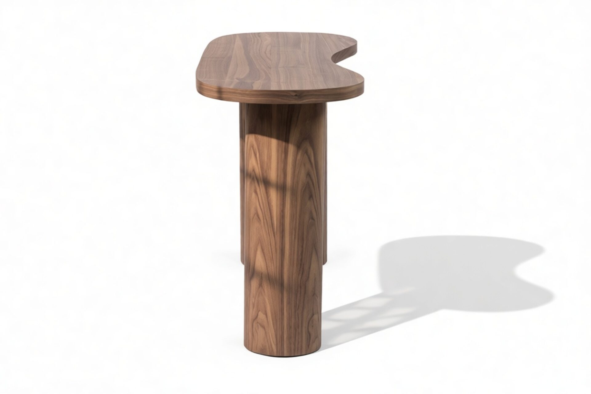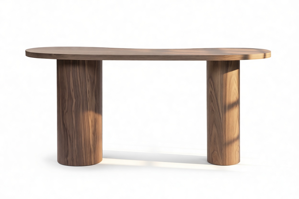 Discover the Centro Console Table, a contemporary masterpiece that seamlessly blends organic forms with minimalist aesthetics. Fashioned from luxurious walnut veneer, its unique kidney-shaped top showcases the natural beauty of the wood grain, offering a cozy and welcoming ambiance. Supported by two striking cylindrical legs, this table strikes a perfect harmony between artistic allure and practical durability, establishing itself as an elegant yet functional centerpiece in any setting.
