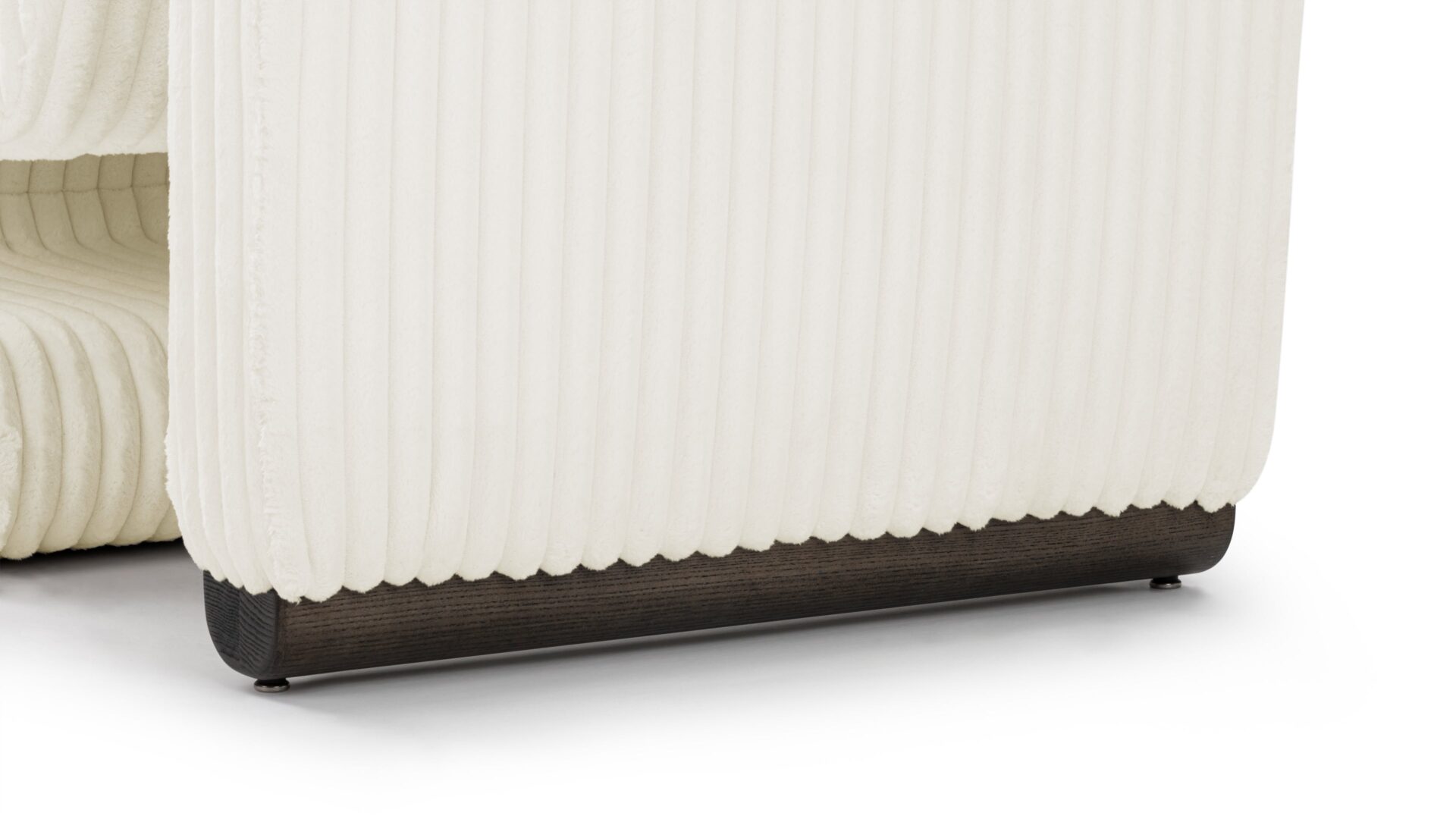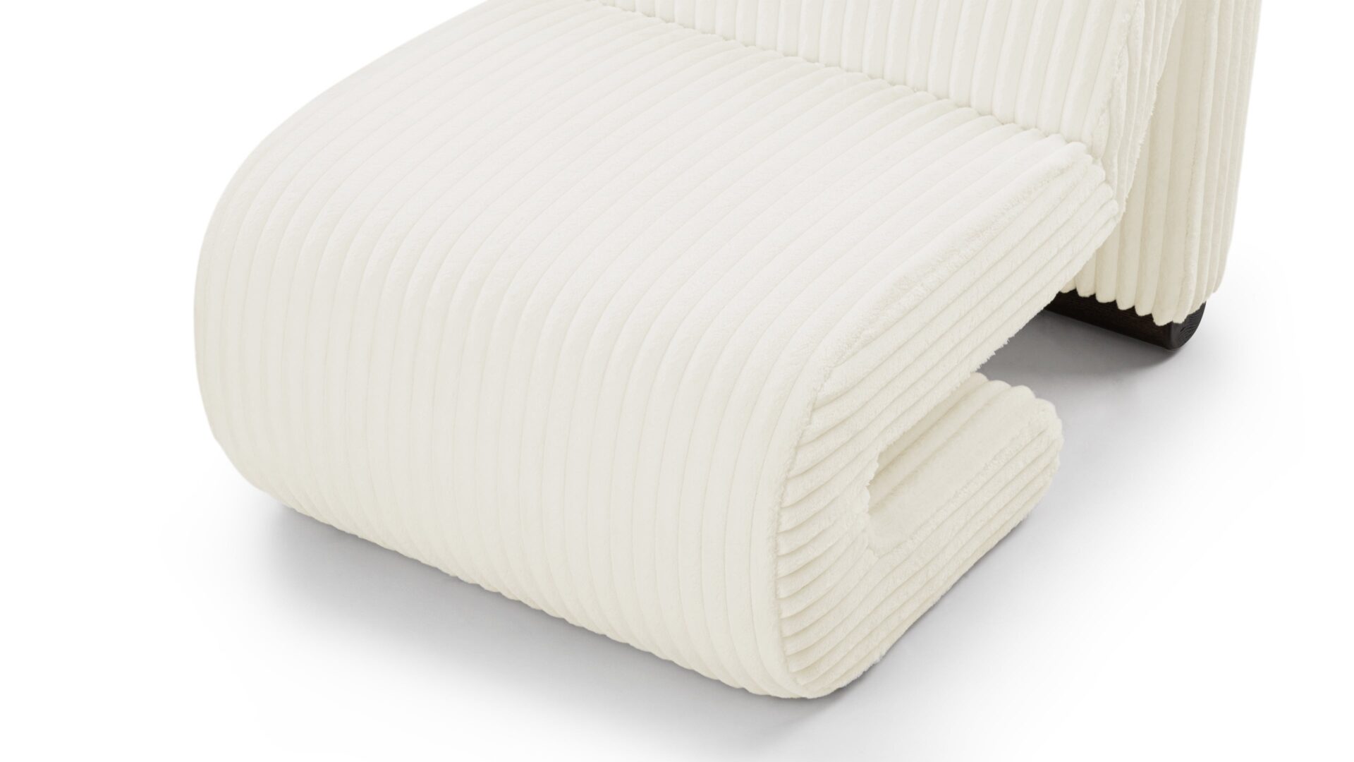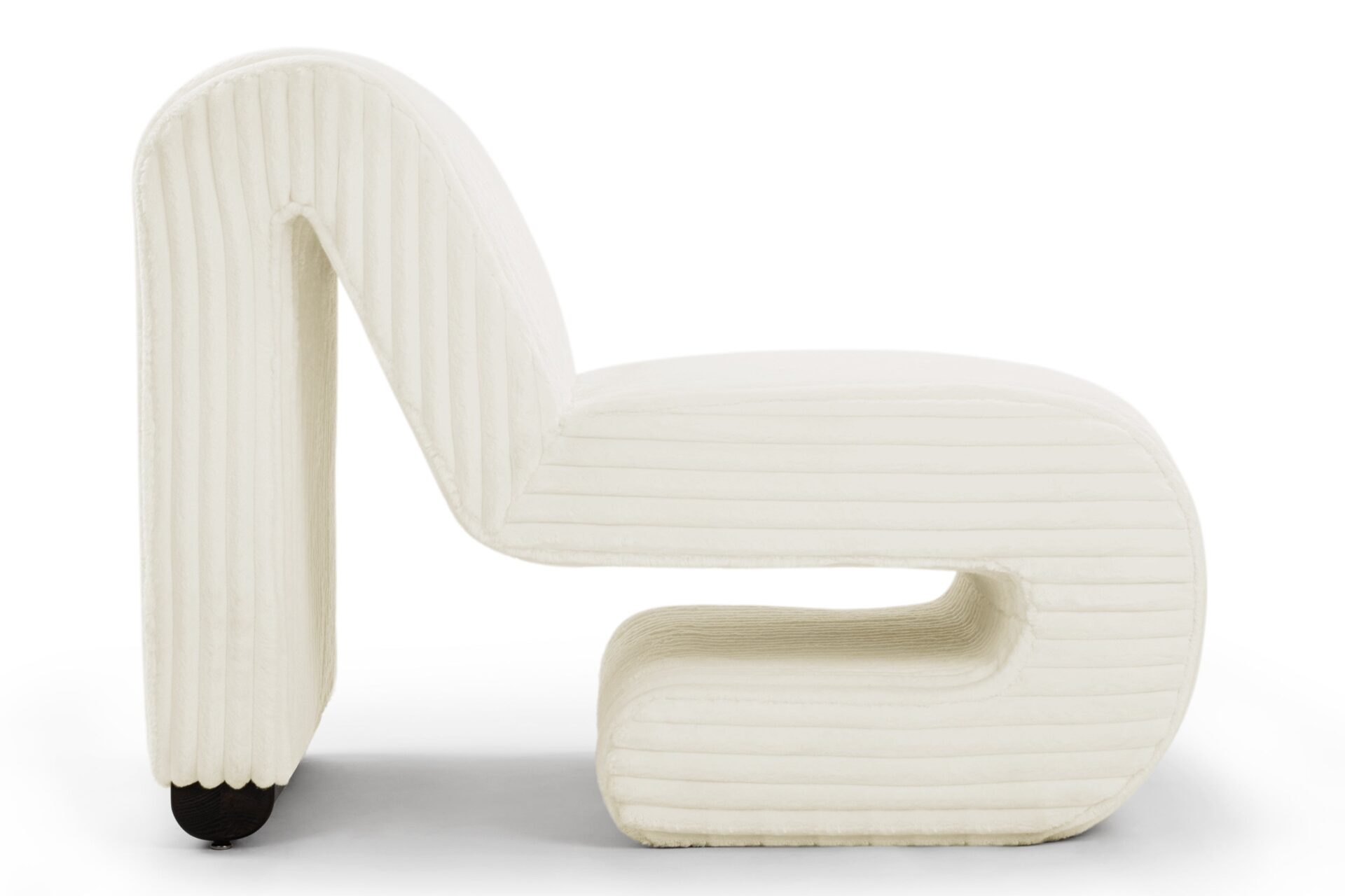 Experience the luxurious comfort of the Ceres Lounge Chair featuring a light-colored faux fur upholstery. The pale fabric elegantly contrasts with the rich, dark walnut foot, resulting in a distinctive and sophisticated appearance. The chair's curved edges and elegant repeating vertical seams create a ribbed profile, enhancing both its visual appeal and comfort.
