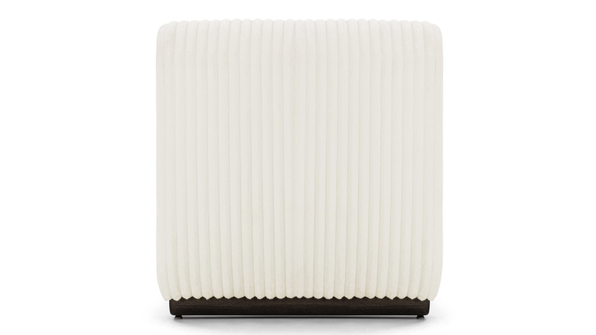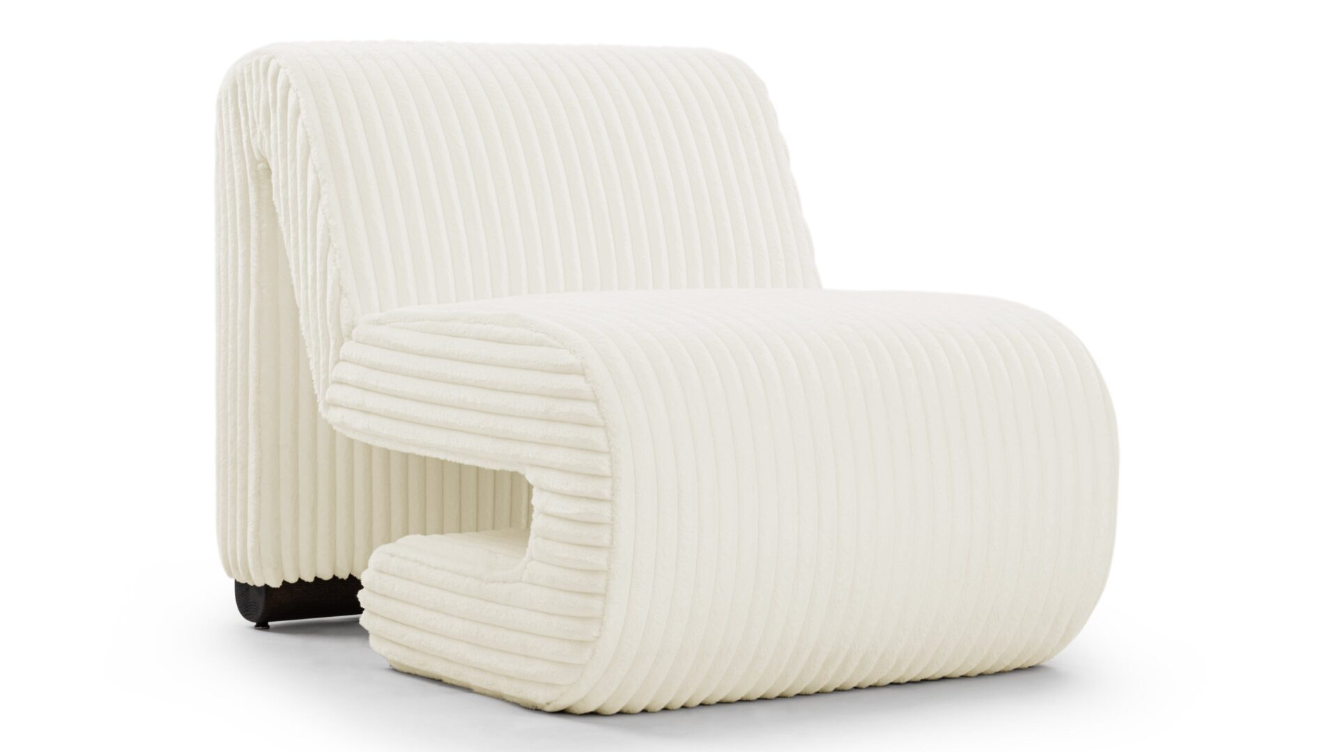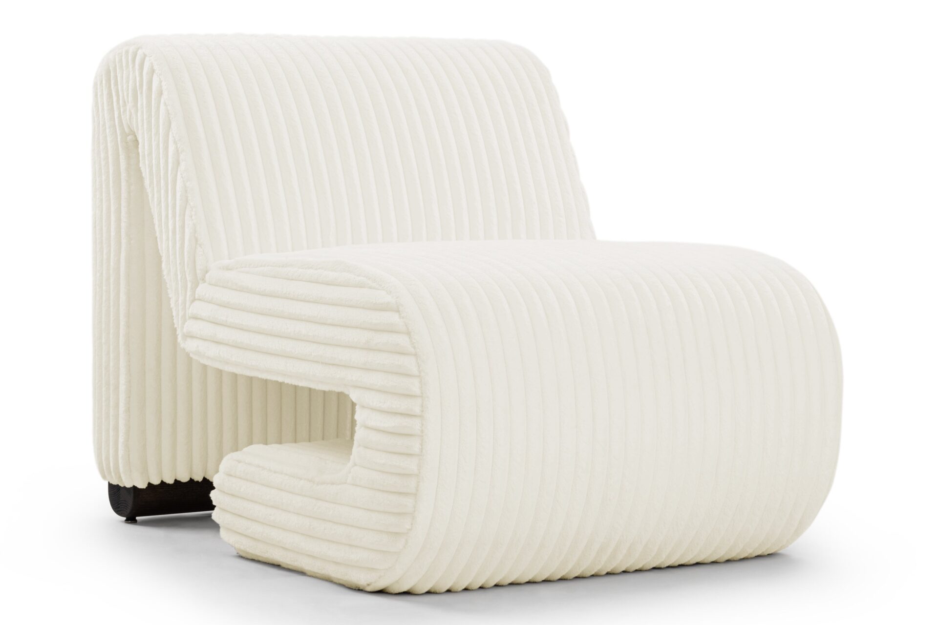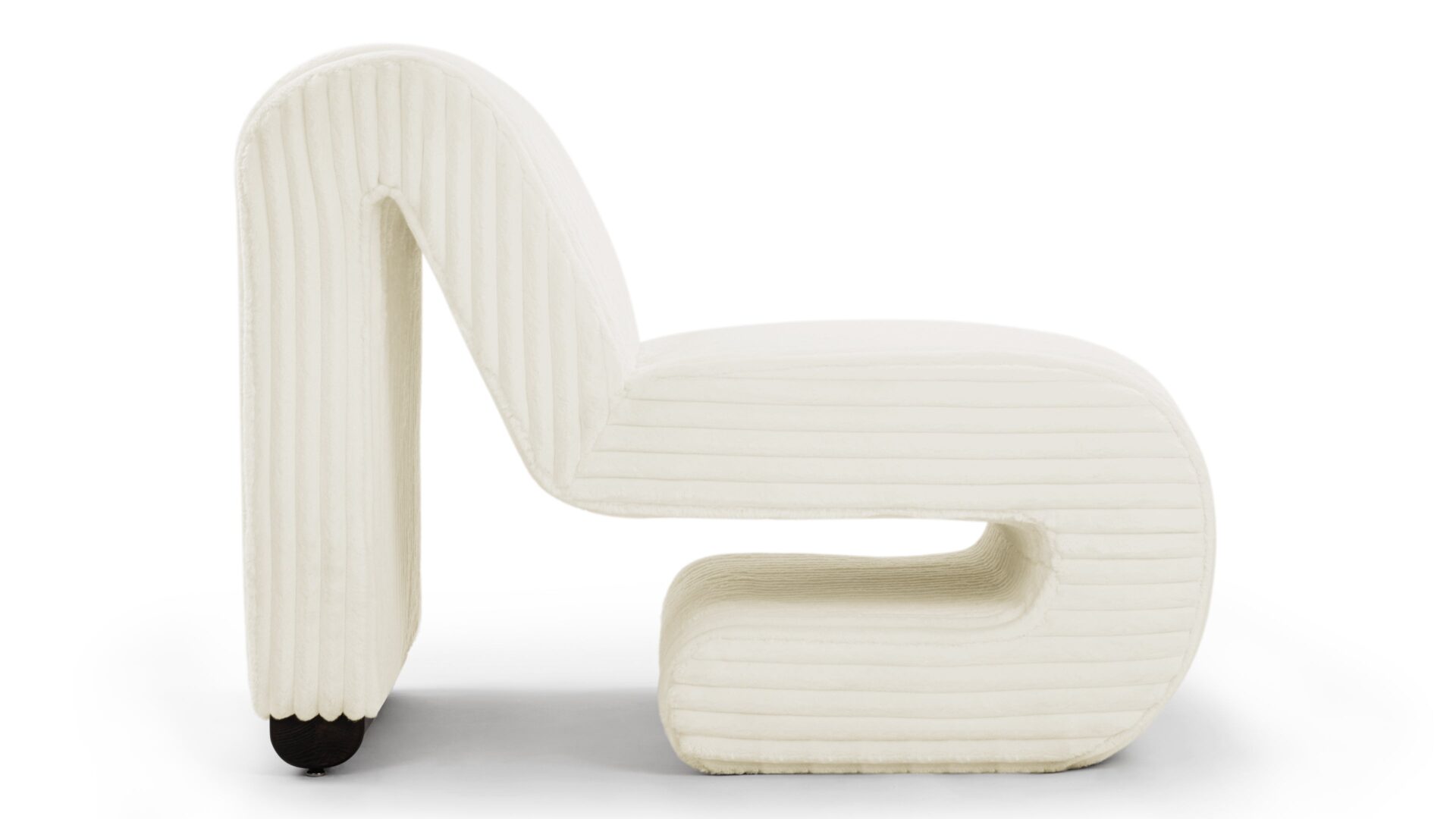 Experience the luxurious comfort of the Ceres Lounge Chair featuring a light-colored faux fur upholstery. The pale fabric elegantly contrasts with the rich, dark walnut foot, resulting in a distinctive and sophisticated appearance. The chair's curved edges and elegant repeating vertical seams create a ribbed profile, enhancing both its visual appeal and comfort.