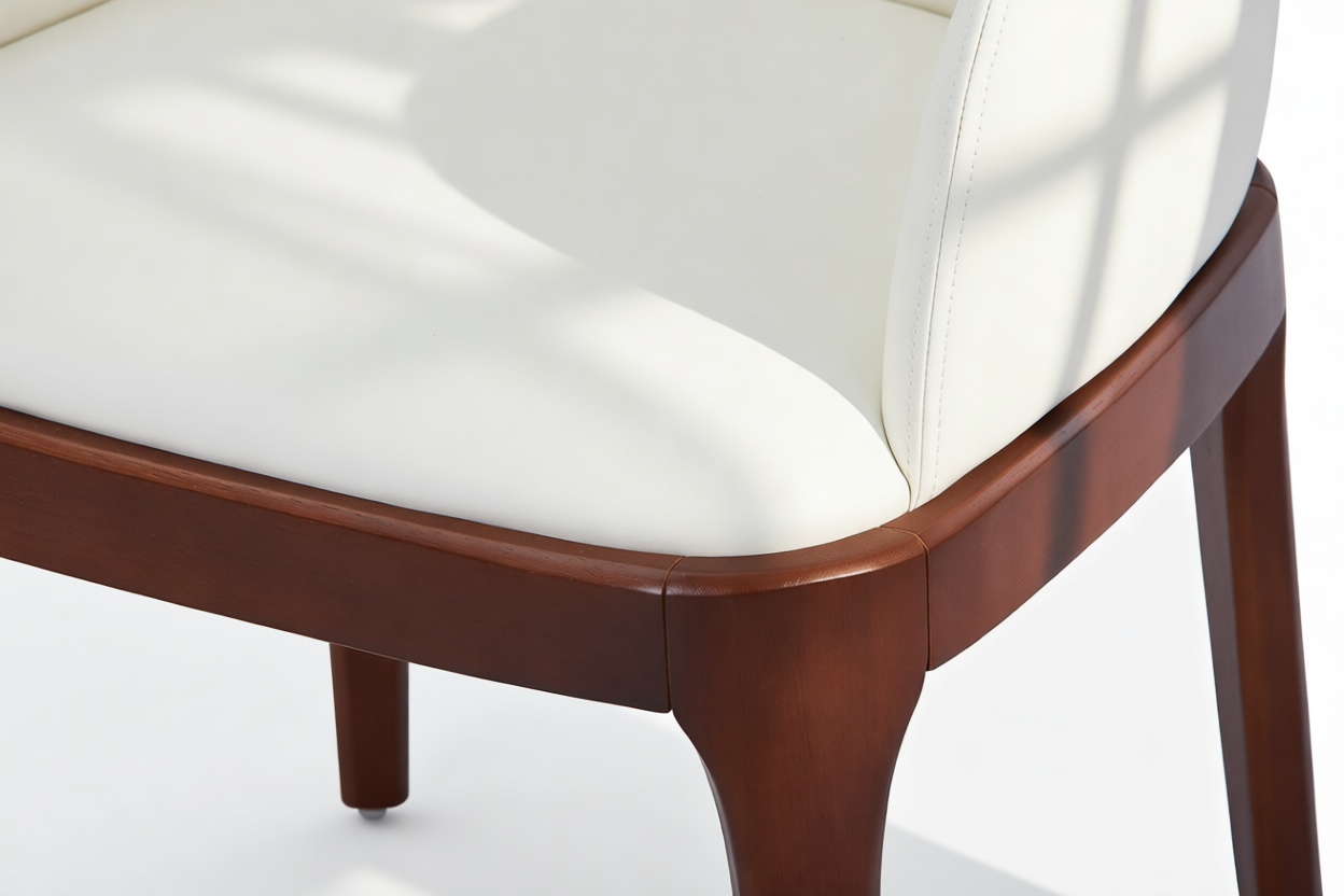 Experience the seamless integration of rich leather upholstery and a durable walnut or oak frame in the chair. This design harmoniously combines the natural warmth of wood with luxurious materials, offering a sophisticated and easy-to-maintain aesthetic.