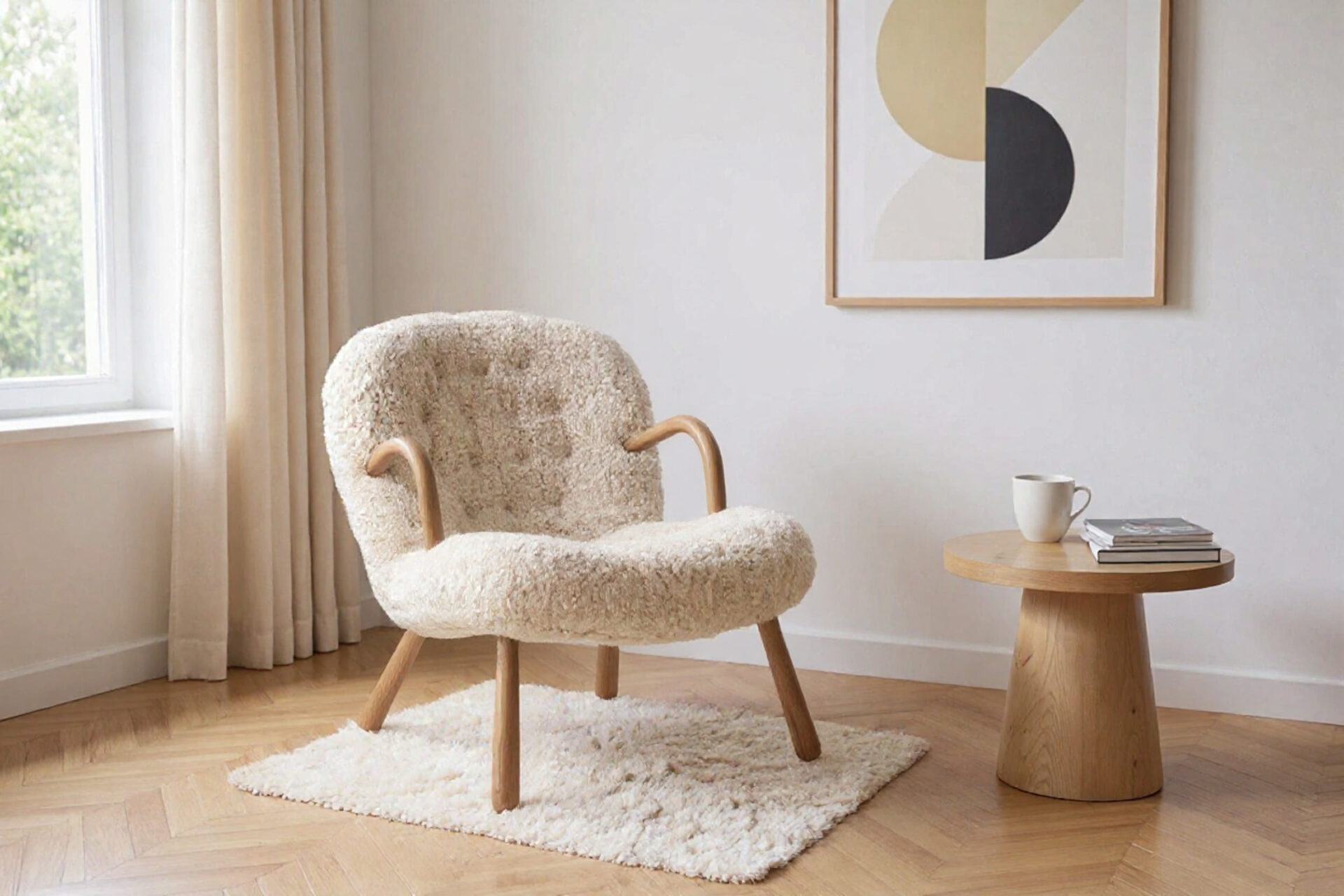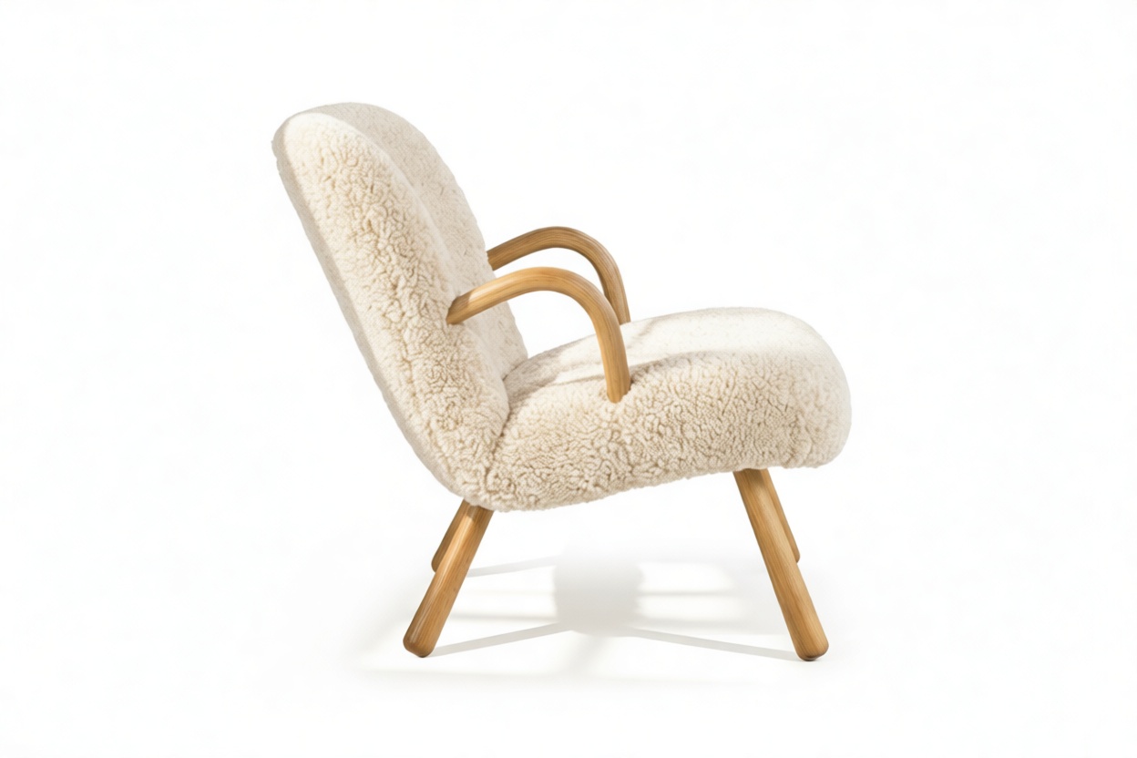 Indulge in the timeless elegance of the Clam Chair, a Danish-inspired design masterpiece from the 1940s that exudes enduring charm, comfort, and craftsmanship. Its inviting curves, luxurious upholstery in Natural Luxe Sheepskin, and sturdy hardwood frame make it a cozy sanctuary for relaxation. Experience Scandinavian style at its finest with this charming chair that promises to enhance any interior with warmth and sophistication.