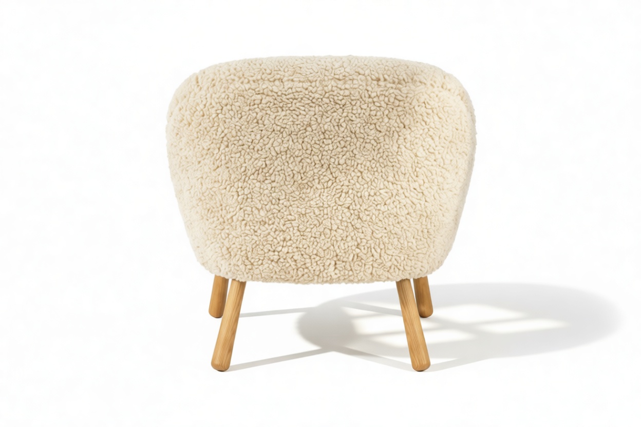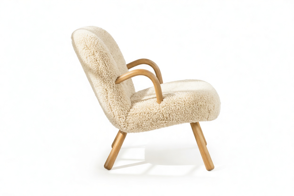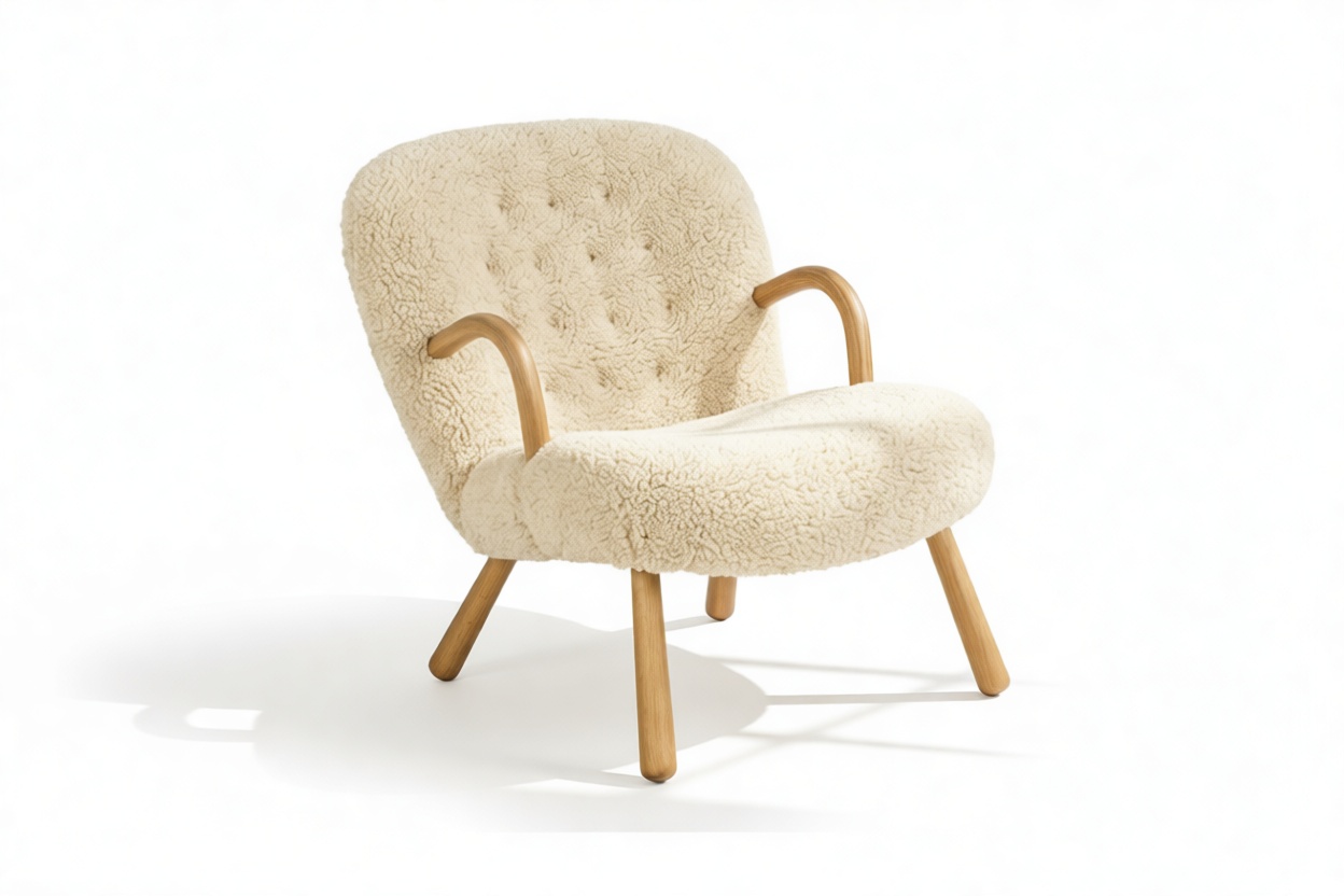 Inspired by iconic Danish design of the 1940s, the Clam Chair exudes timeless elegance and ergonomic comfort. Featuring inviting curves and luxurious White Short Hair Sherpa upholstery, this chair offers a cozy escape at the end of a long day. Constructed with a sturdy hardwood frame and intricate tufting, it guarantees longevity while enhancing interiors with Scandinavian charm.
