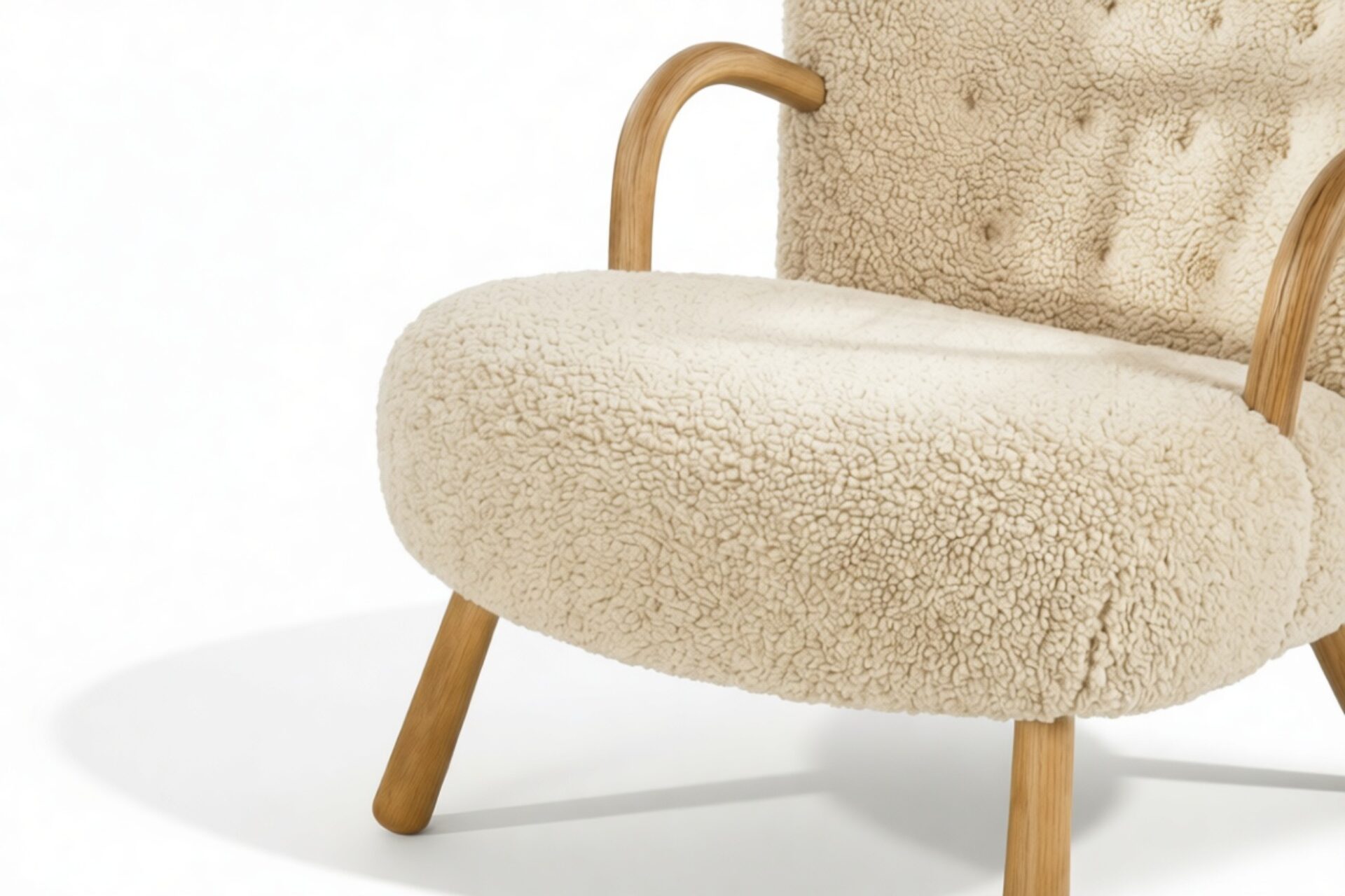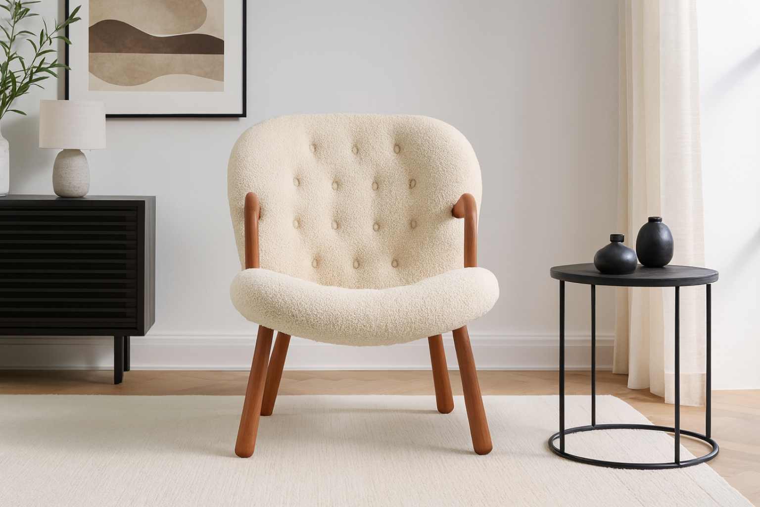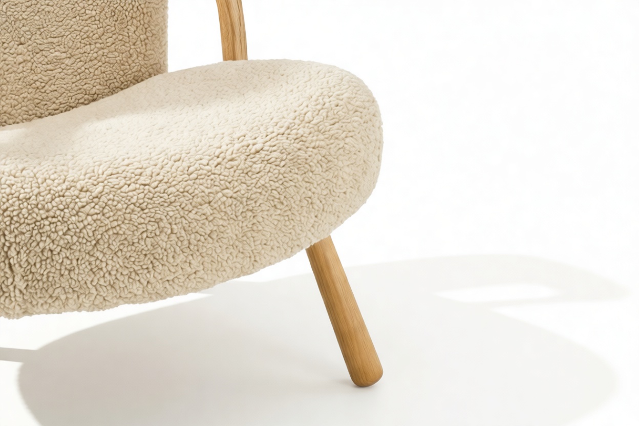 Inspired by iconic Danish design of the 1940s, the Clam Chair exudes timeless elegance and ergonomic comfort. Featuring inviting curves and luxurious White Short Hair Sherpa upholstery, this chair offers a cozy escape at the end of a long day. Constructed with a sturdy hardwood frame and intricate tufting, it guarantees longevity while enhancing interiors with Scandinavian charm.