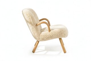 Named for its resemblance to a shell, the Clam chair's charming design pays tribute to Scandinavian style with its sincere and modest use of European hardwood and luxurious upholstery.