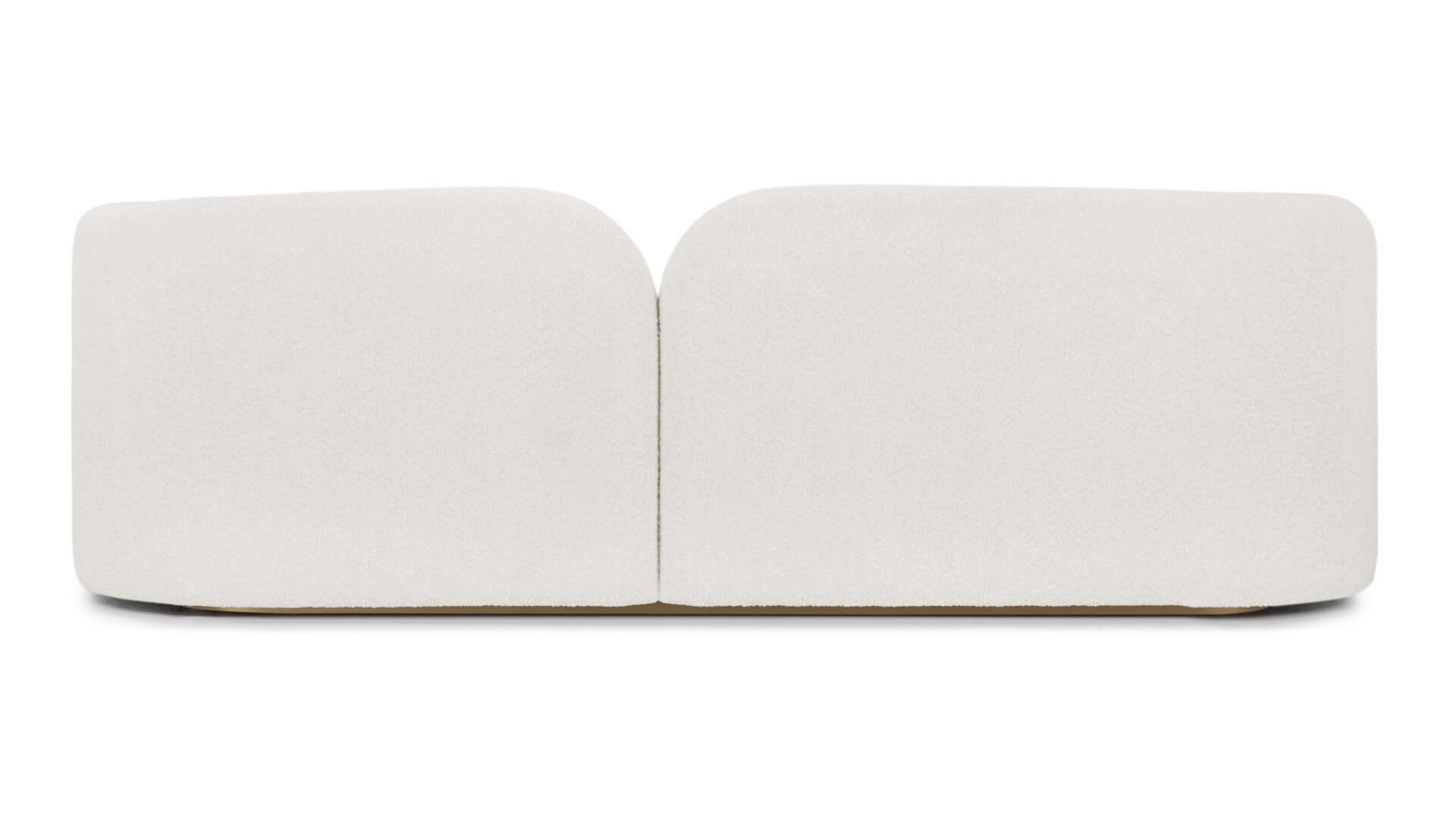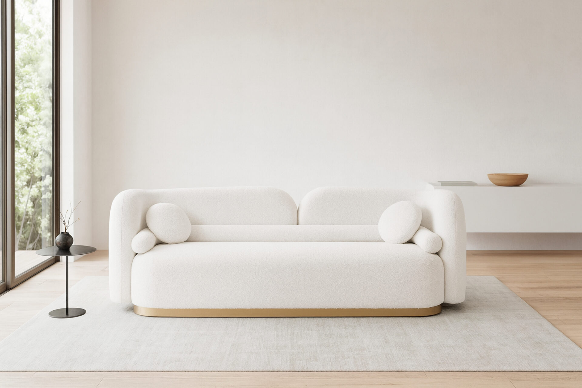 Introducing the Cleo Sofa showcasing soft boucle fabric in a cozy warm white hue, paired with a stunning brass-finished base. This beautifully designed piece effortlessly marries indulgent tactile comfort with elegant metallic details, exuding an aura of refined luxury.