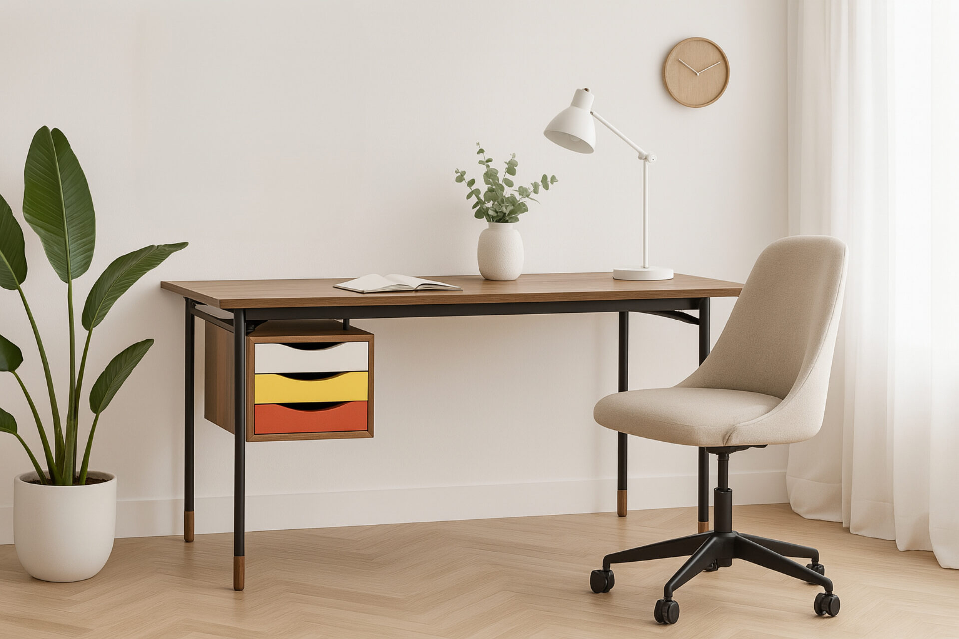 Discover the Coen Desk, an elegant piece showcasing a slender, minimalist outline with sleek lines and delightful details, such as a set of vibrant sliding trays hanging below the surface. This desk serves as a functional base that boosts efficiency, providing both comfort and confidence.