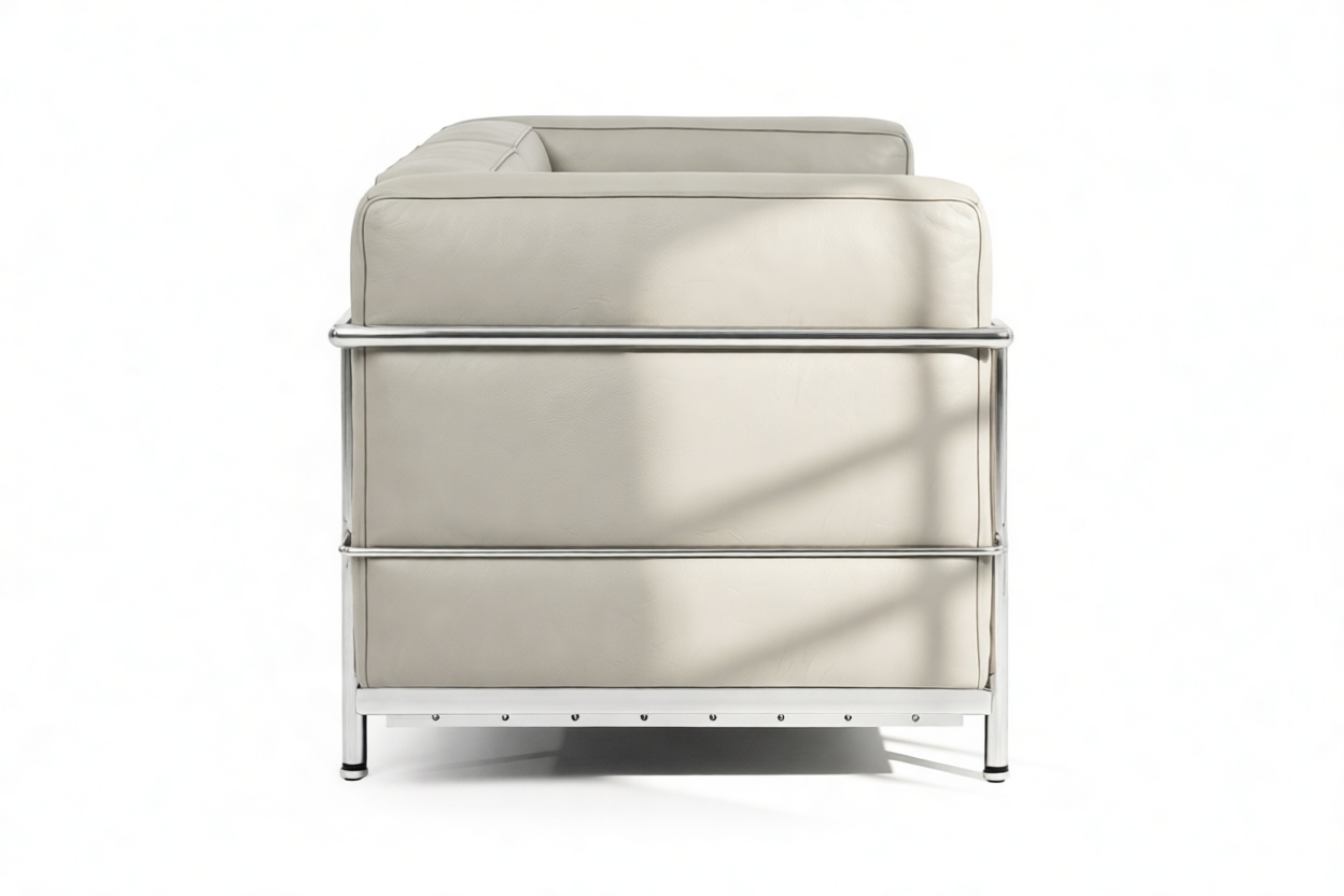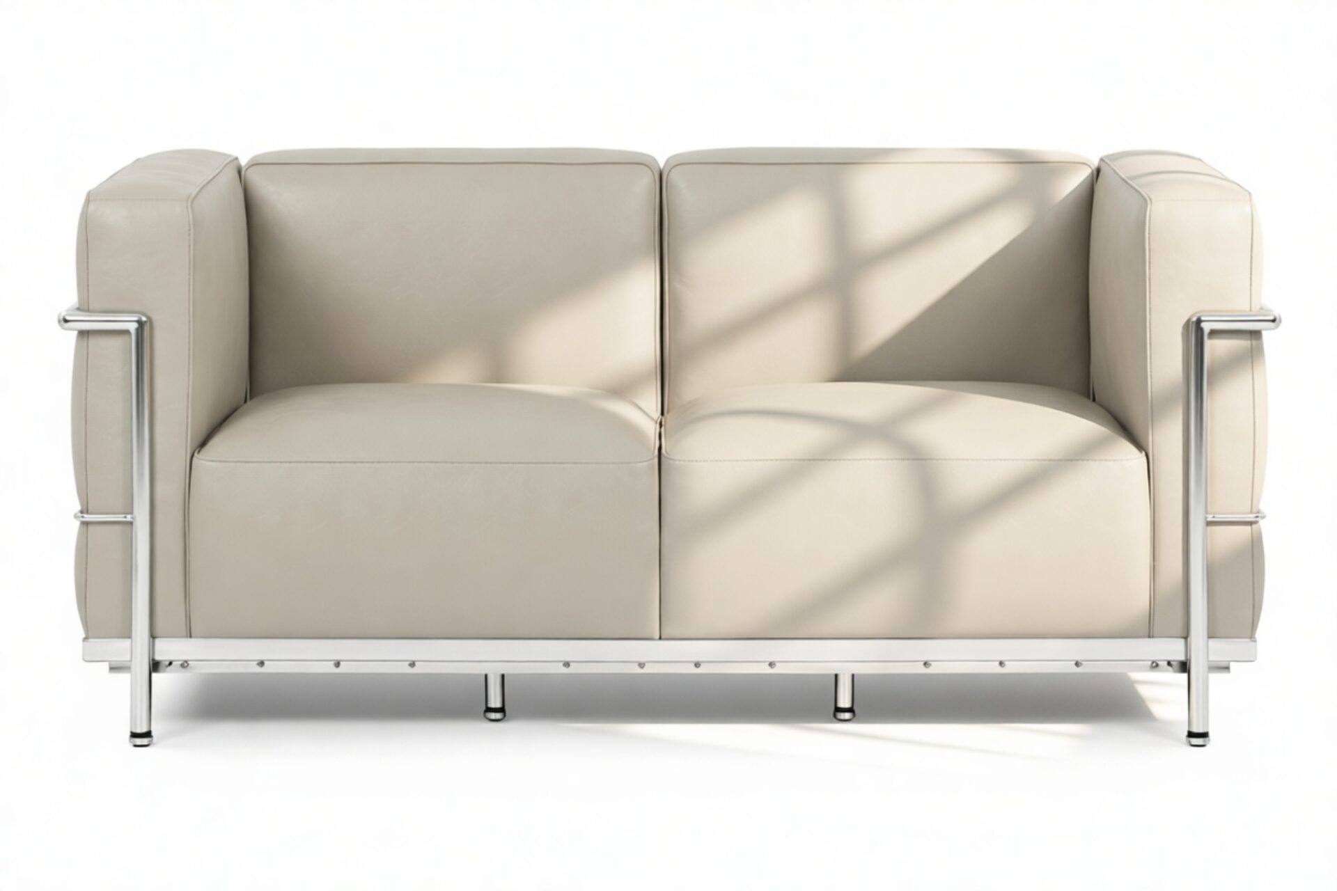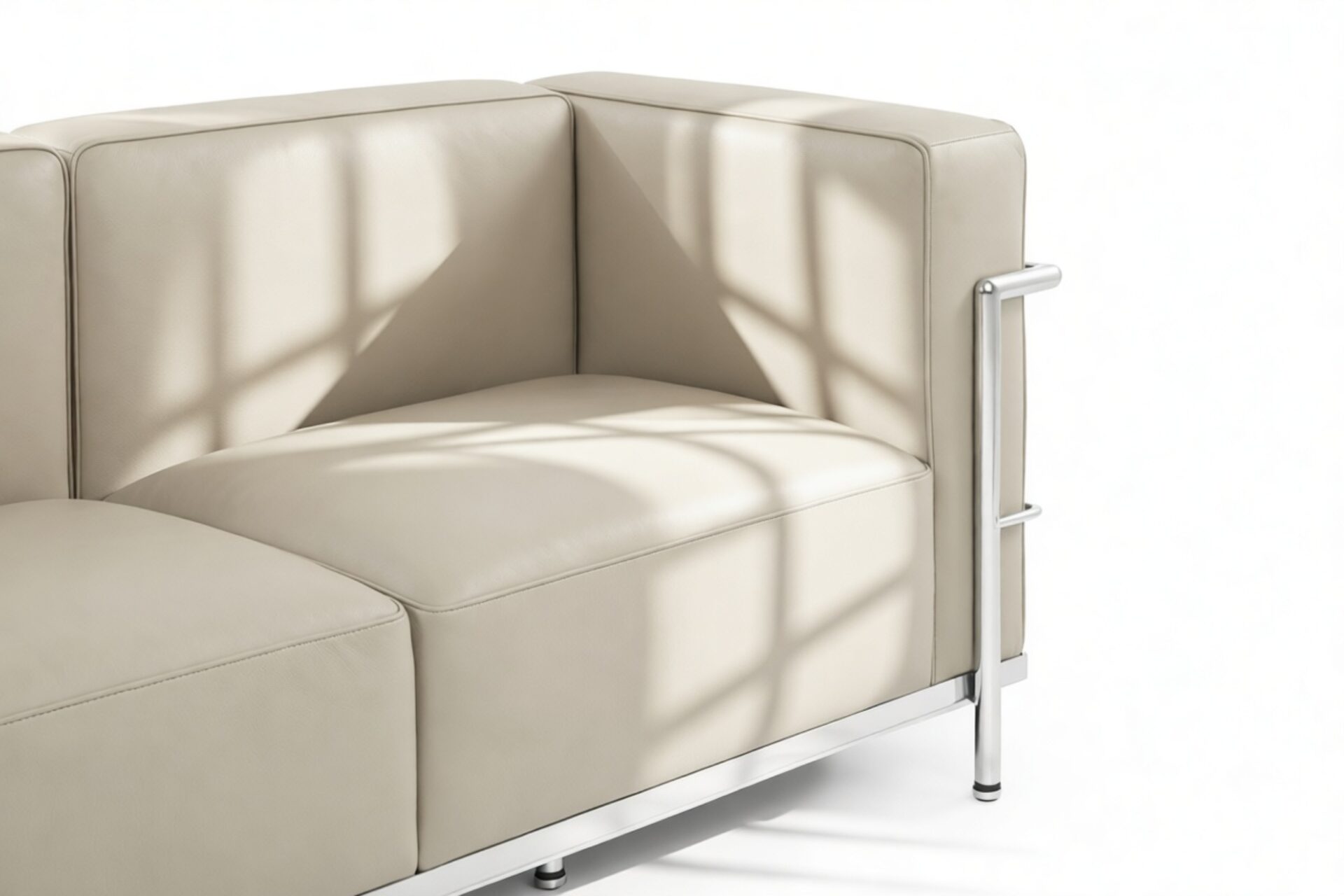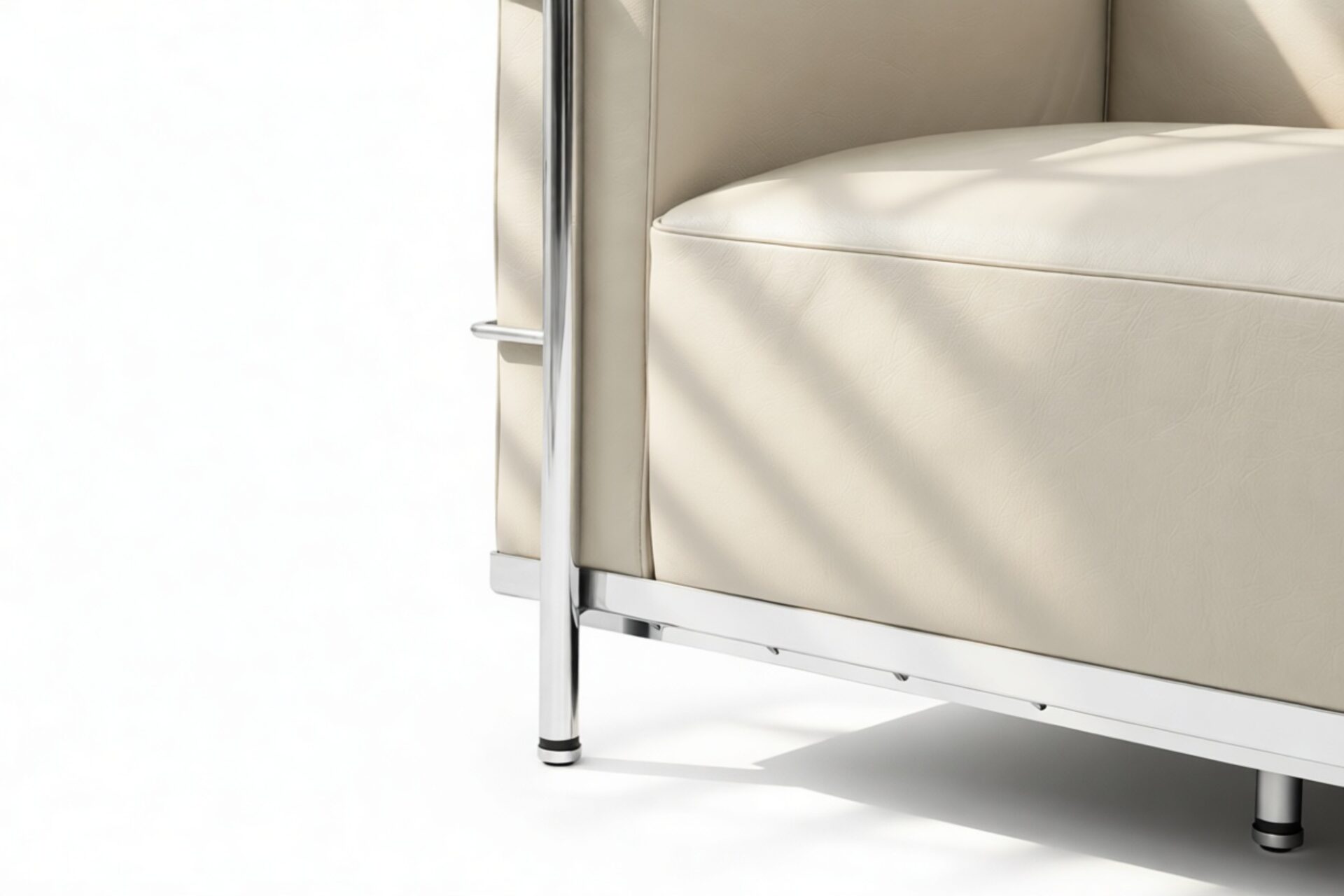 Discover the sophistication of the Grand Modele collection, emphasizing clean lines, geometric shapes, and structural precision. Each piece embodies architectural artistry, blending aesthetics and functionality flawlessly. Experience timeless elegance with the Le Corbusier sofa in Cream Vegan Leather, offering architectural fusion, ultimate comfort, and lasting style. Elevate your living space with iconic designs that redefine contemporary luxury.