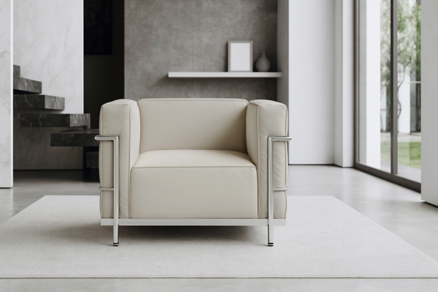 Elevate your living space to new heights with the iconic Le Corbusier chair and the enticing Grand Modele Armchair. The sleek Grand Modele collection merges architectural artistry and functionality effortlessly, boasting sleek lines and geometric shapes. Experience supreme comfort with the pillowy softness of the armchair's Cream Vegan Leather, while the Harmony Sofa artfully combines style and comfort with its minimalist design in the same luxurious material. Redefine contemporary luxury with these iconic pieces.