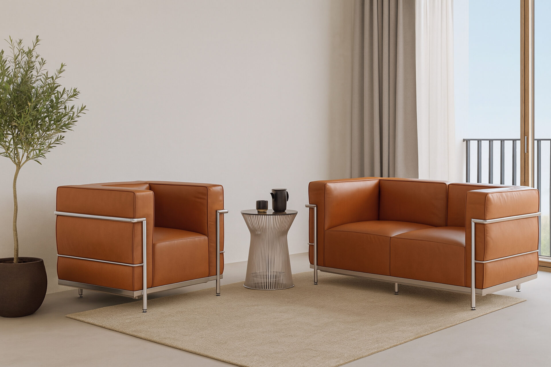 Immerse yourself in the geometric elegance and structural precision of the Grand Modele collection, each piece a masterpiece seamlessly blending beauty and practicality. Elevate your living space with the timeless Le Corbusier chair in Tan Premium Leather, celebrated for its architectural flair, unmatched comfort, and lasting appeal. Experience the modern transformation of the Grand Modele Armchair, boasting a sleek steel frame, and indulge in the plush comfort of its Tan Premium Leather cushions. Lastly, the sleek and minimalist Harmony Sofa in Tan Premium Leather offers a perfect fusion of style and comfort, maximizing visual space while providing exceptional support.