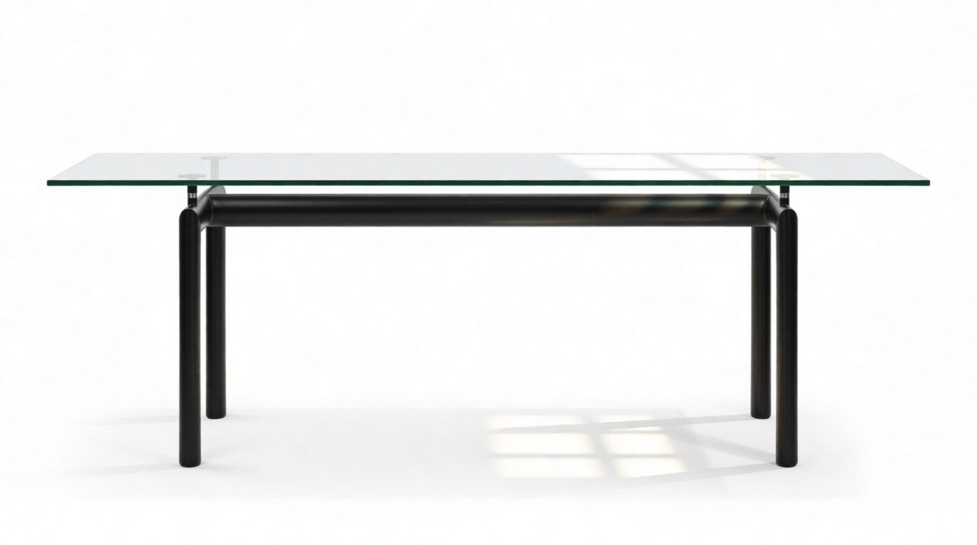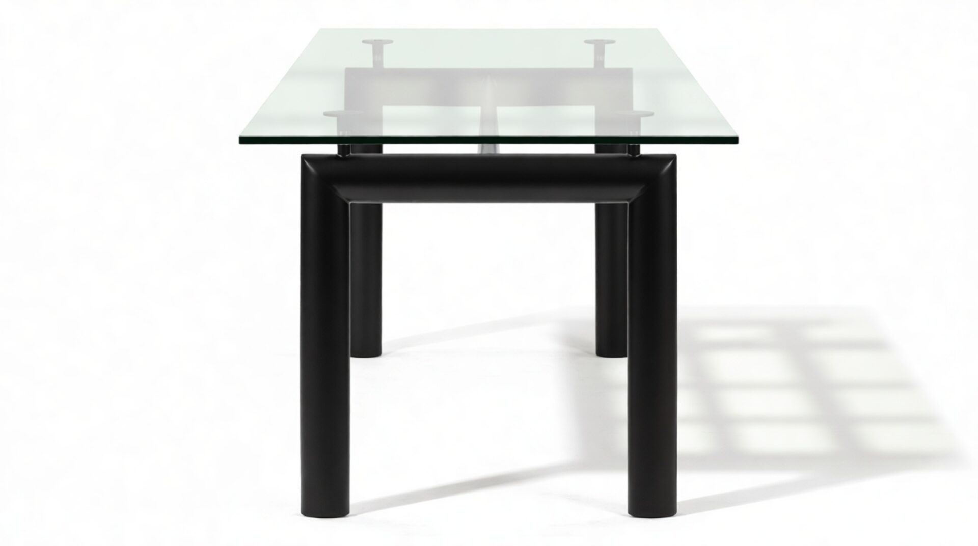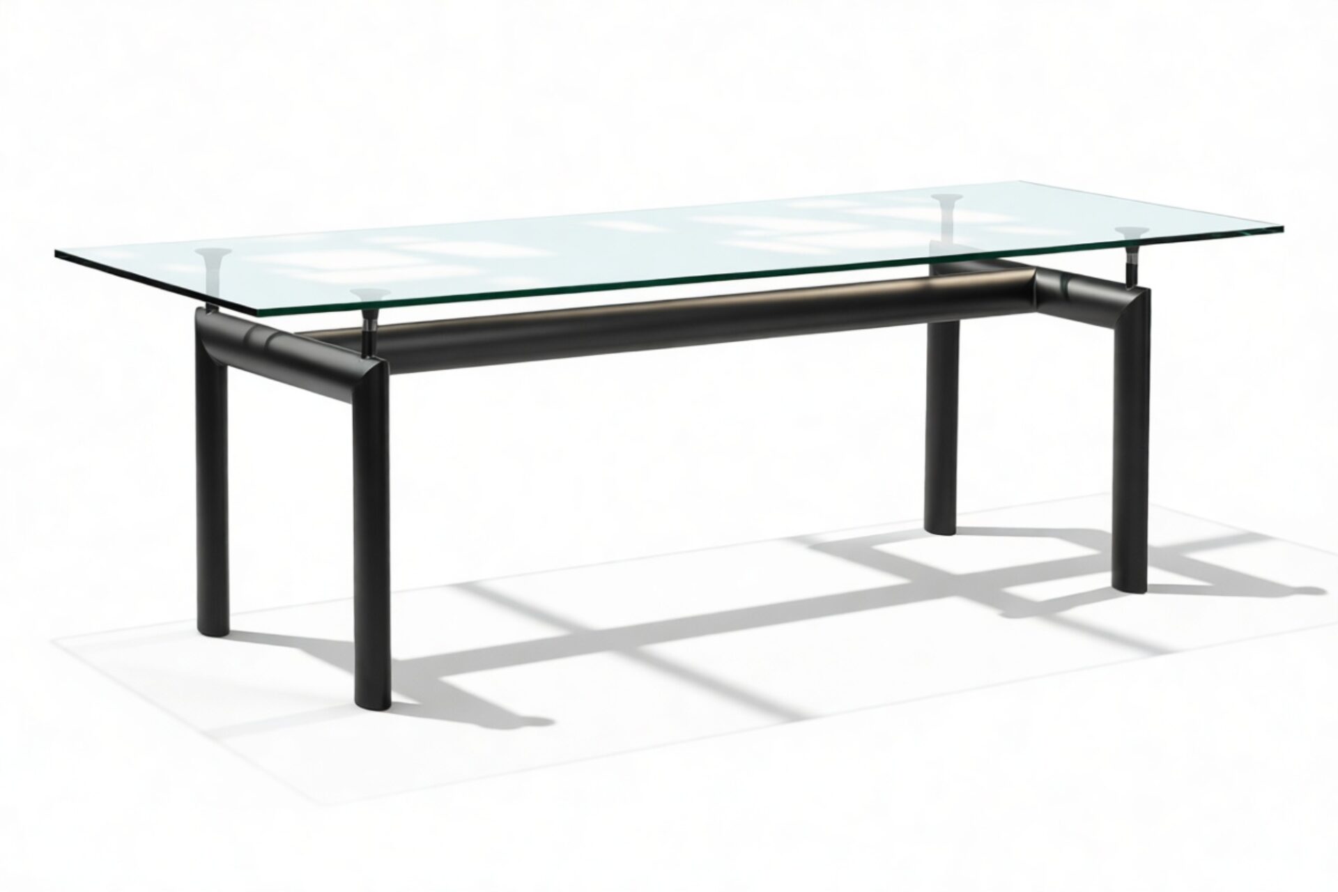Elevate your dining space with the sophisticated Corbusier Dining Table in timeless Black. This iconic piece embodies contemporary elegance and minimalist design ethos, featuring a sturdy tubular steel frame and premium tempered glass tabletop. Crafted with sleek lines and geometric simplicity, it effortlessly enhances any interior decor, making it a valuable investment for your home.
