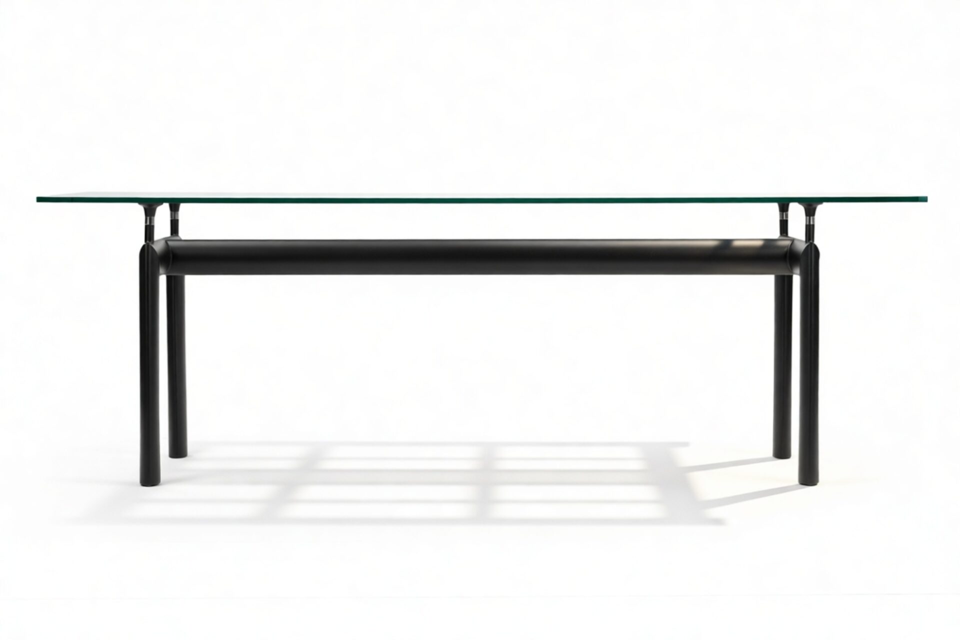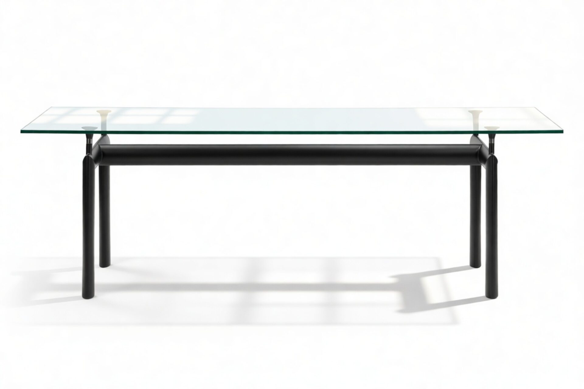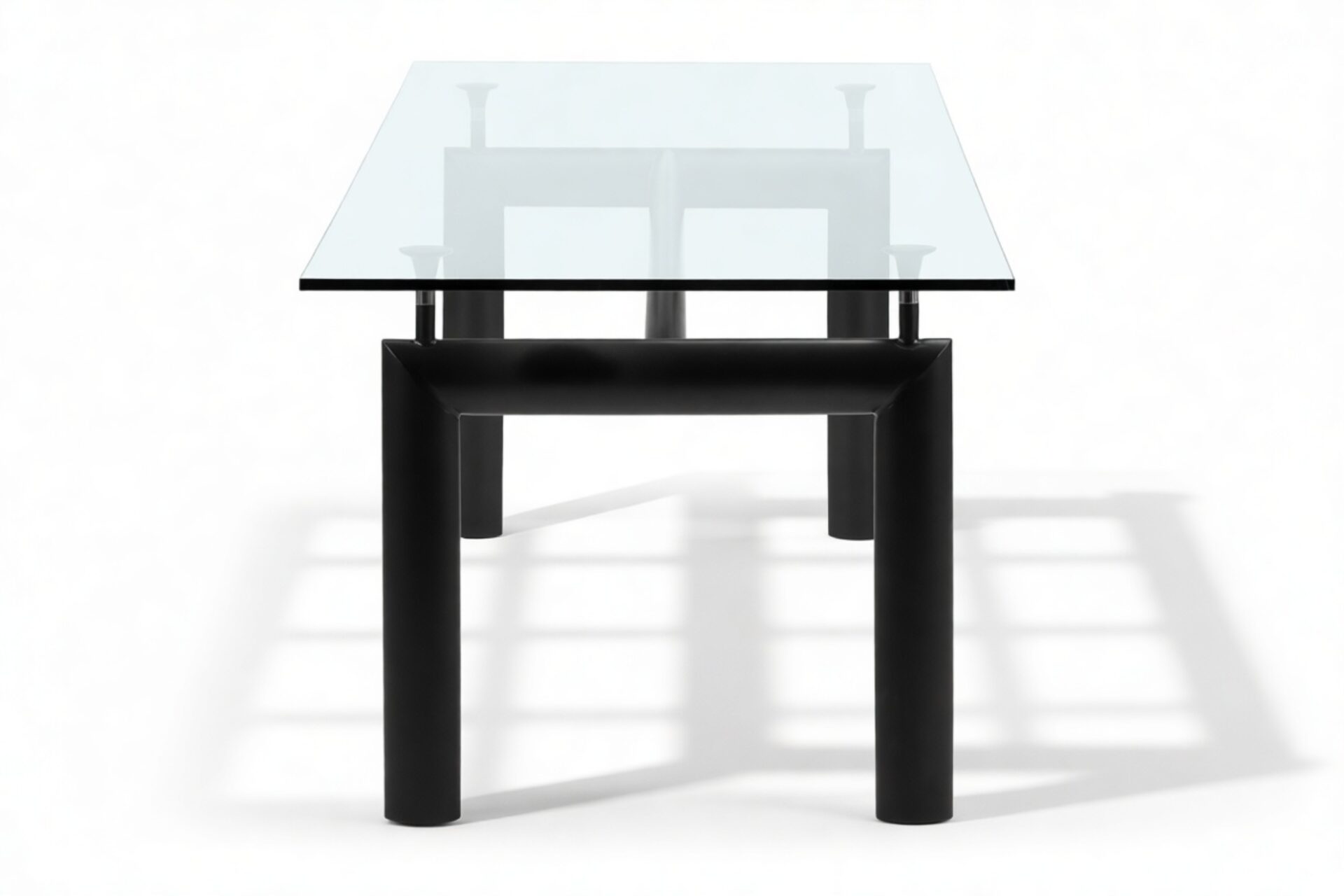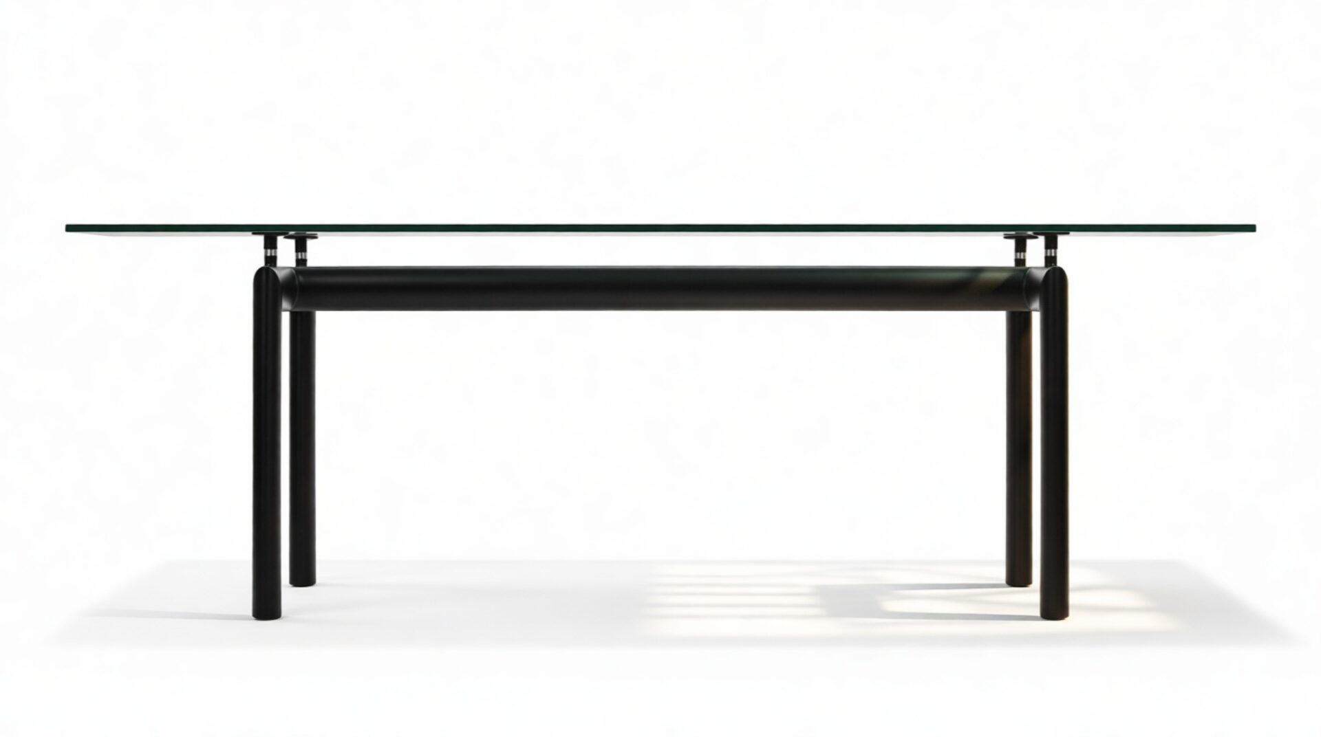 Elevate your dining space with the sophisticated Corbusier Dining Table in timeless Black. This iconic piece embodies contemporary elegance and minimalist design ethos, featuring a sturdy tubular steel frame and premium tempered glass tabletop. Crafted with sleek lines and geometric simplicity, it effortlessly enhances any interior decor, making it a valuable investment for your home.