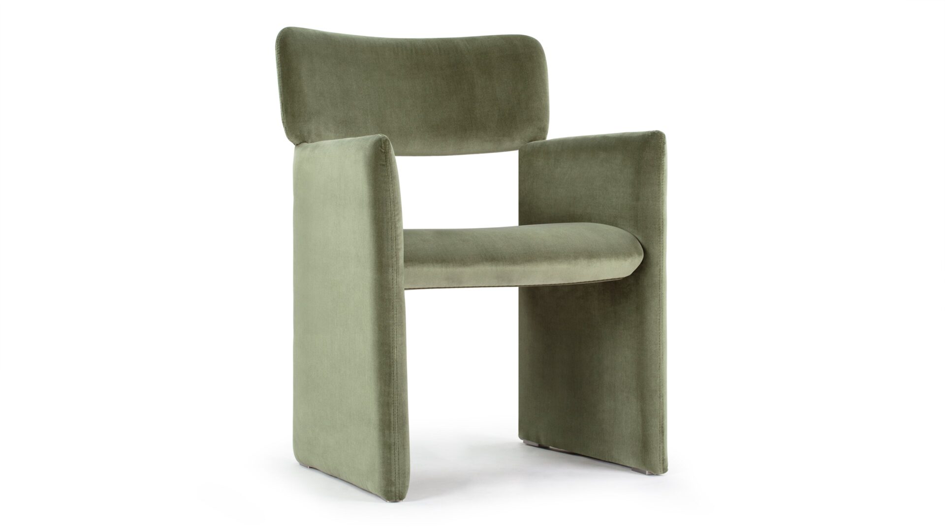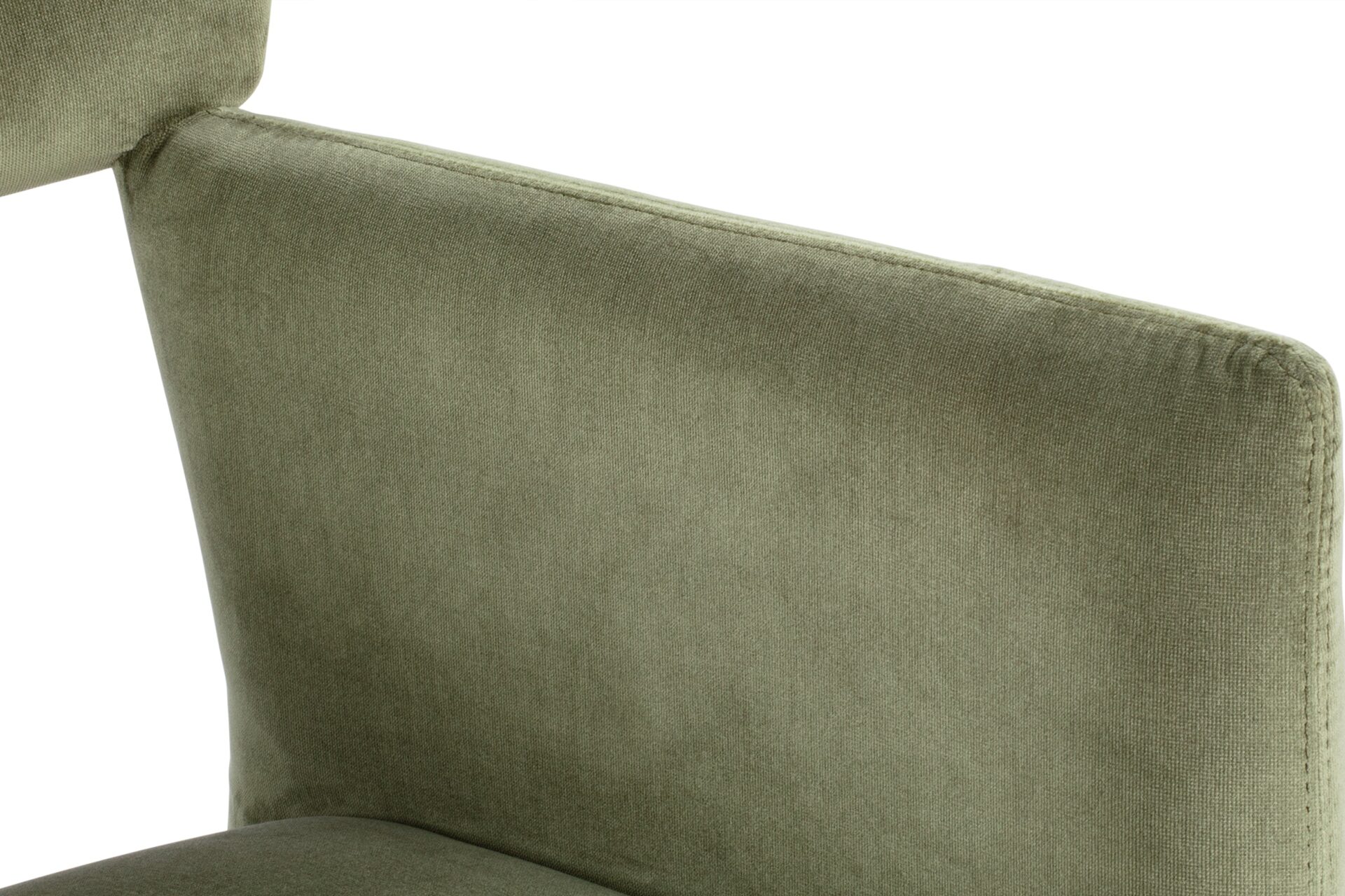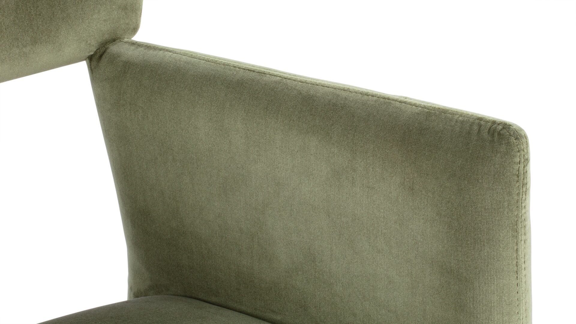 Indulge in the modern elegance of the Crown Armchair, a luxurious masterpiece that exudes regal charm and contemporary coziness. Crafted with precision, this armchair in olive green velvet offers a lavish tactile sensation, elevating any room with its refined allure. Its striking silhouette and impeccable craftsmanship create a focal point of grandeur and refinement, providing supreme comfort and enduring sophistication.