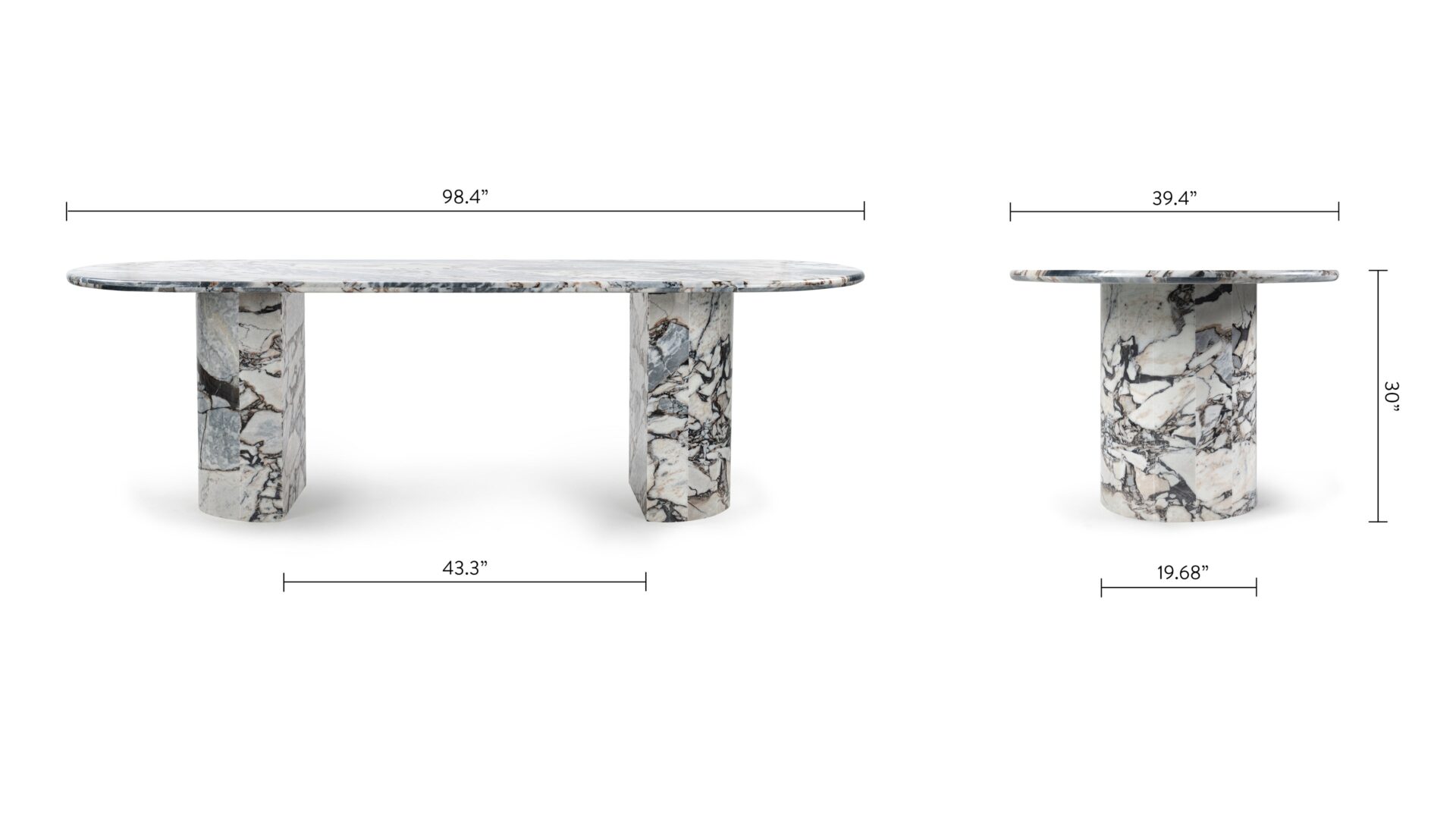 The Dante Dining Table is the perfect choice for spacious dining areas, whether large or open-plan. Representing elegance at its finest, this dining table boasts a sleek and uncluttered design that beautifully complements the luxurious Italian modellato marble it showcases. Featuring a refined polished finish, the marble dining table serves as a remarkable centerpiece for dining and entertaining. Its expansive 98” top is upheld by two half-moon column legs that exude classical architectural charm while embracing a modern and contemporary appeal.