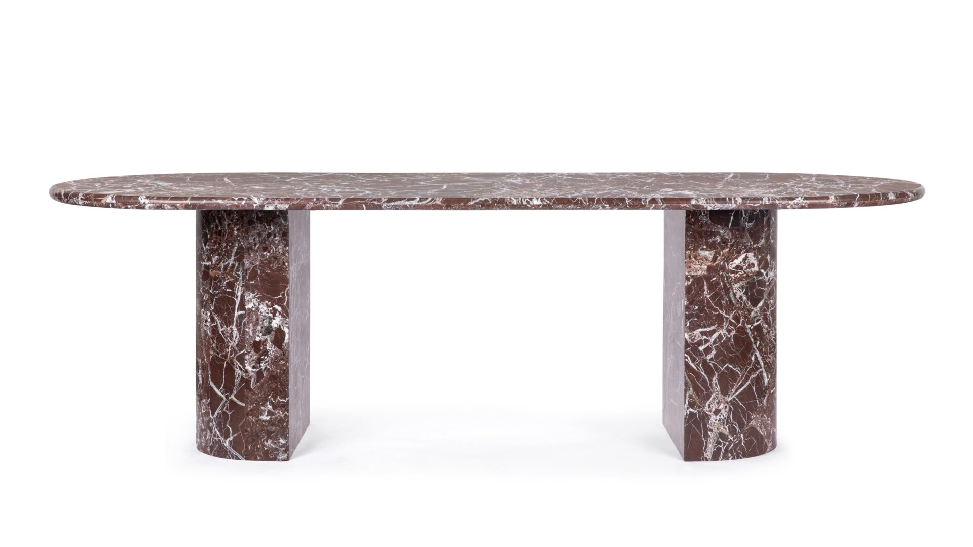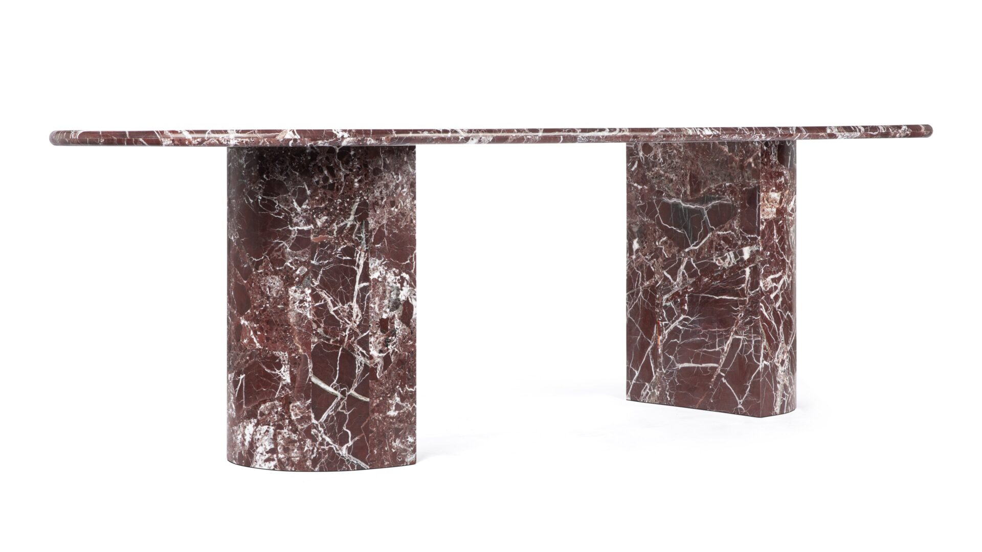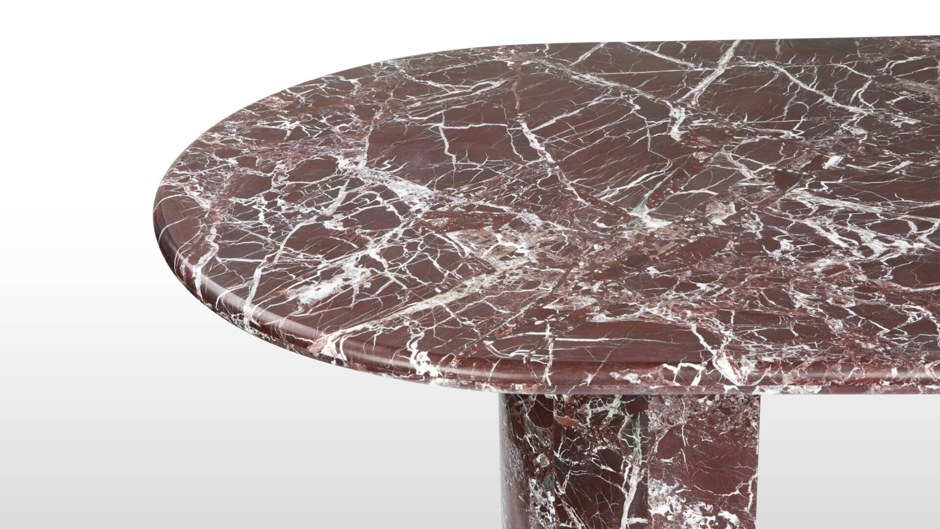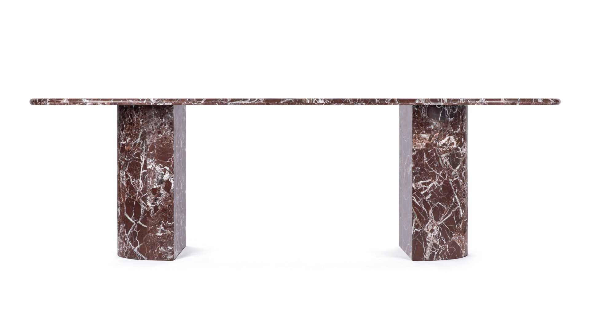Elevate your dining experience with the luxurious Dante dining table, featuring exquisite Rosso Levanto Marble. Standing as the ultimate statement piece, this modern twist on the traditional double pedestal table adds a contemporary touch to upscale interiors. With unique variations in appearance, including distinct color patterns and natural veining, this opulent piece exudes classic elegance redefined for modern living.